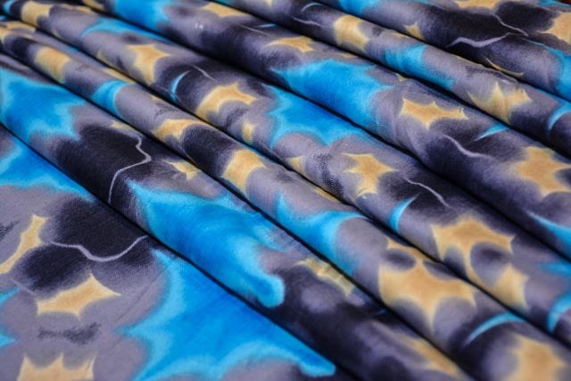 Beautiful star print rayon fabric.Rayon fabric is extremely soft and easy to drape.This is a wrinkle free fabric and not sheer.Grey base has blue star print all over the fabric.