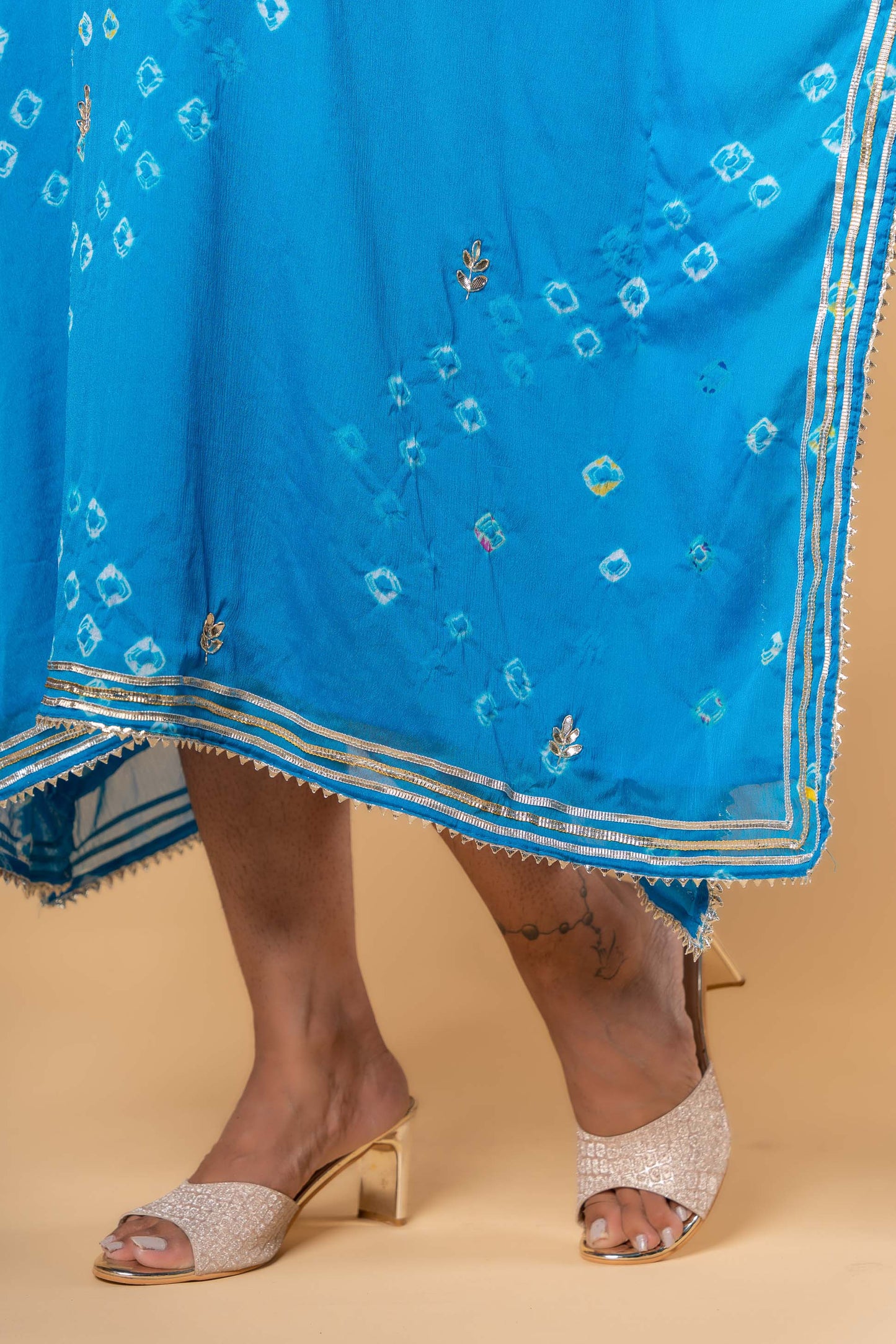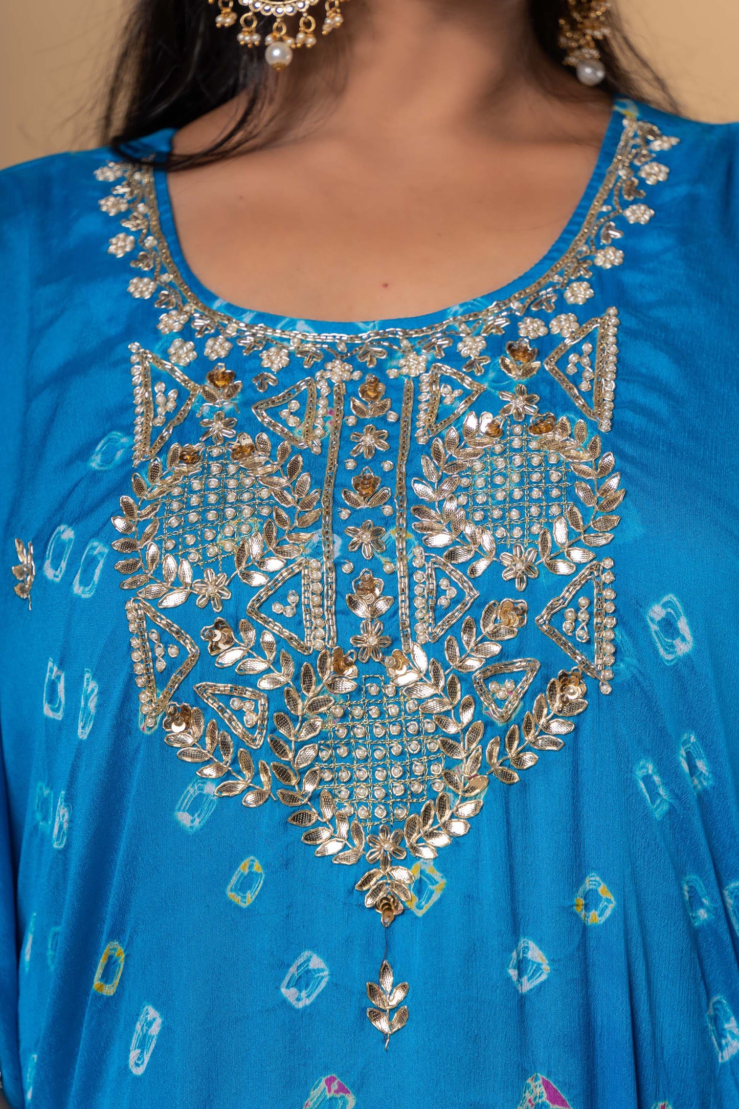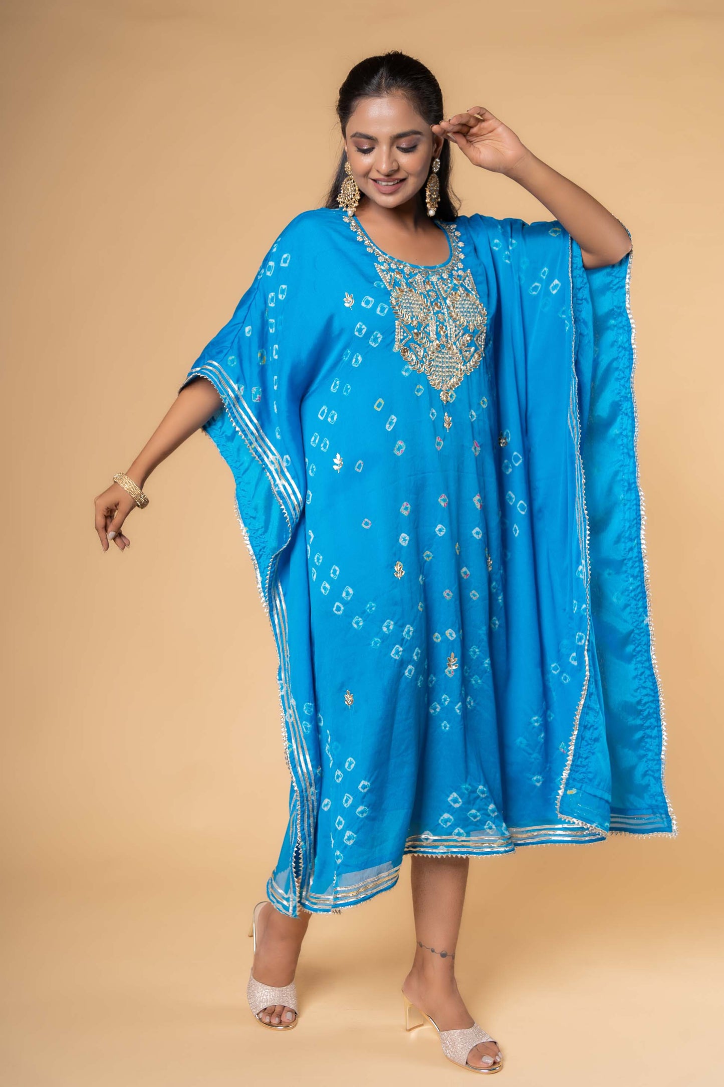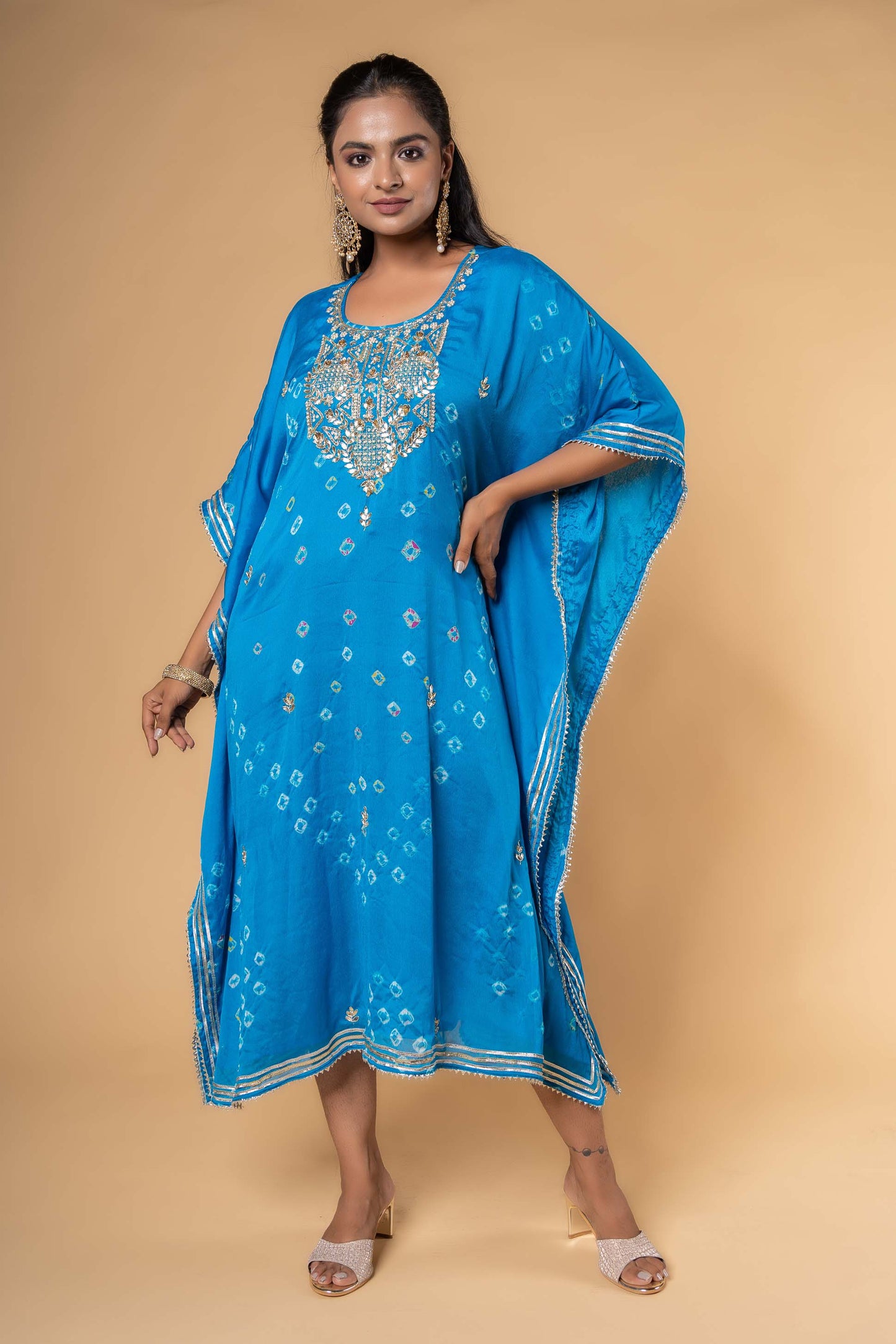 Style yourself with this hand work bright blue bandhej / bandhini viscose crepe kaftan . This kaftan has hand work gotapatti with silver patra work done. The entire kaftan has gota detailing on the edges and margin. Inner lining attached.