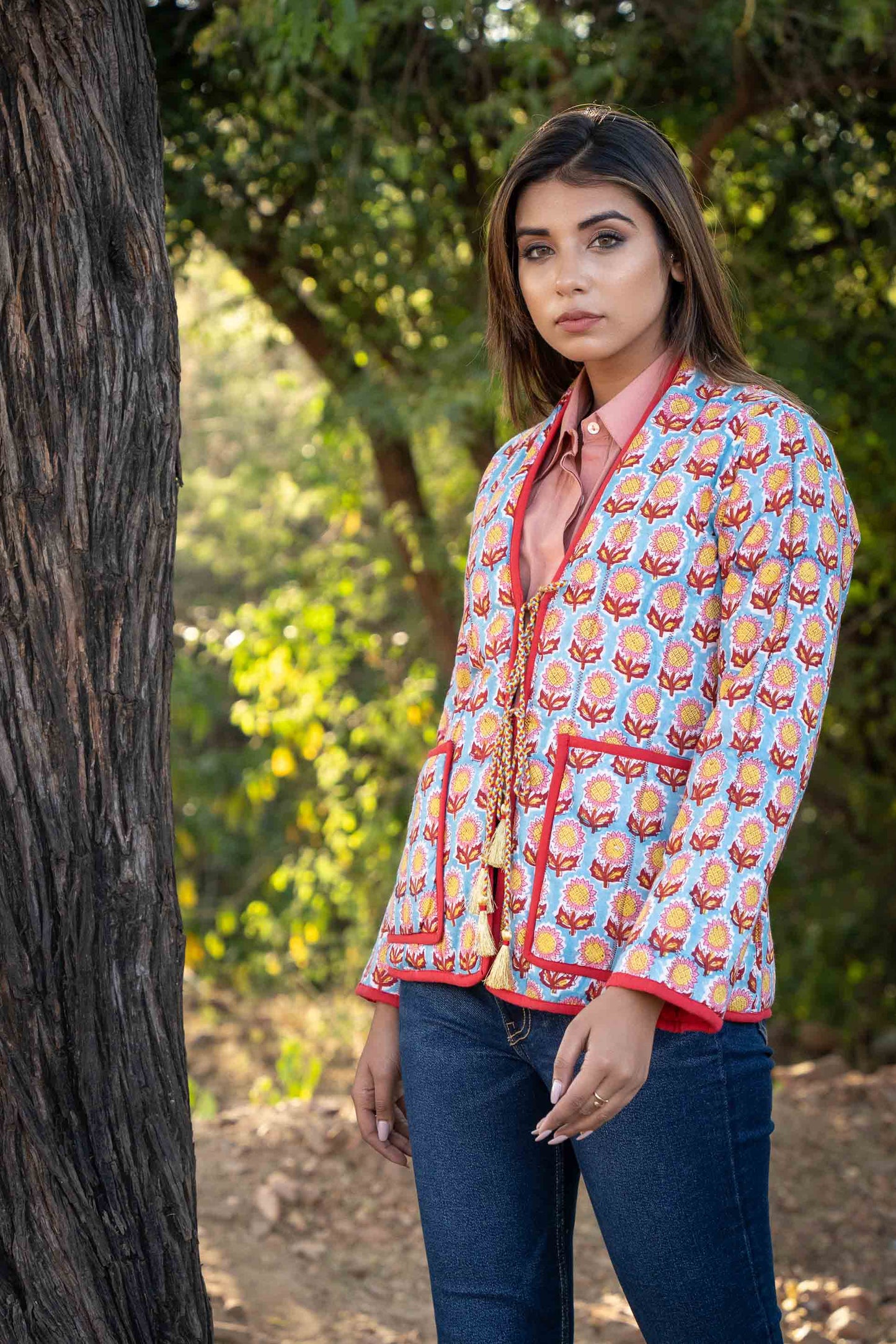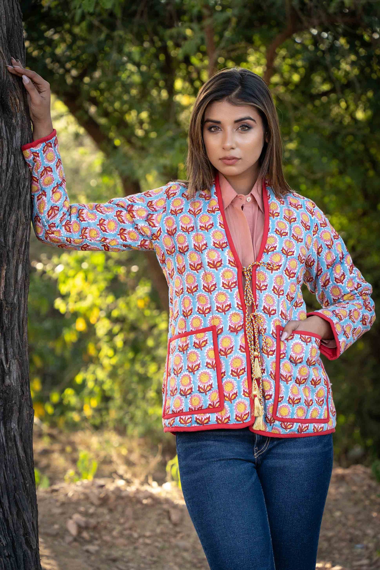 100% Cotton hand block printed puffer jackets with front pockets and tassels dori to tie making it a perfect choice for the winter season.