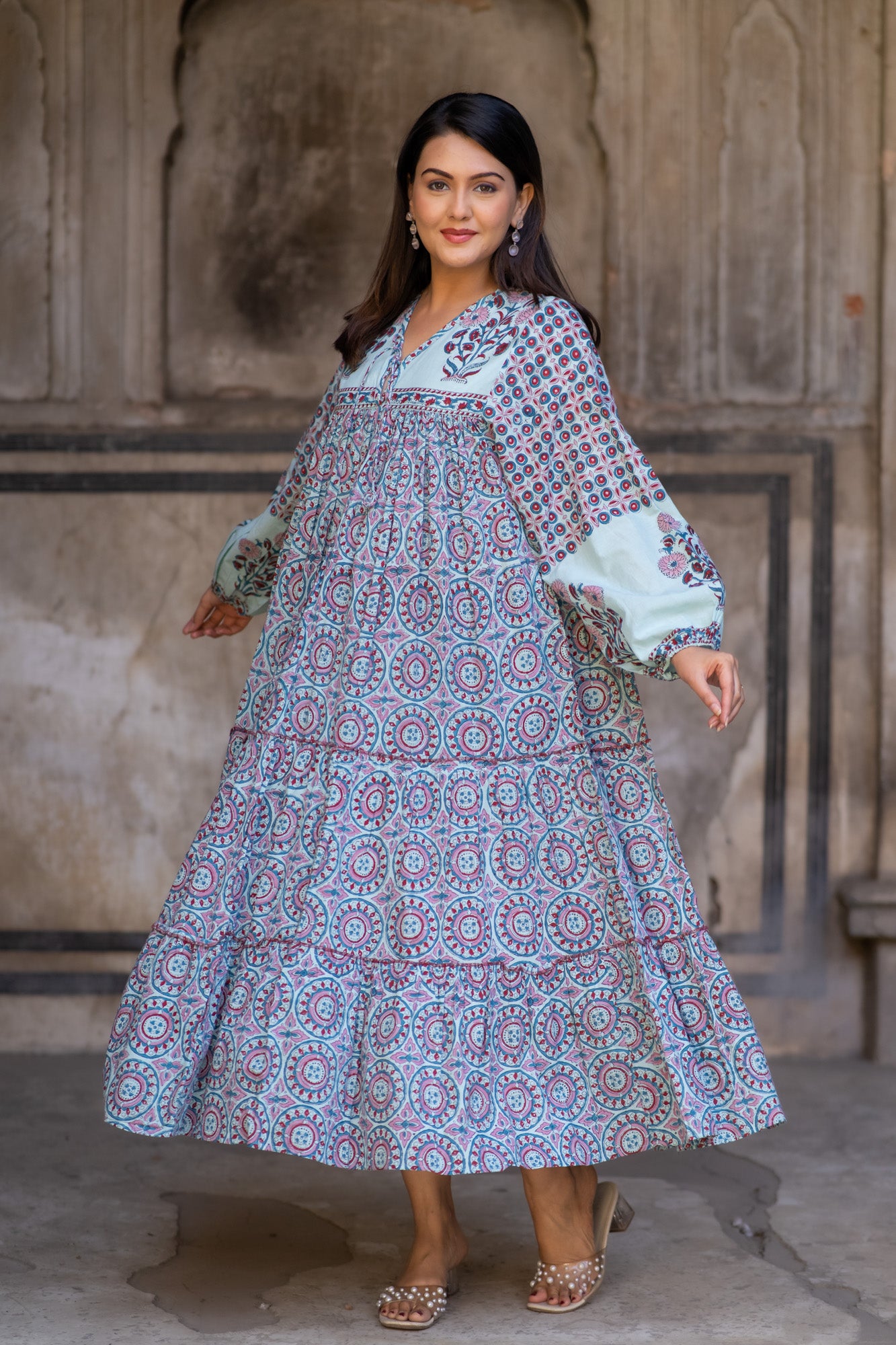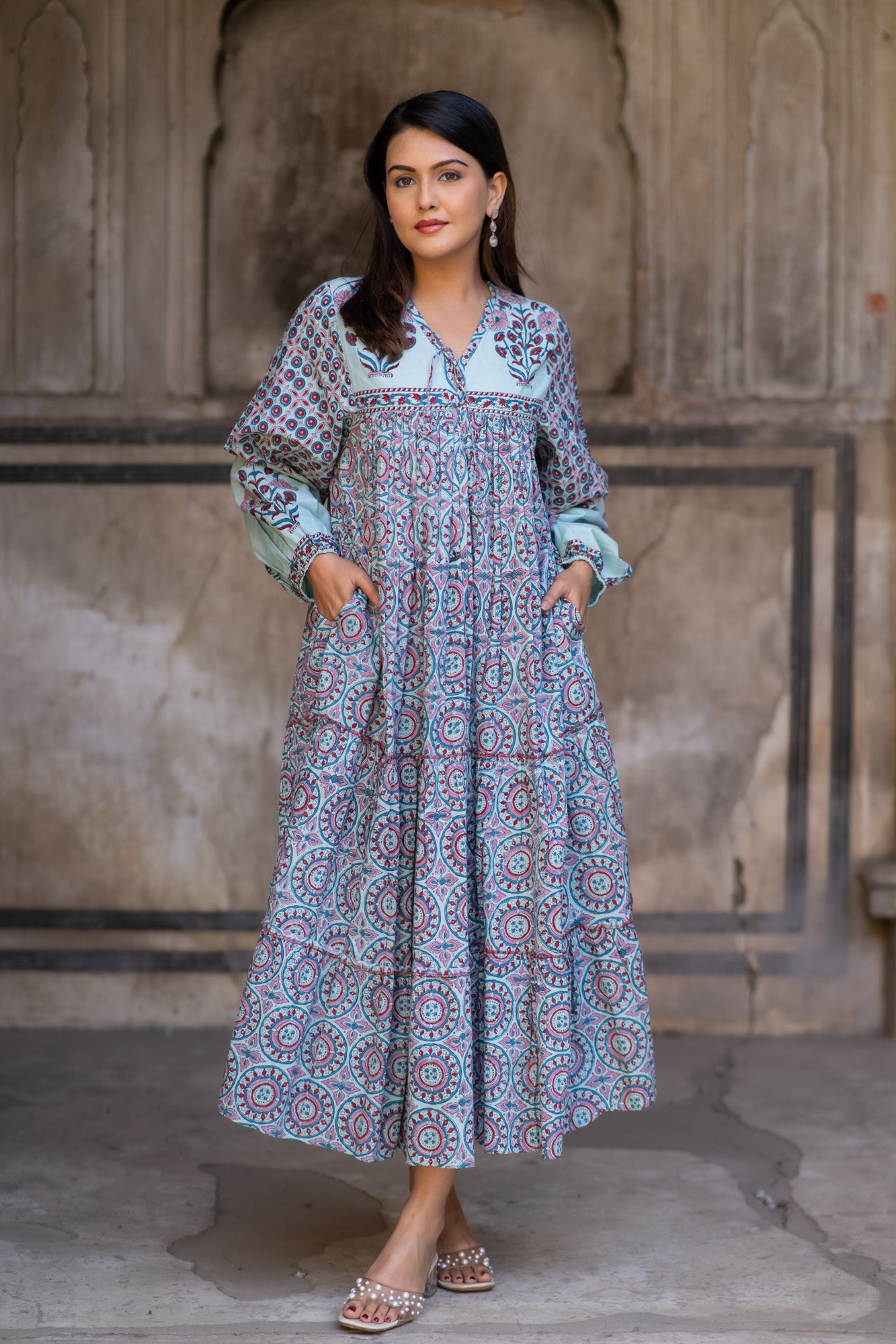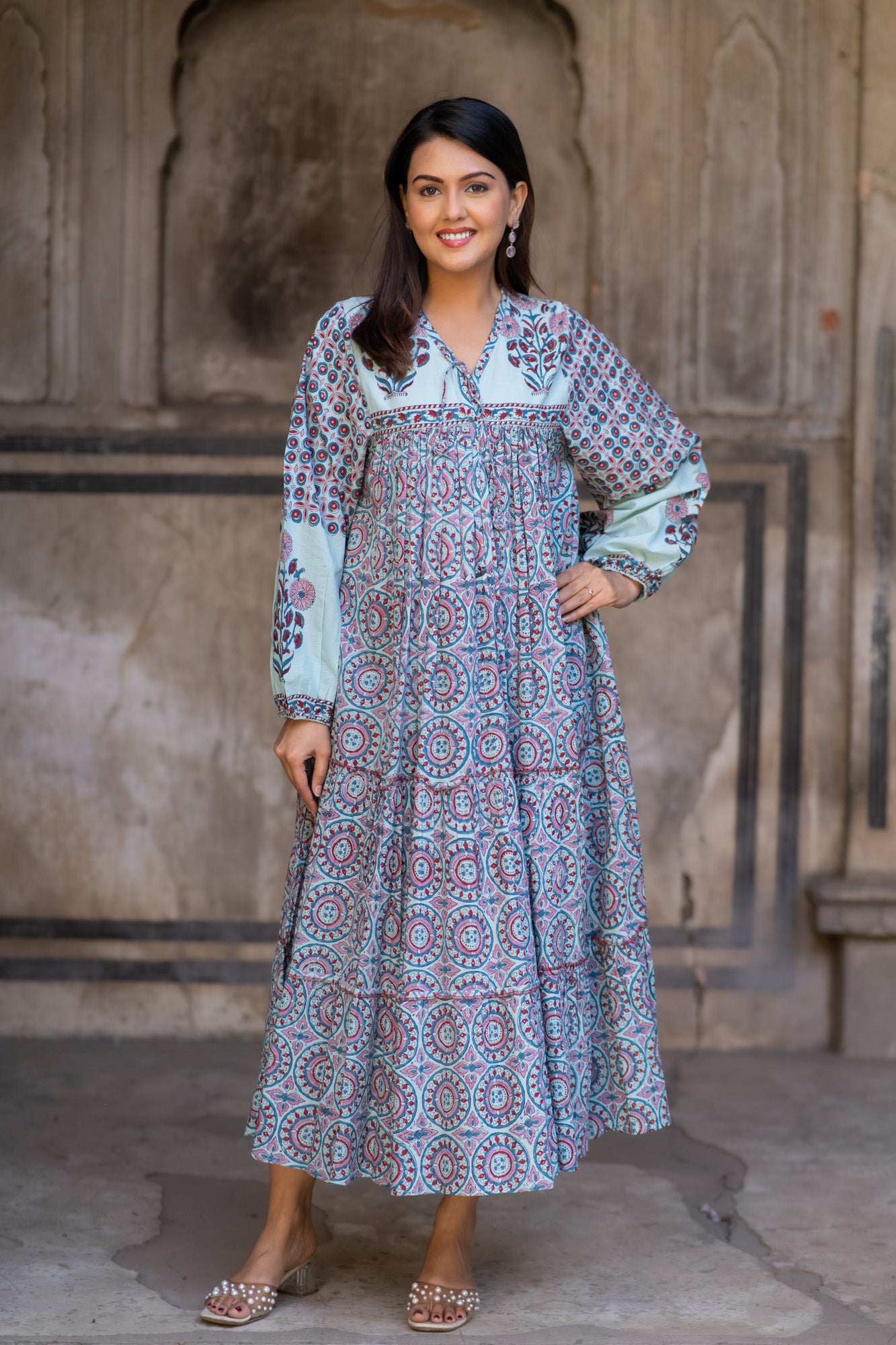 Hand block printed flair long dress in blue and red color combination. Balloon sleeves with mughal hand block print adds beauty to the piece.