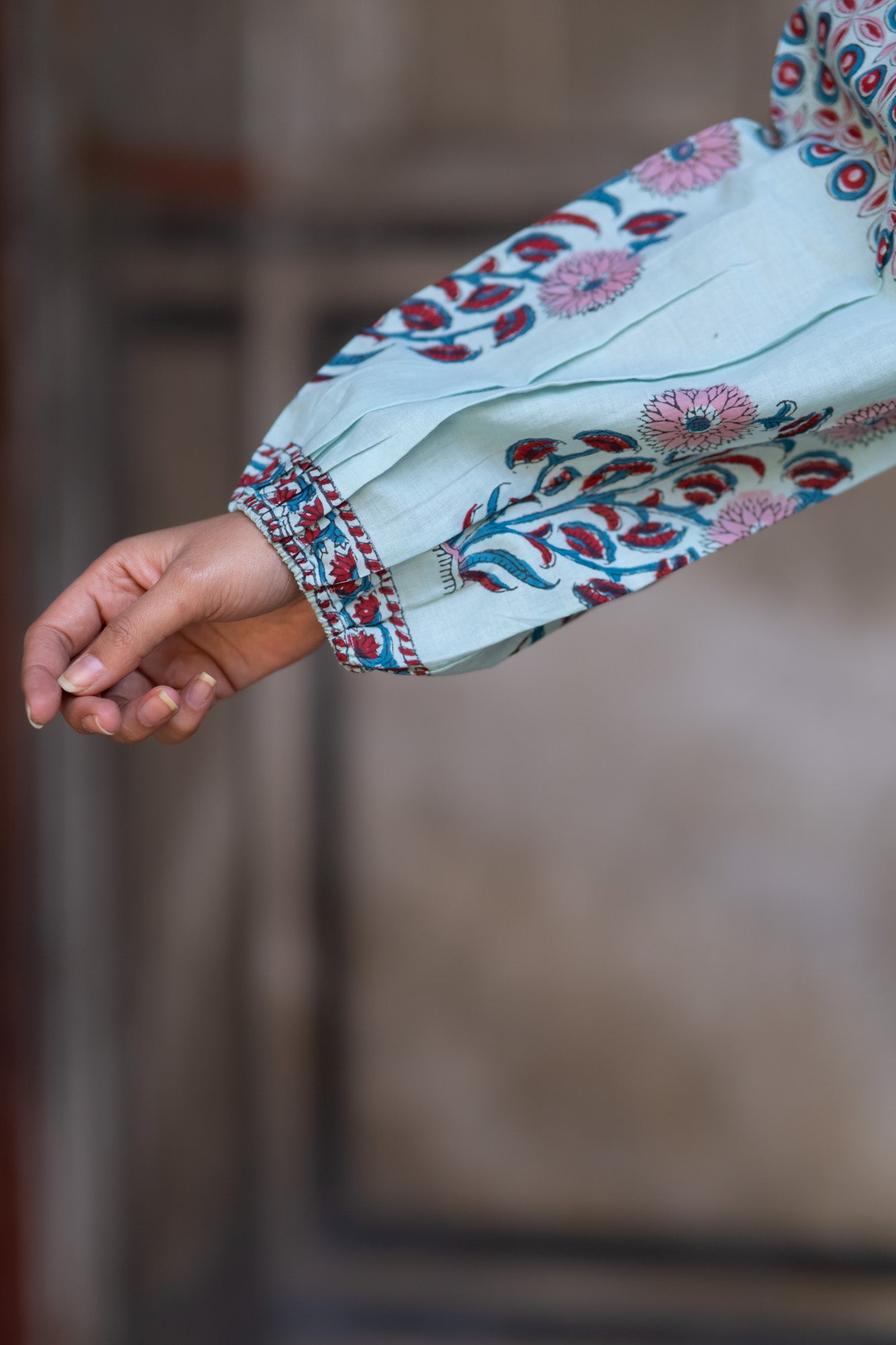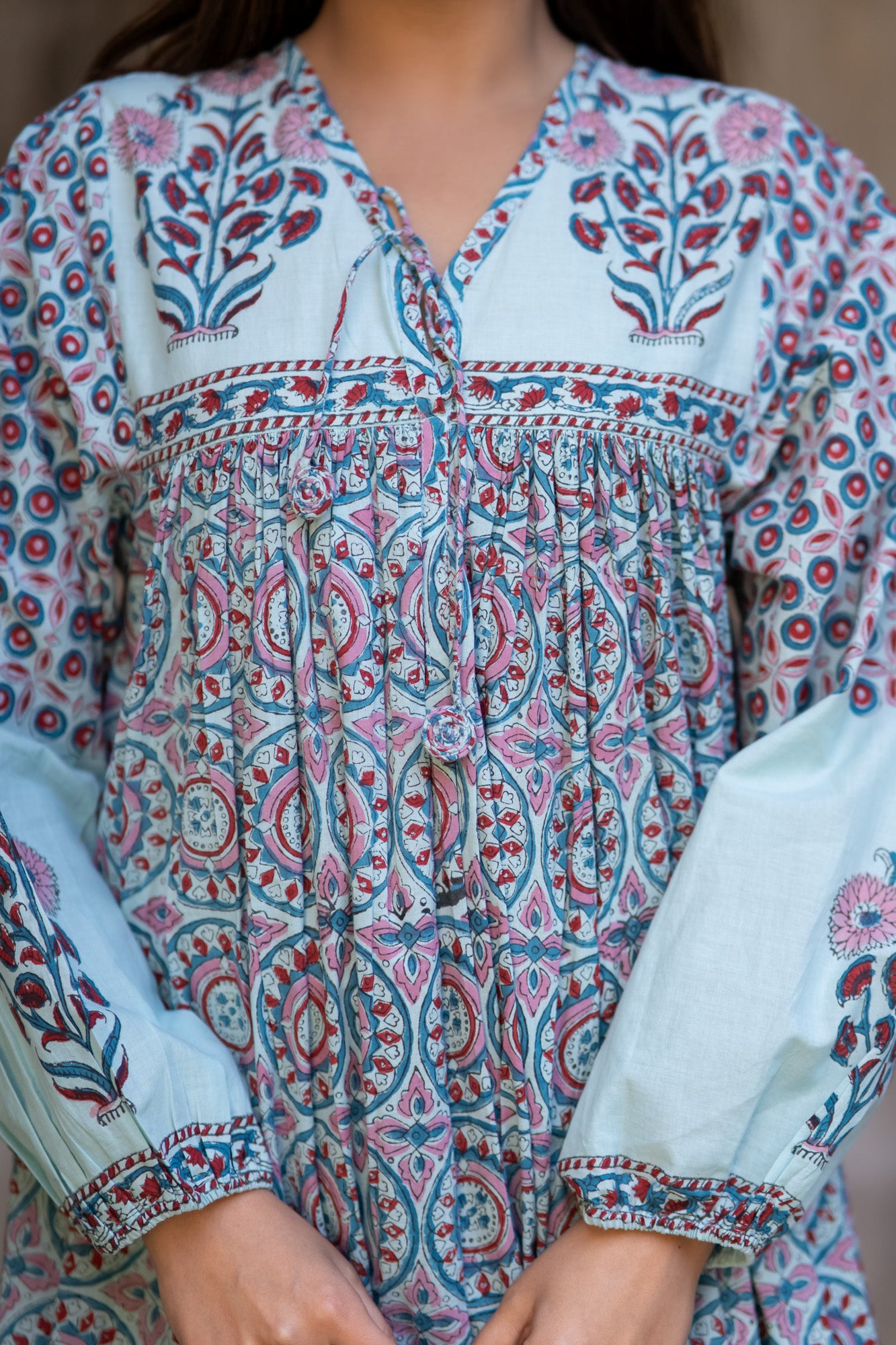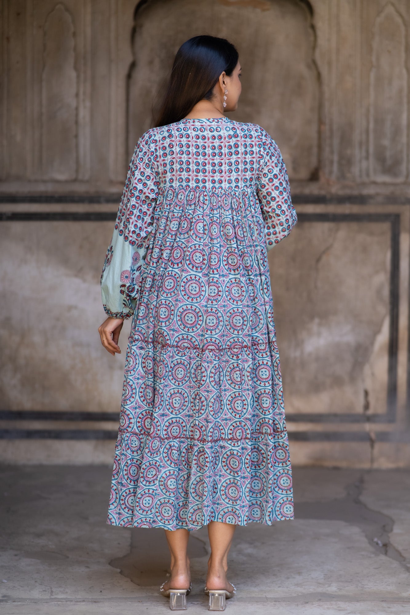 Hand block printed flair long dress in blue and red color combination. Balloon sleeves with mughal hand block print adds beauty to the piece.