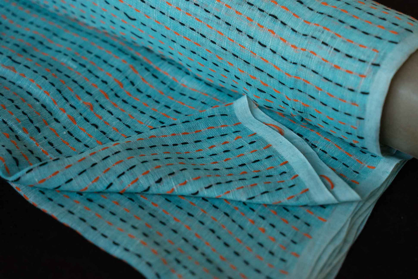 Fine quality kantha stitch pure handloom linen fabric on blue base color.