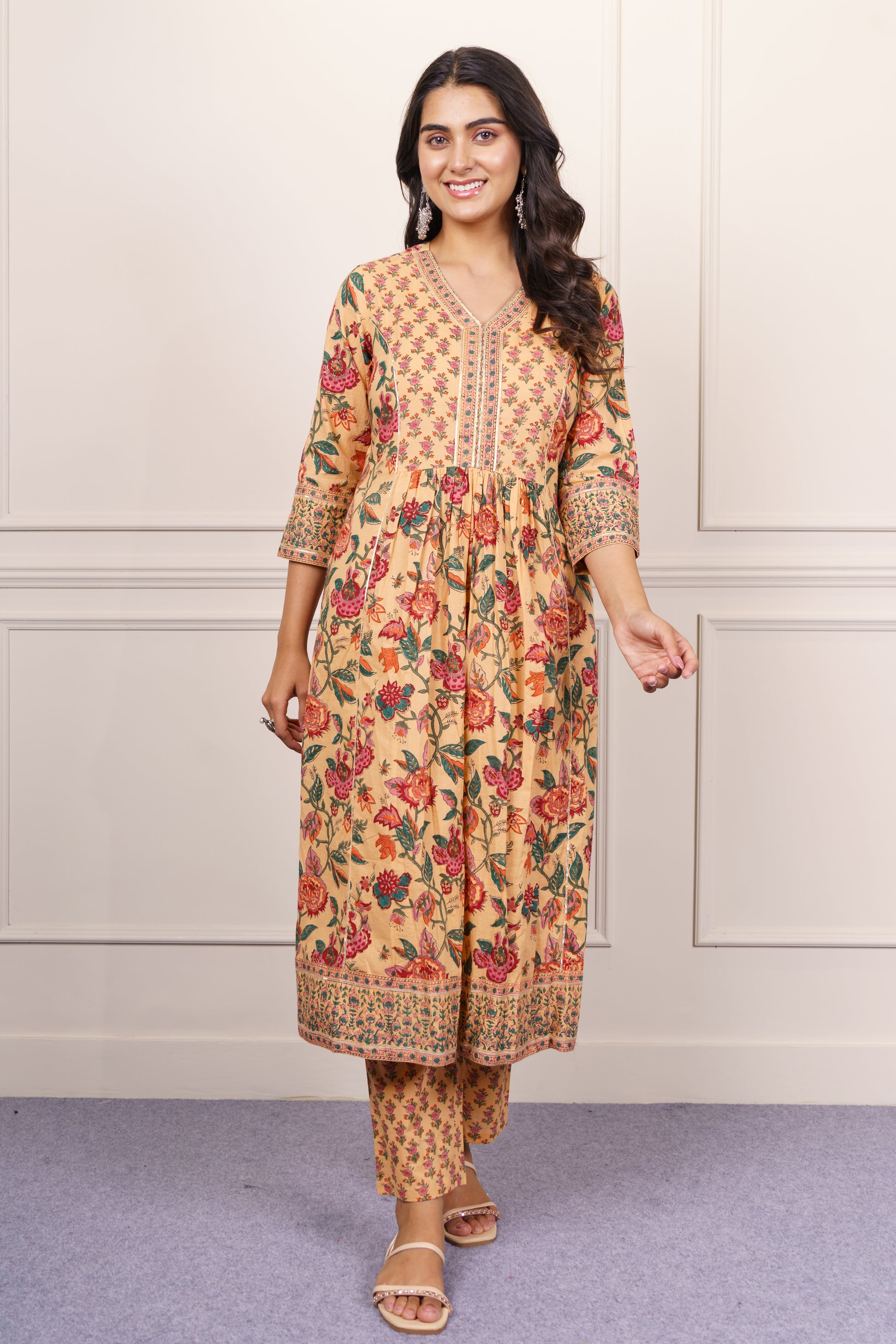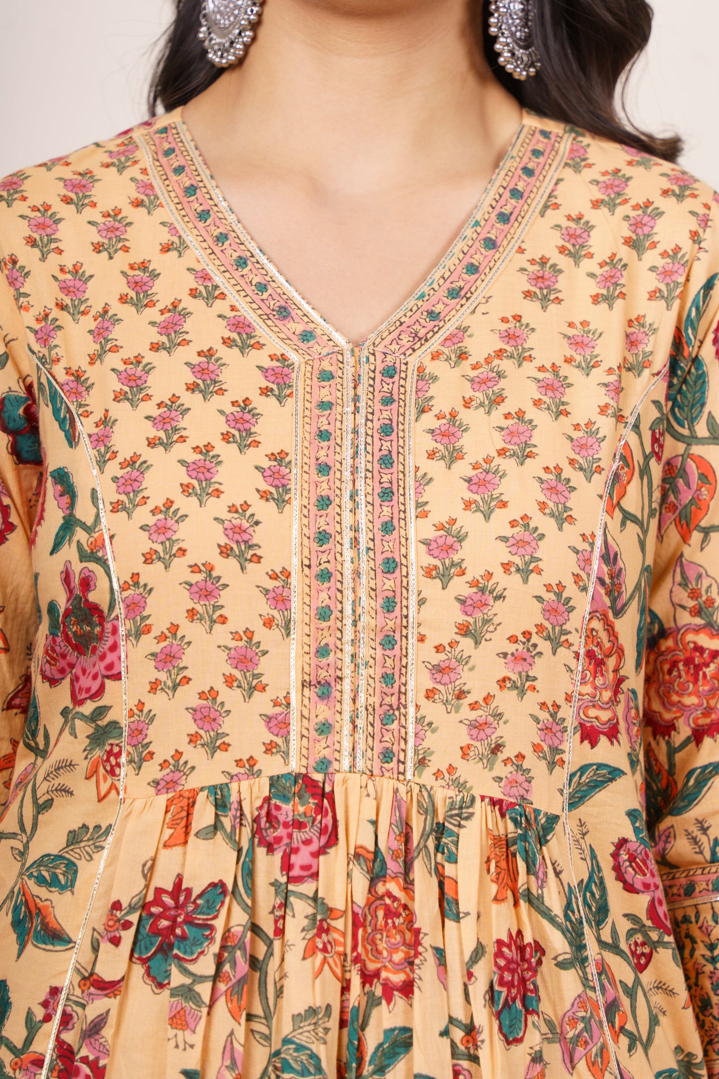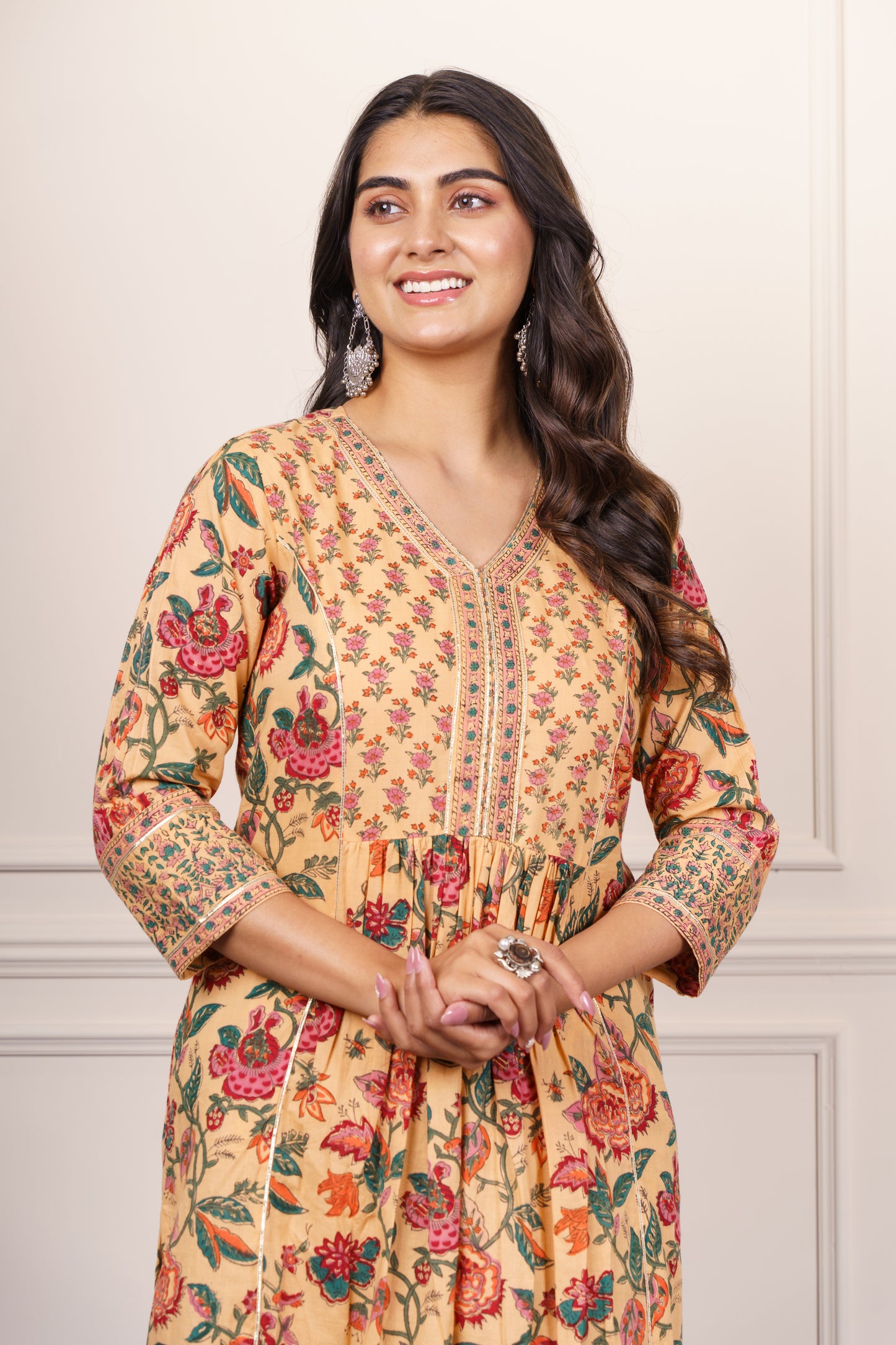 This peach-hued cotton kurta Set features a charming mix of tiny floral bootis on the bodice and bold, multicolor floral motifs on the skirt and sleeves. With a flattering gathered waist, V-neckline, and detailed border prints, it exudes a breezy, ethnic elegance perfect for everyday wear or semi-formal occasions.