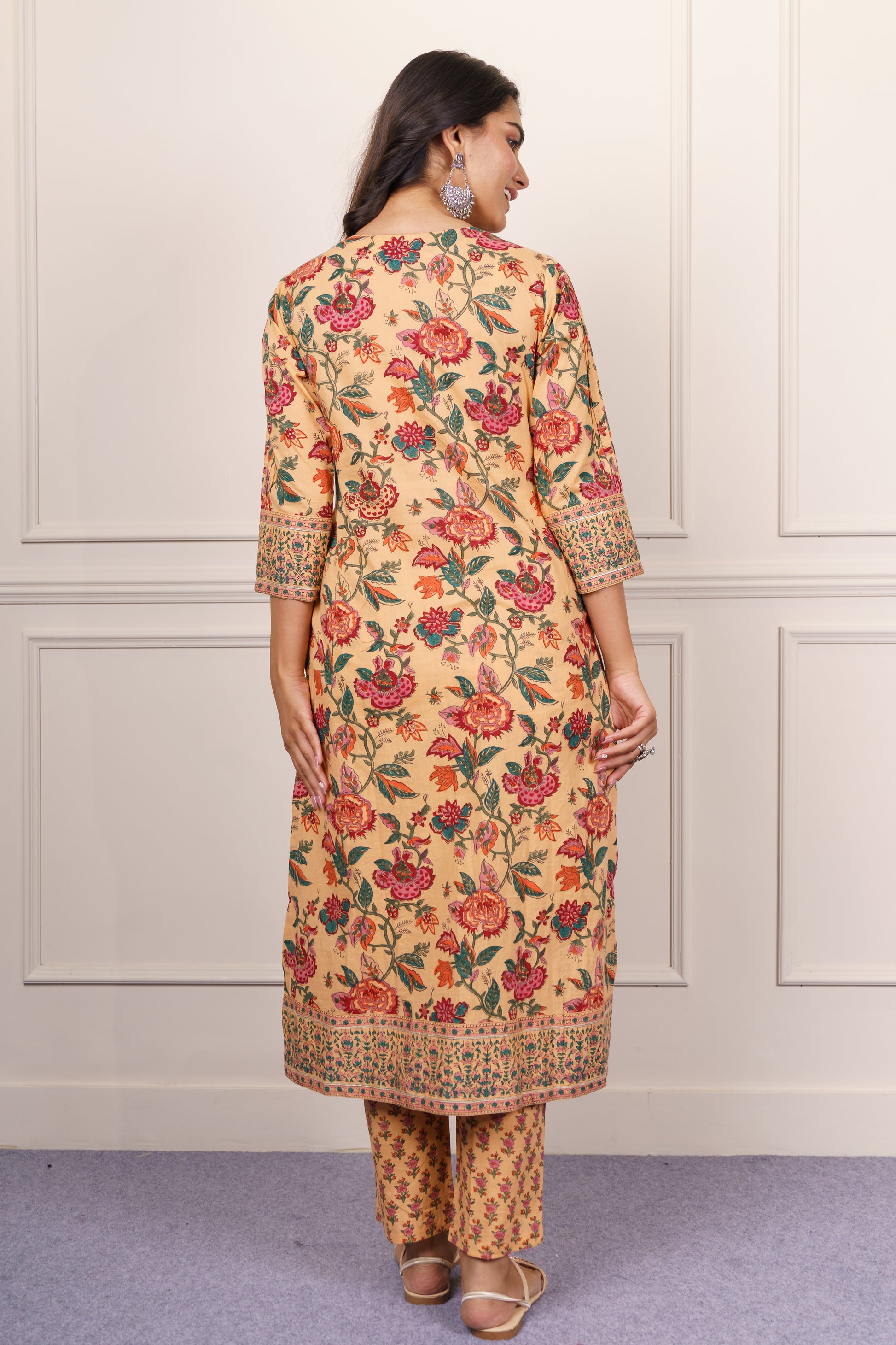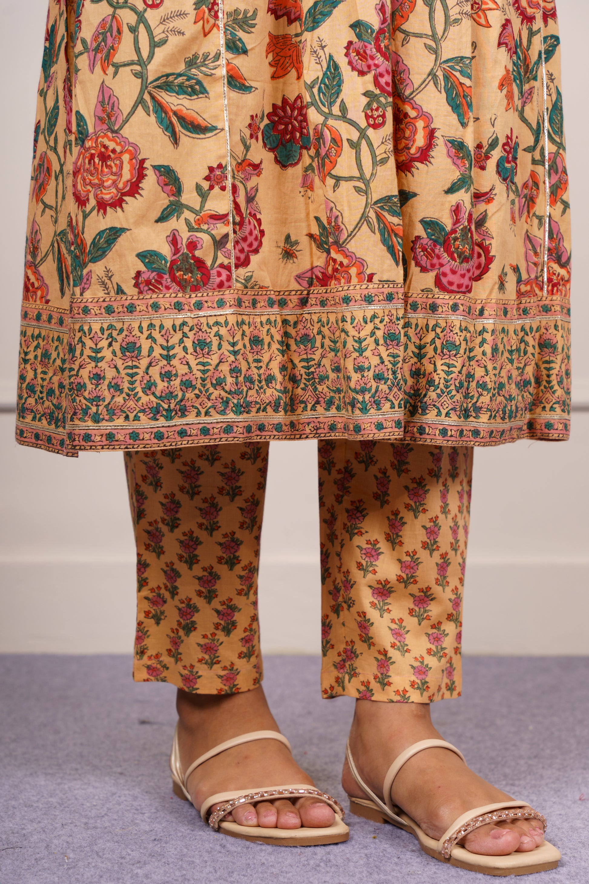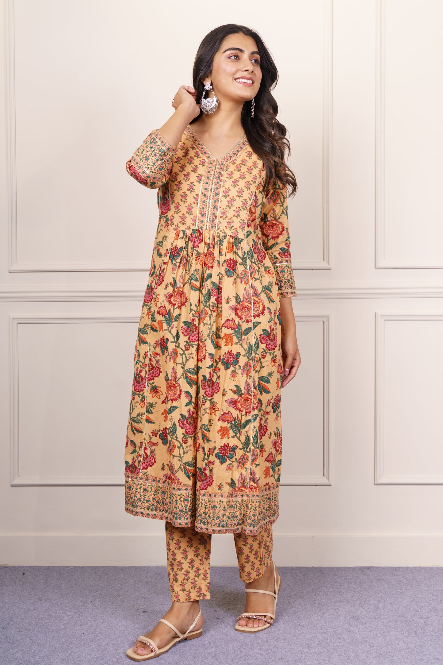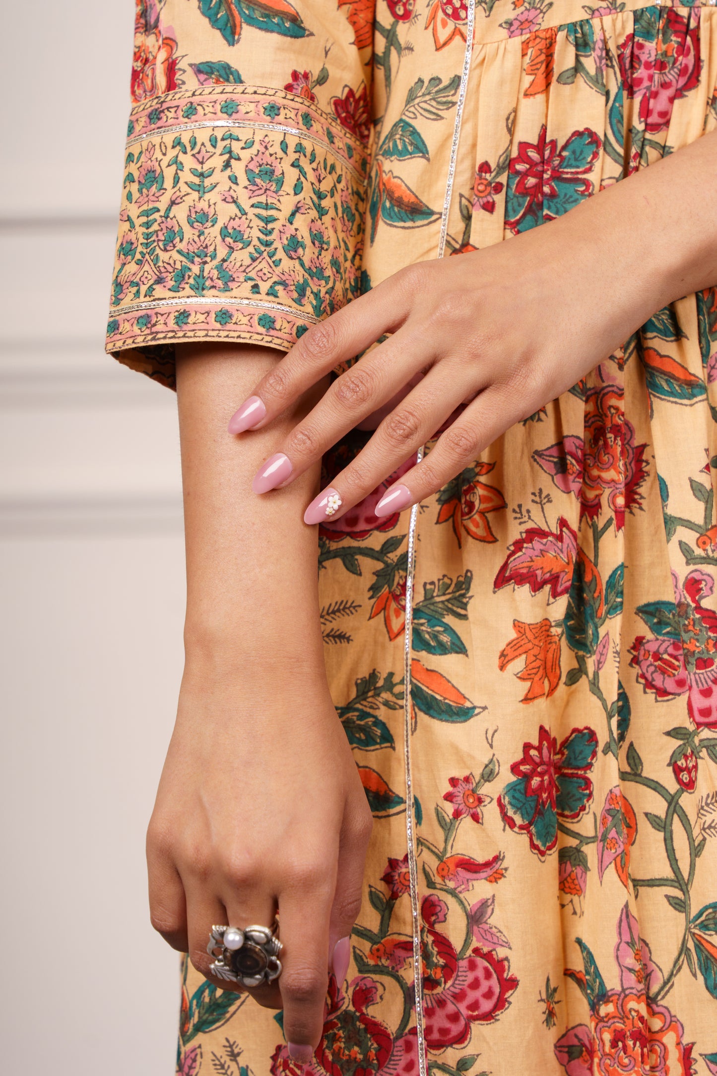 This peach-hued cotton kurta Set features a charming mix of tiny floral bootis on the bodice and bold, multicolor floral motifs on the skirt and sleeves. With a flattering gathered waist, V-neckline, and detailed border prints, it exudes a breezy, ethnic elegance perfect for everyday wear or semi-formal occasions.