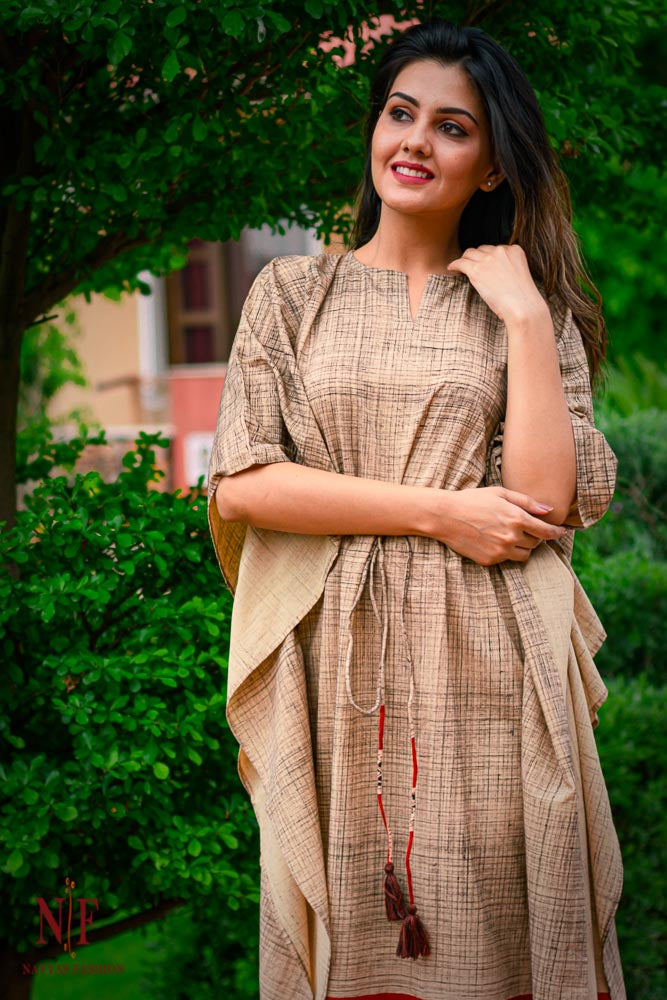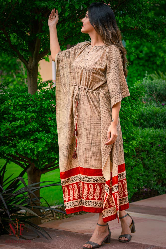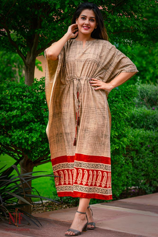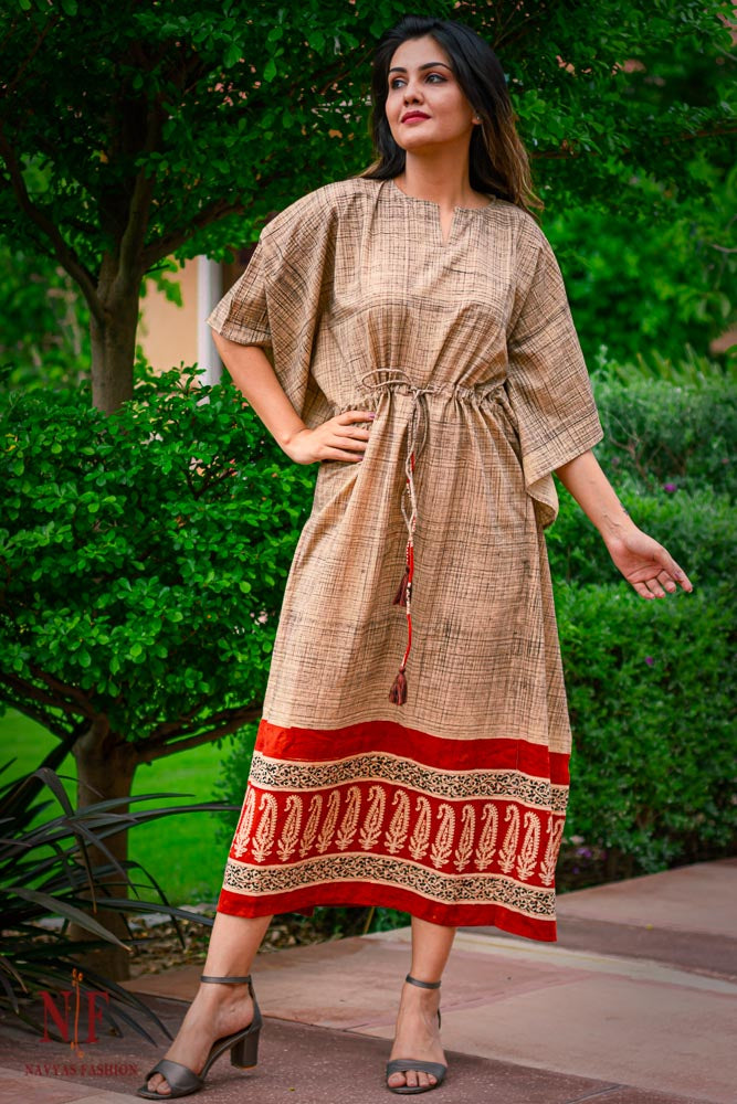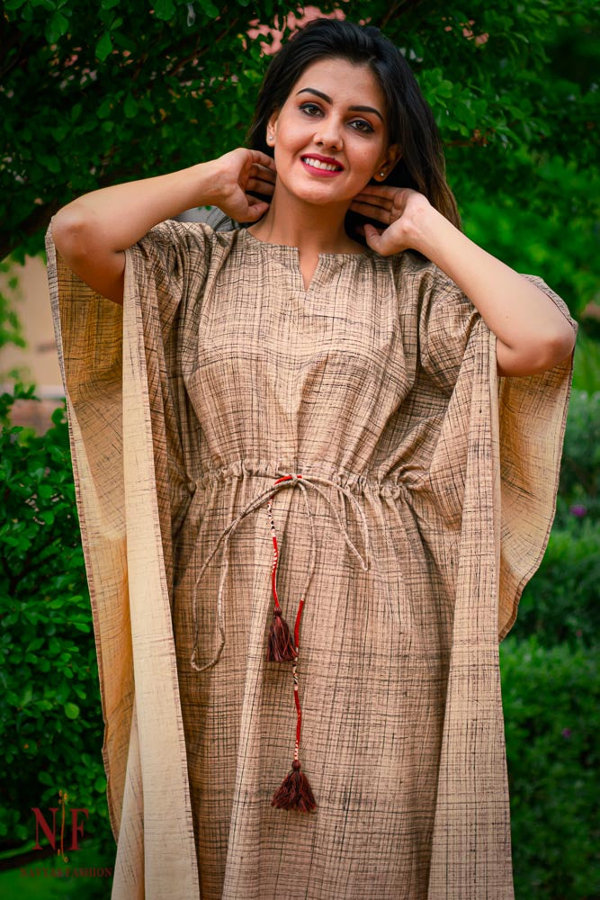 Beautiful brush paint cotton kaftan dress with a drawstring and loose sleeves to give trendy looks.Tassels are there at the end of the drawstrings.