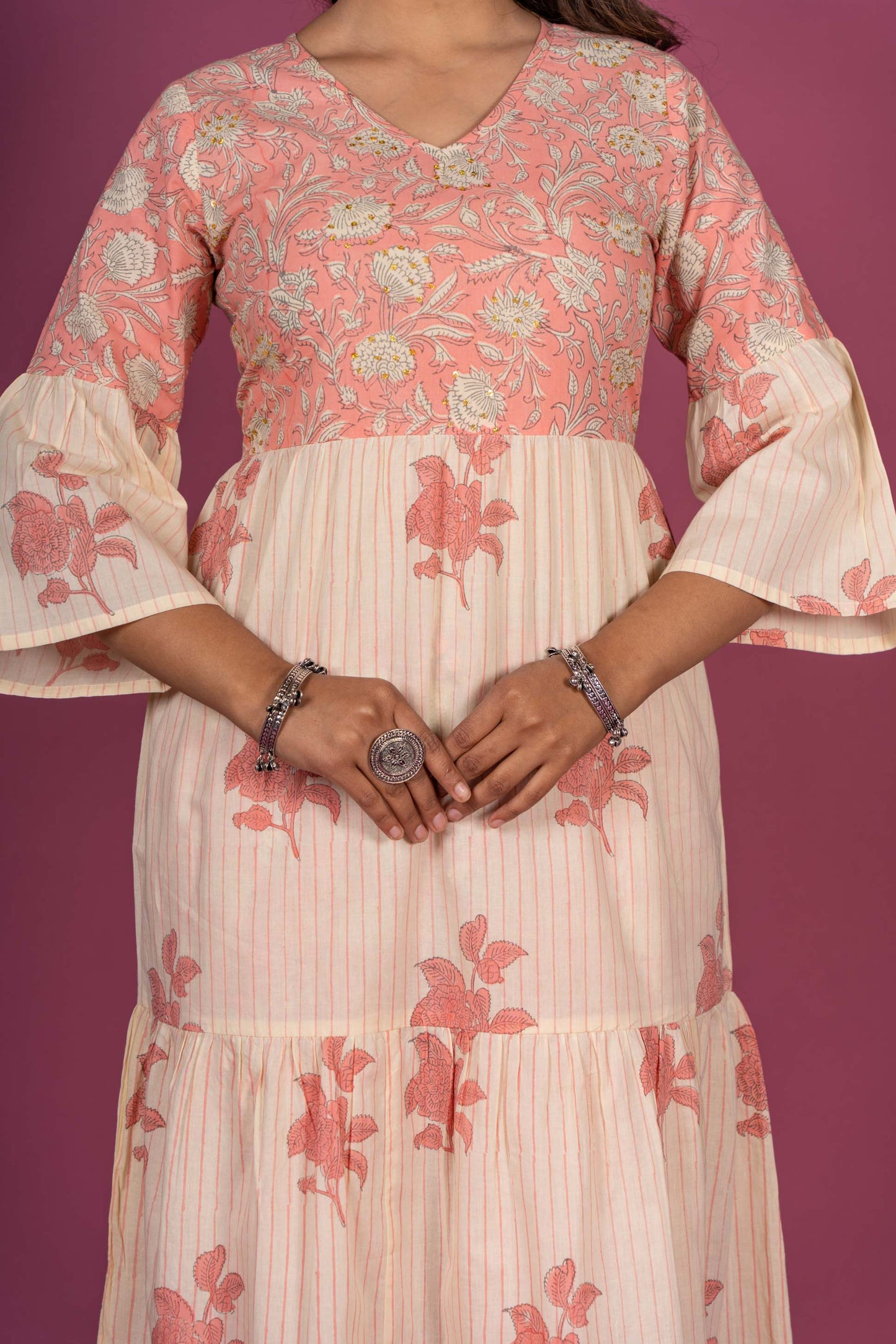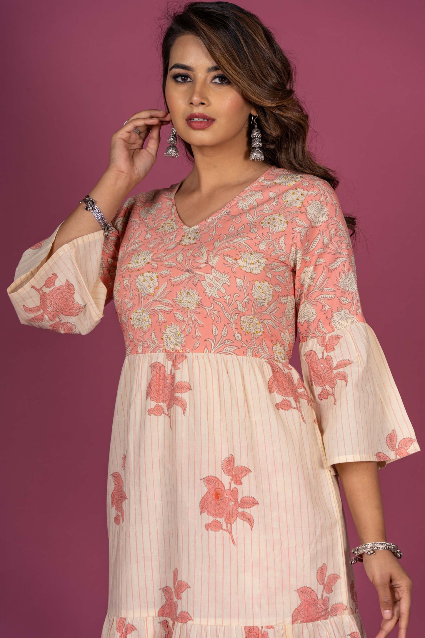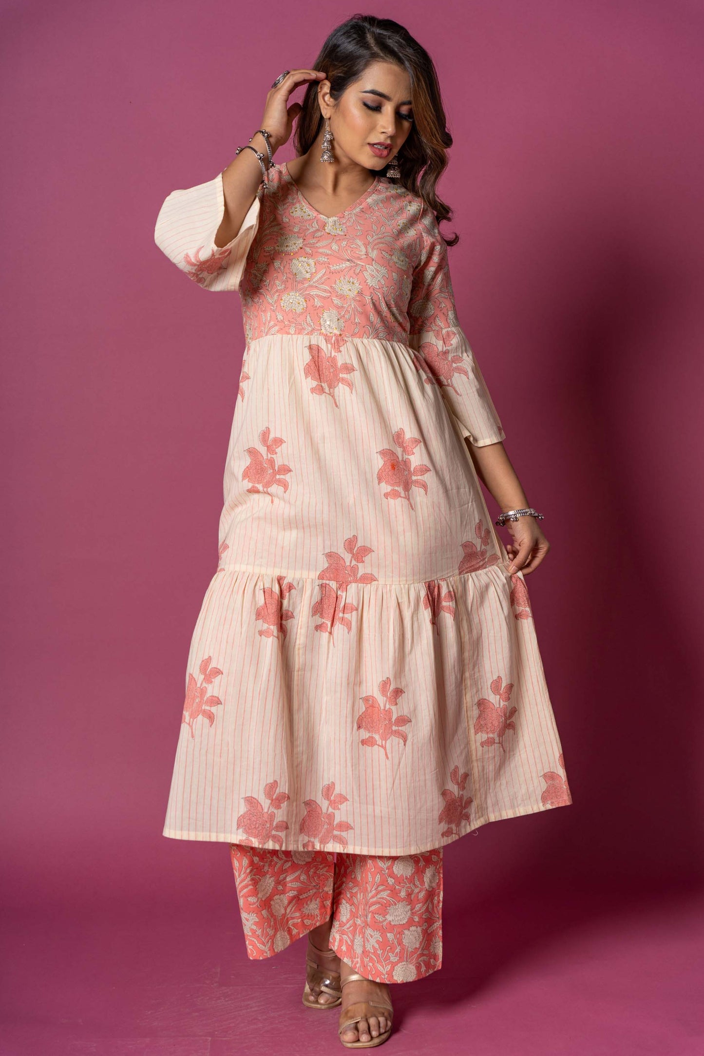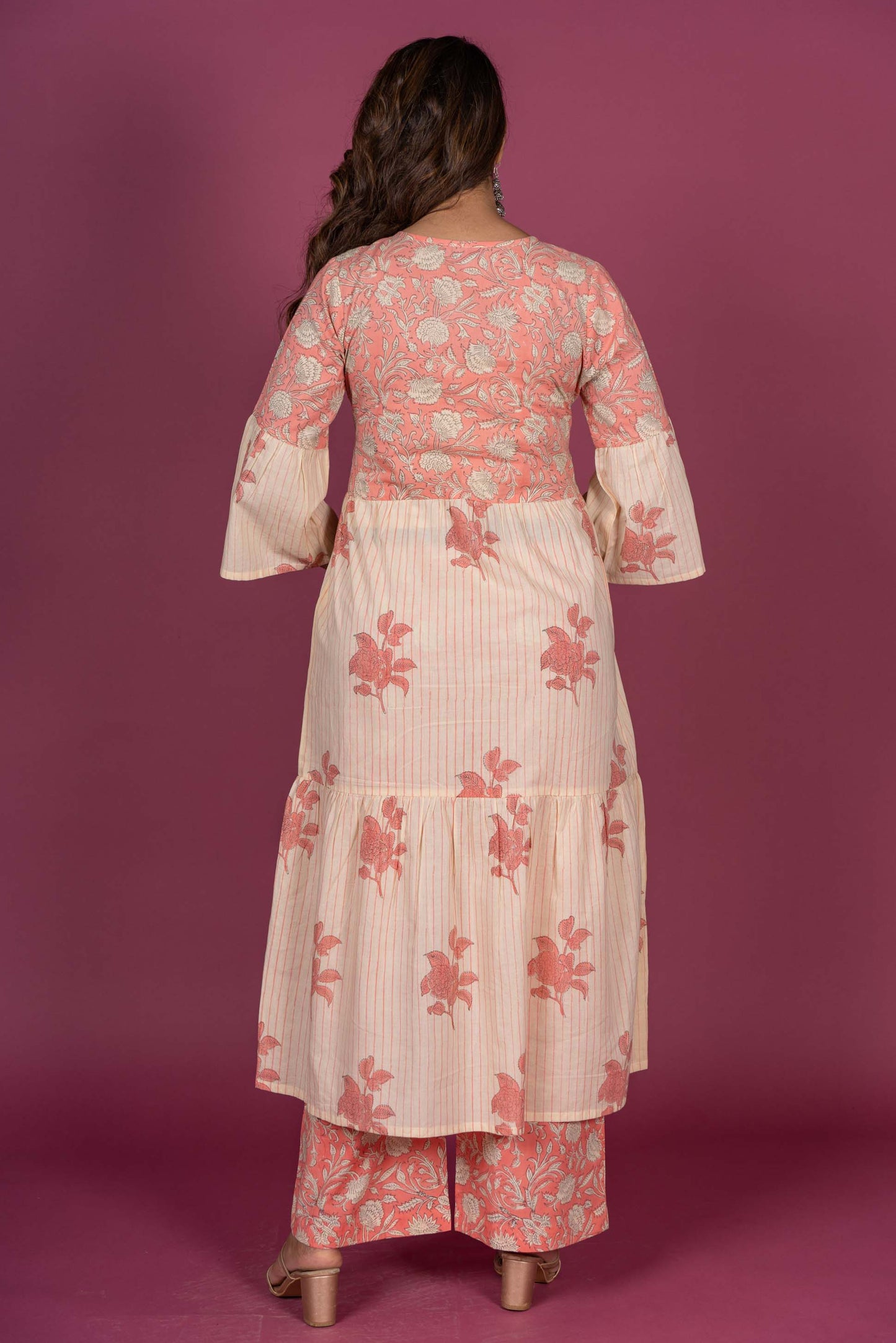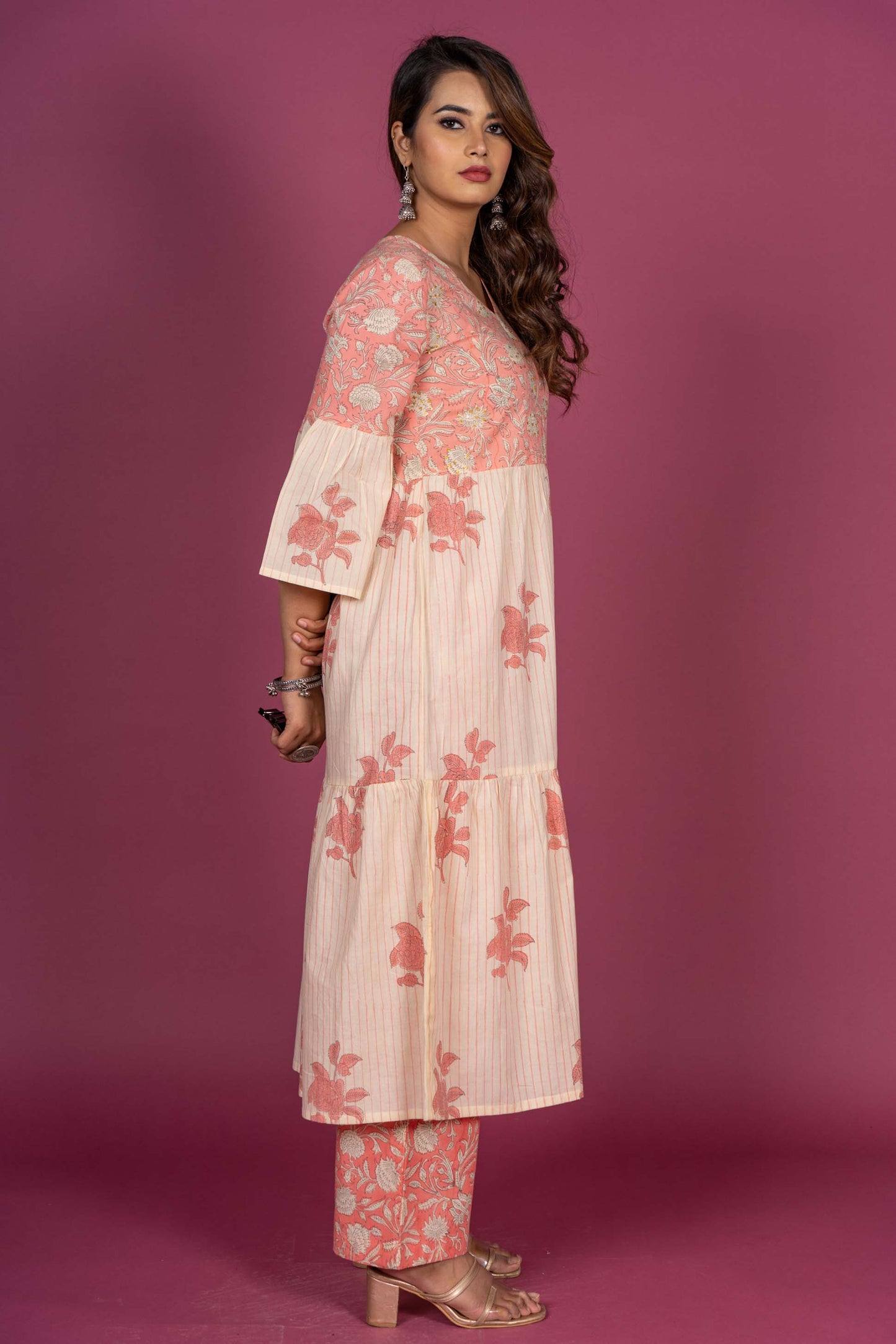This kurta is made A line cut with three tiers having Pink color hand block print fabric on the yoke.