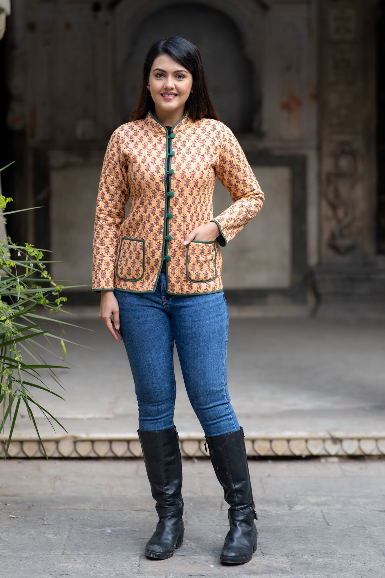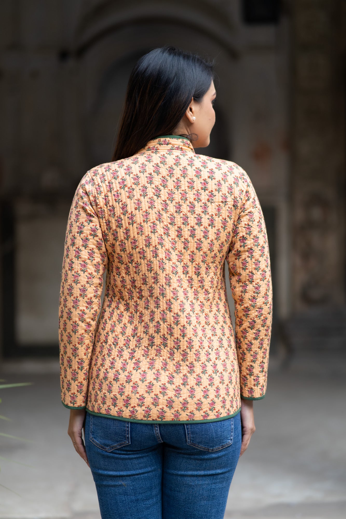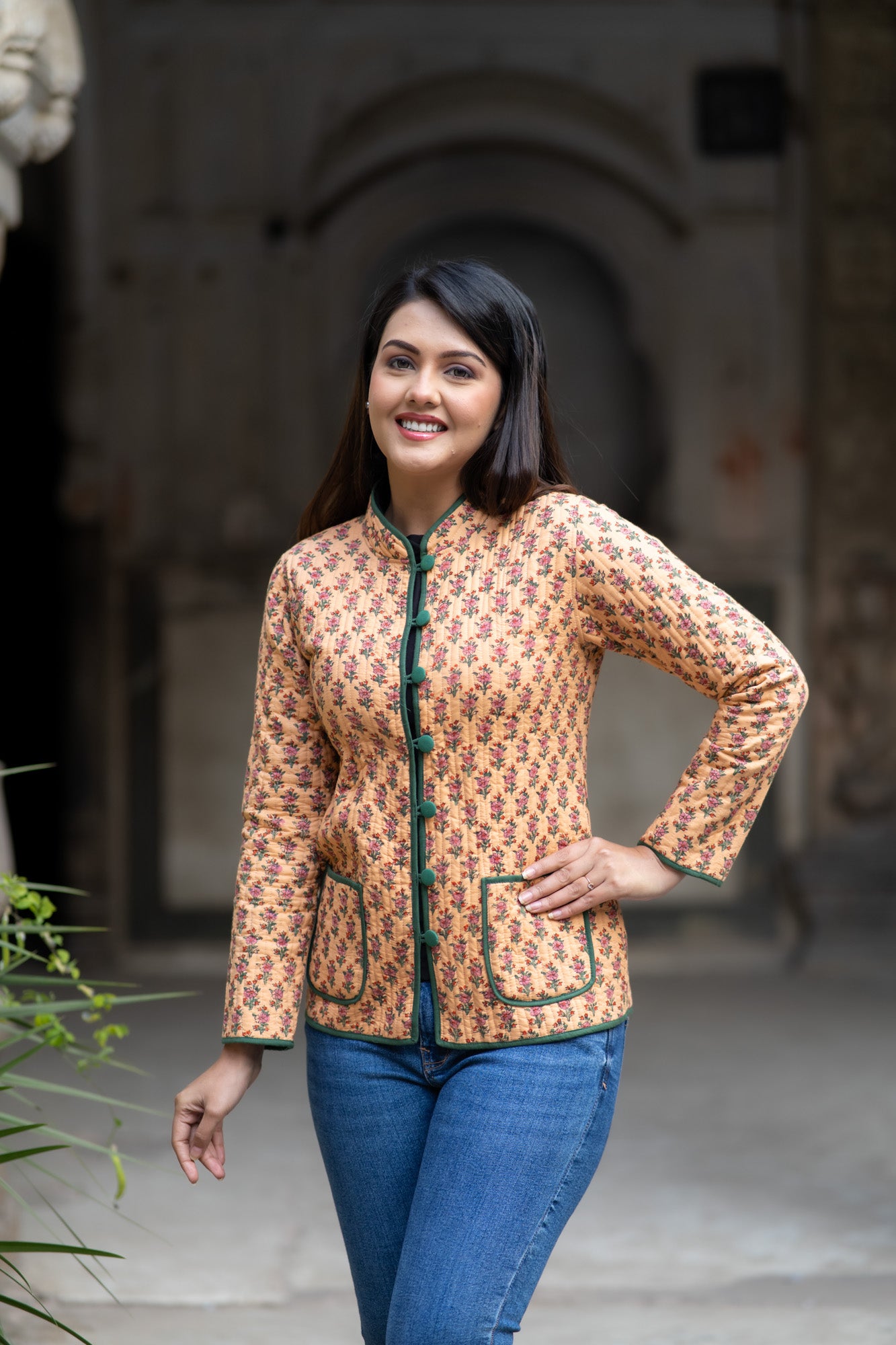 Butterscotch hand block printed reversible quilted jacket with green plain color fabric on the reverse side making it wearable from both the sides.