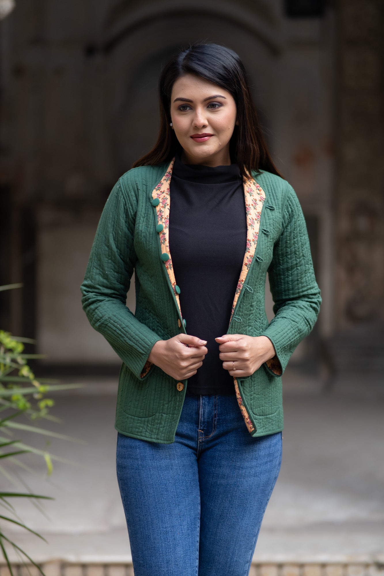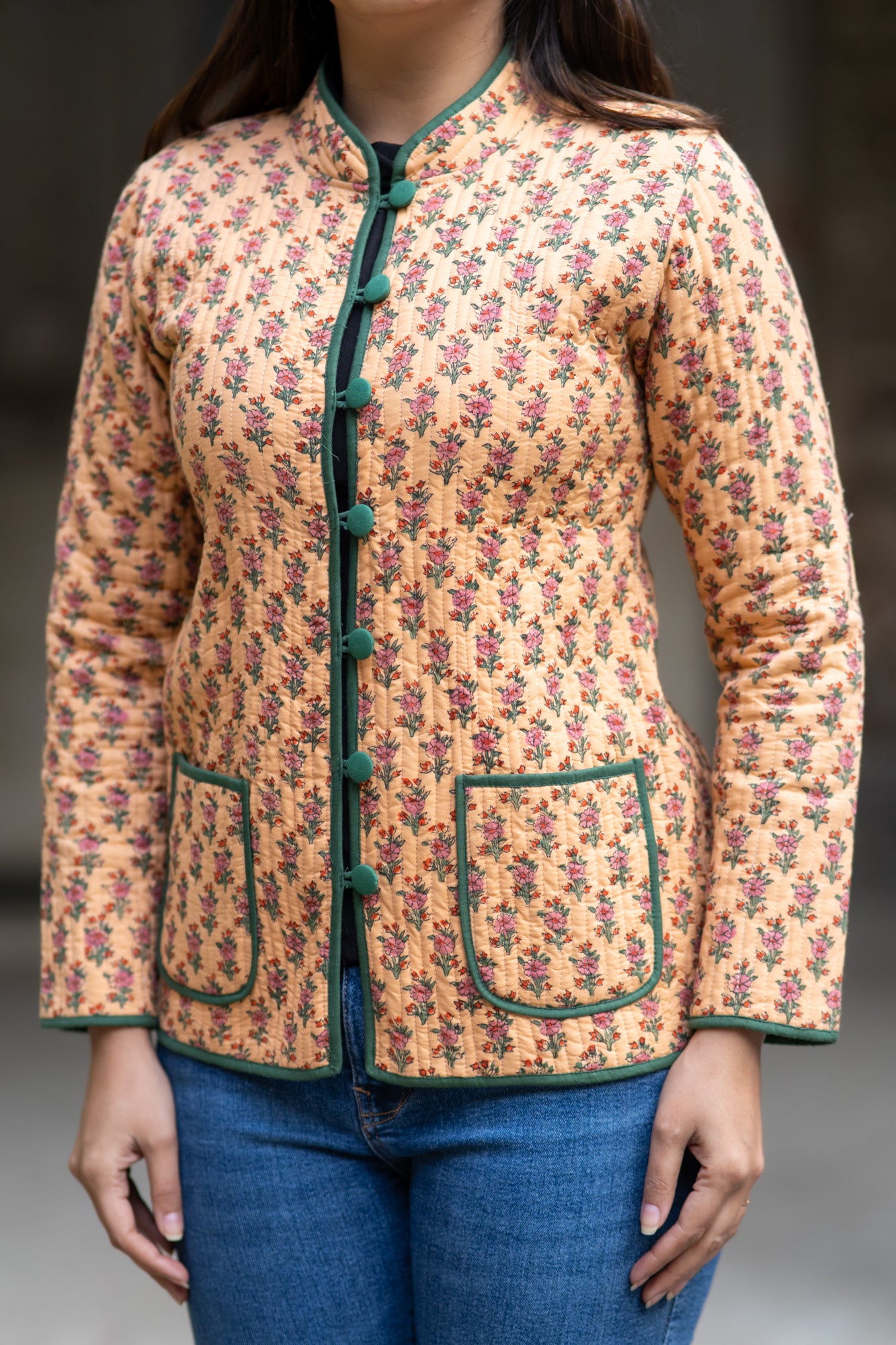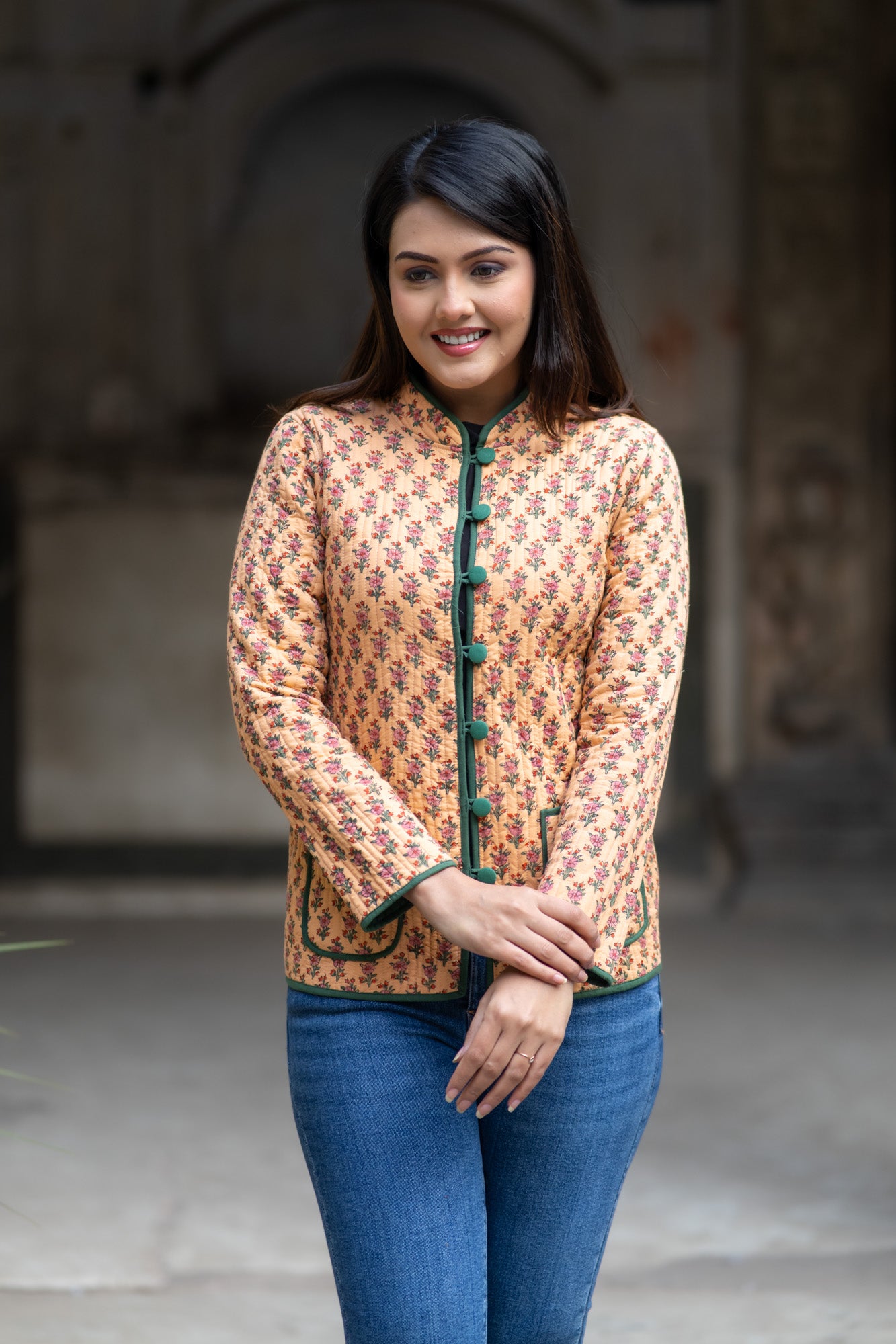 Butterscotch hand block printed reversible quilted jacket with green plain color fabric on the reverse side making it wearable from both the sides.
