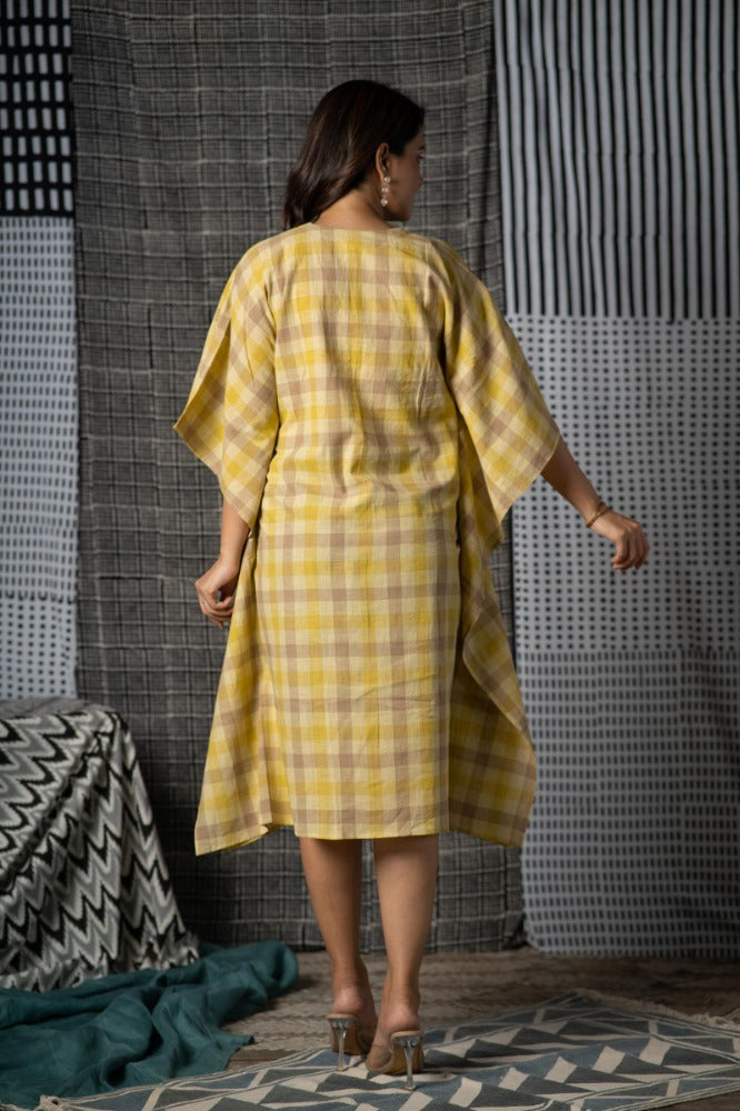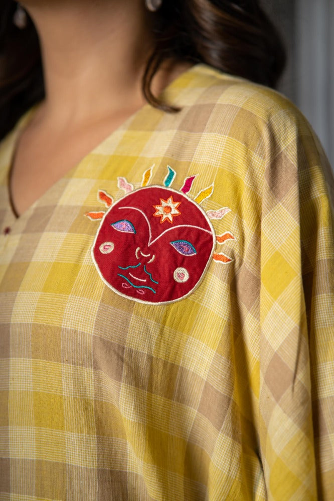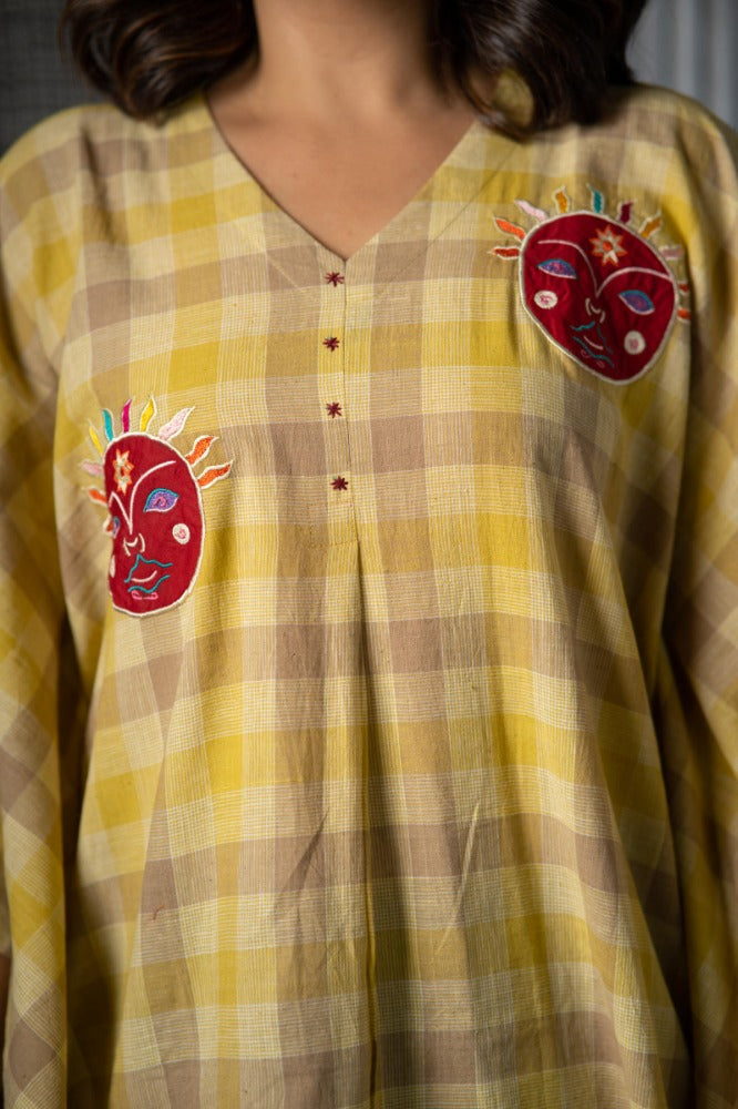 Mustard and light brown handloom khari cotton knee langth kaftan for the summer season. Embroidery done patch on the yoke adds beauty to the piece. V shape neck in pure handloom khari cotton fabric is a must buy for trendy looks.