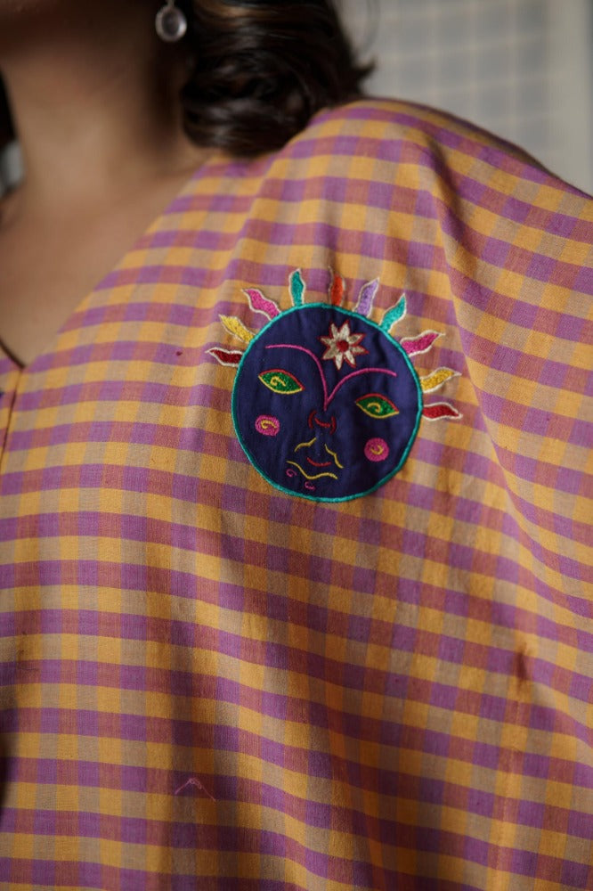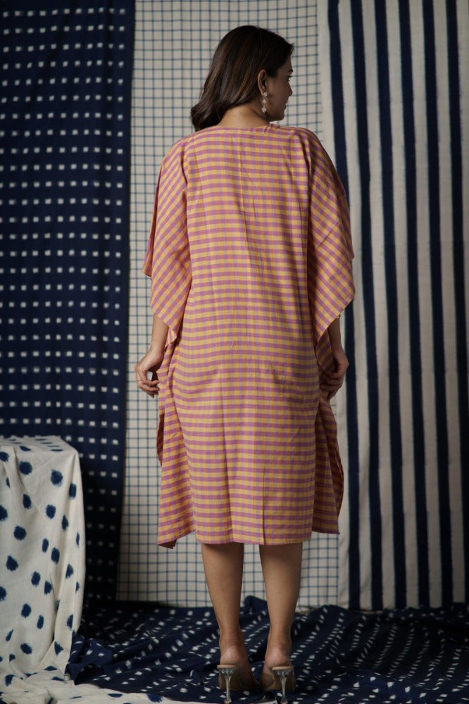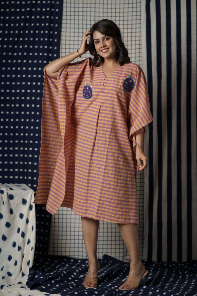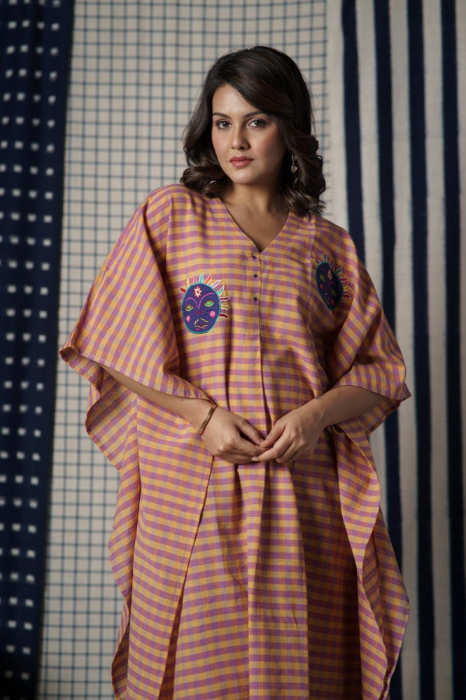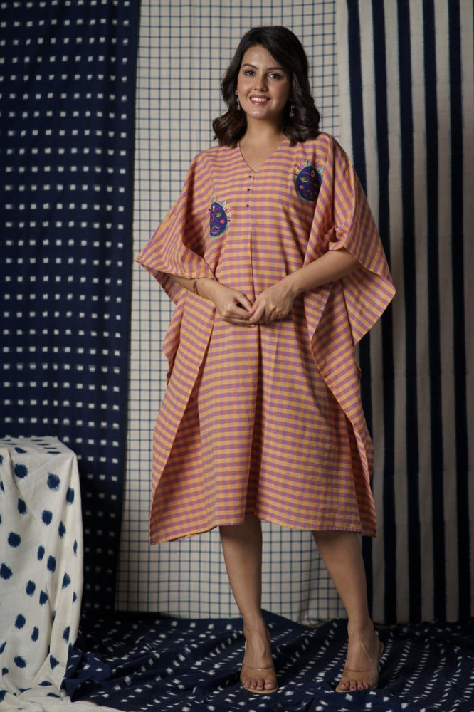 Yellow and purple pink checks handloom khari cotton knee length kaftan for the summer season. Embroidery done patch on the yoke adds beauty to the piece. V shape neck in pure handloom khari cotton fabric is a must buy for trendy looks.