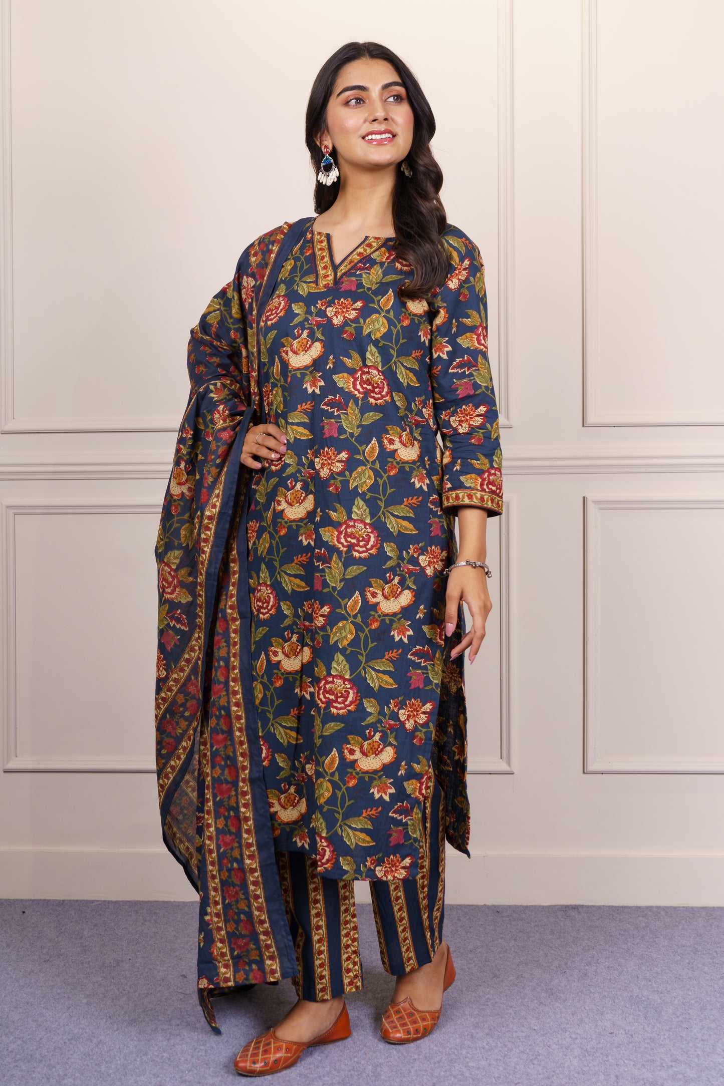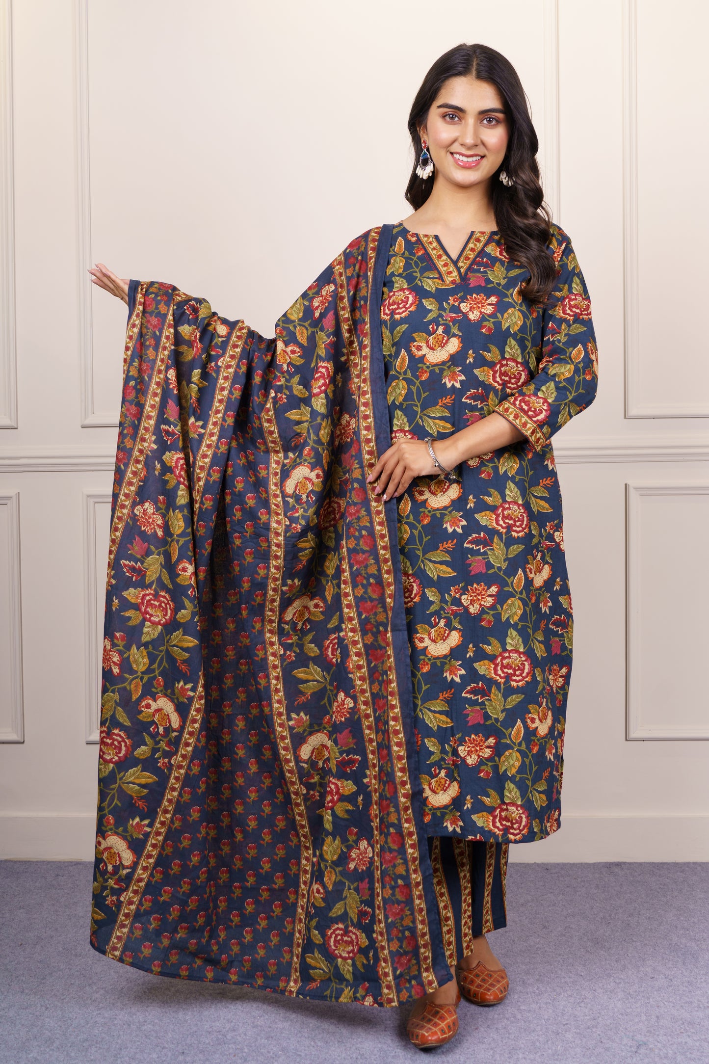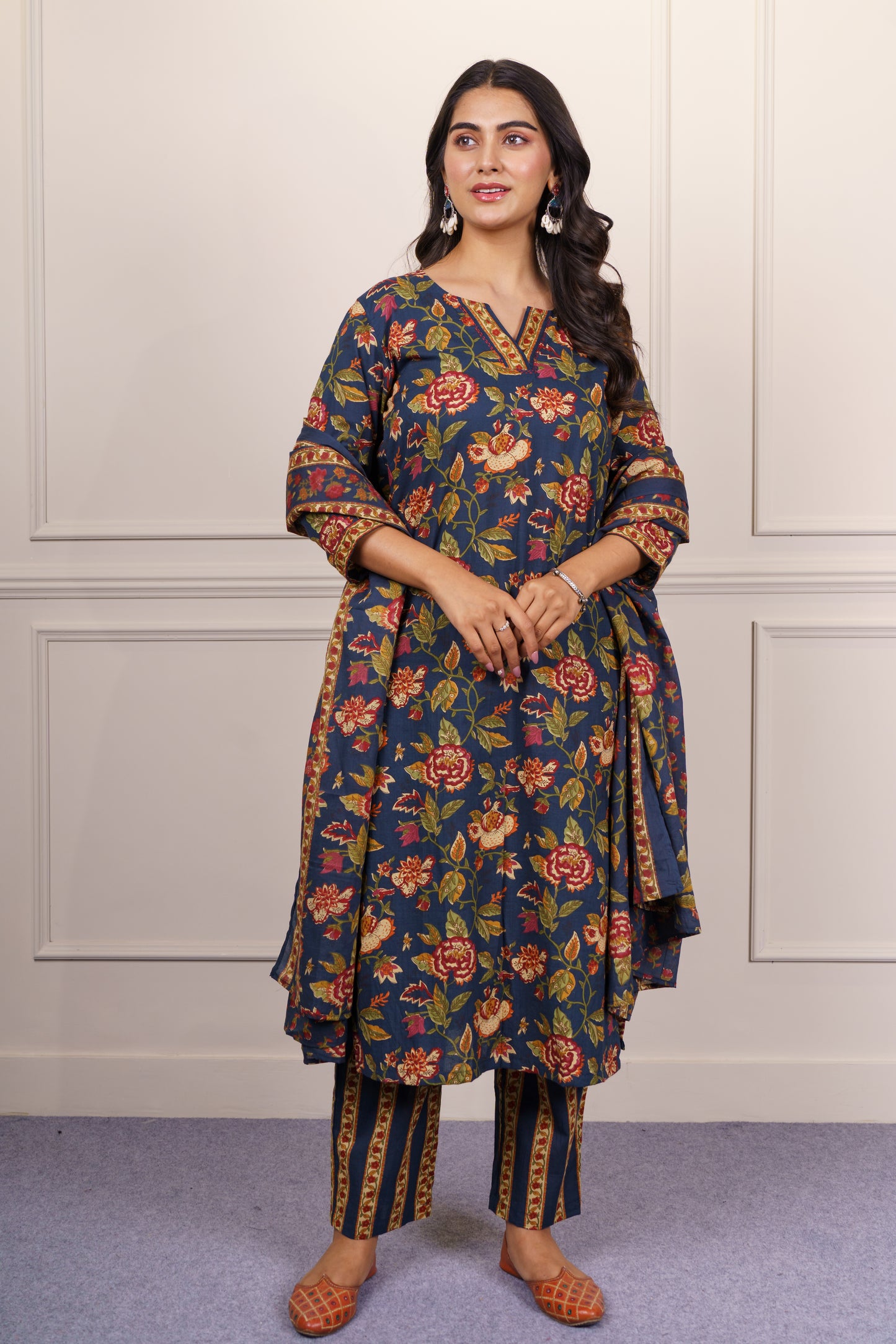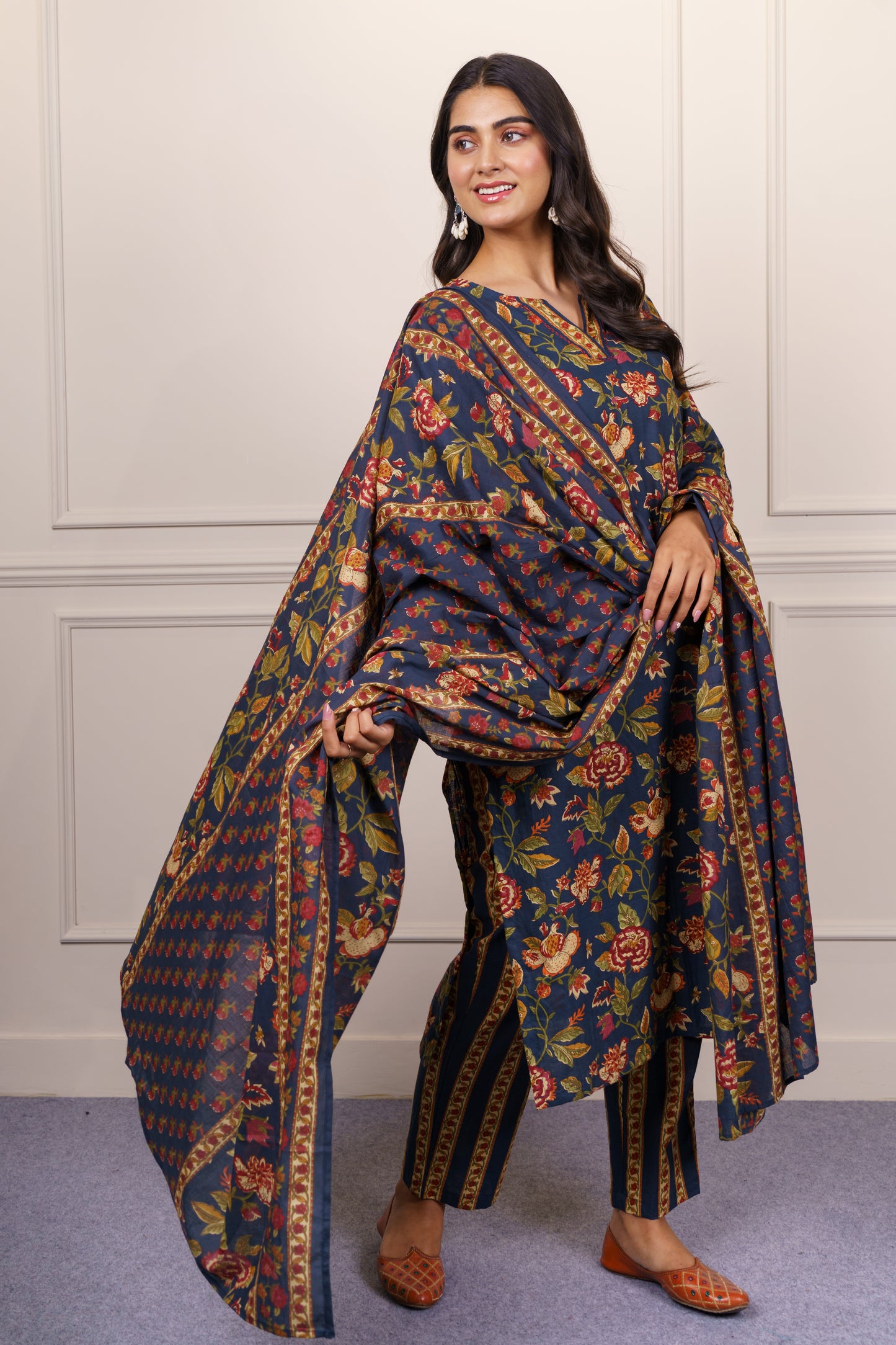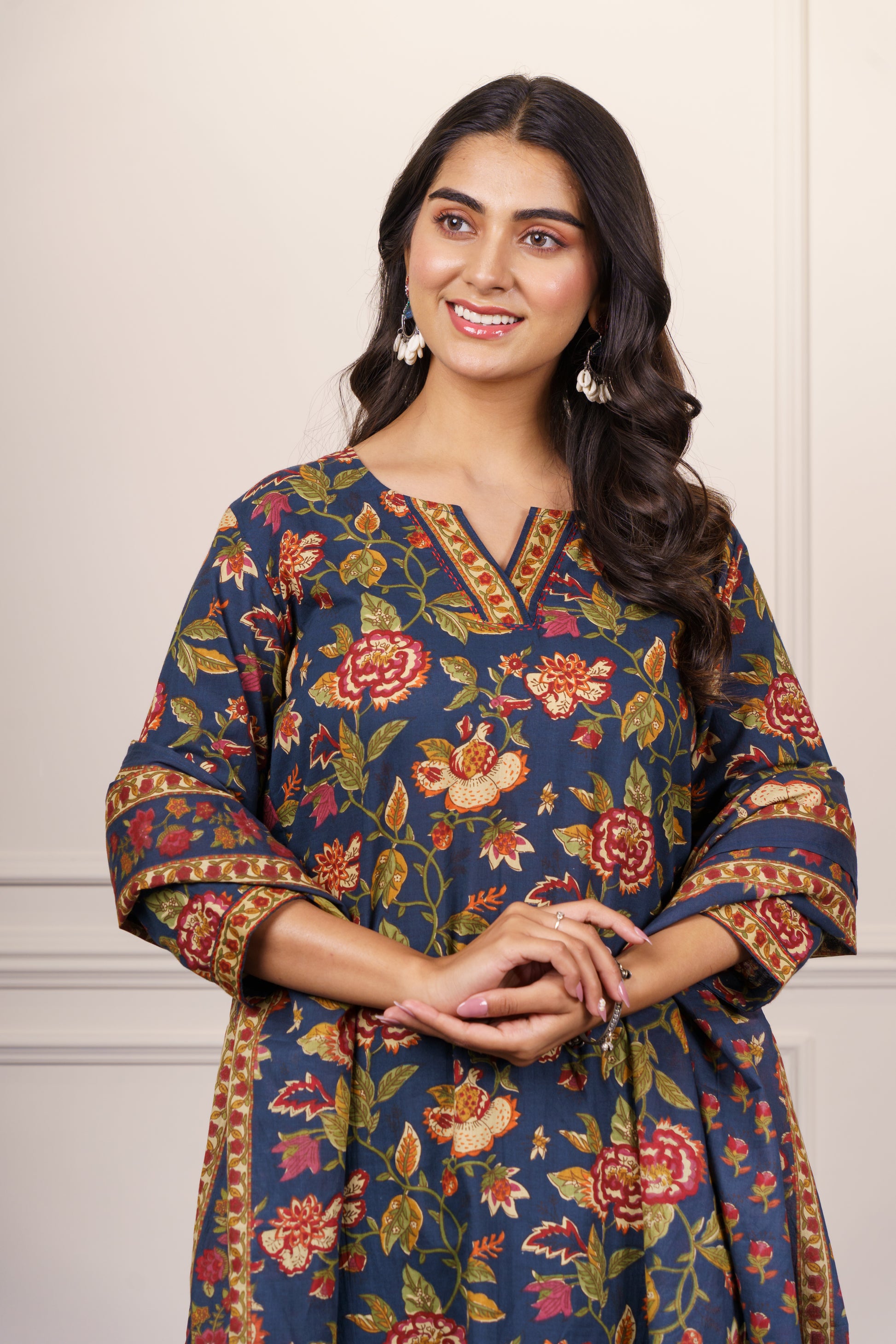 This elegant kurta with cotton dupatta set features a rich navy blue base adorned with intricate floral prints in vibrant hues of red, mustard, and green. The kurta has a classic V-neckline and three-quarter sleeves, while the dupatta showcases a complementary floral pattern with detailed borders. Perfect for festive occasions or casual gatherings, it exudes traditional charm and timeless grace.