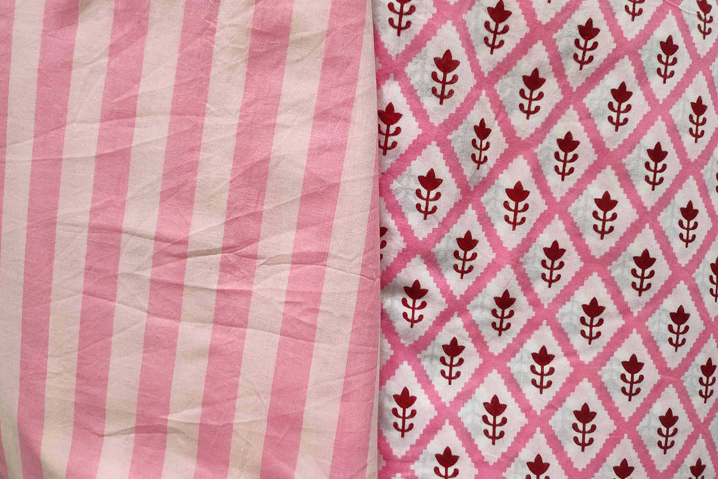 Hand block printed kurta and bottom fabric as a combo set. This soft mercerised cotton fabric is a perfect choice for getting kurta with palazzo/pant/salwar stitched. Price given above includes 1 meter piece of each fabric. You can increase the quantity according to your need.
