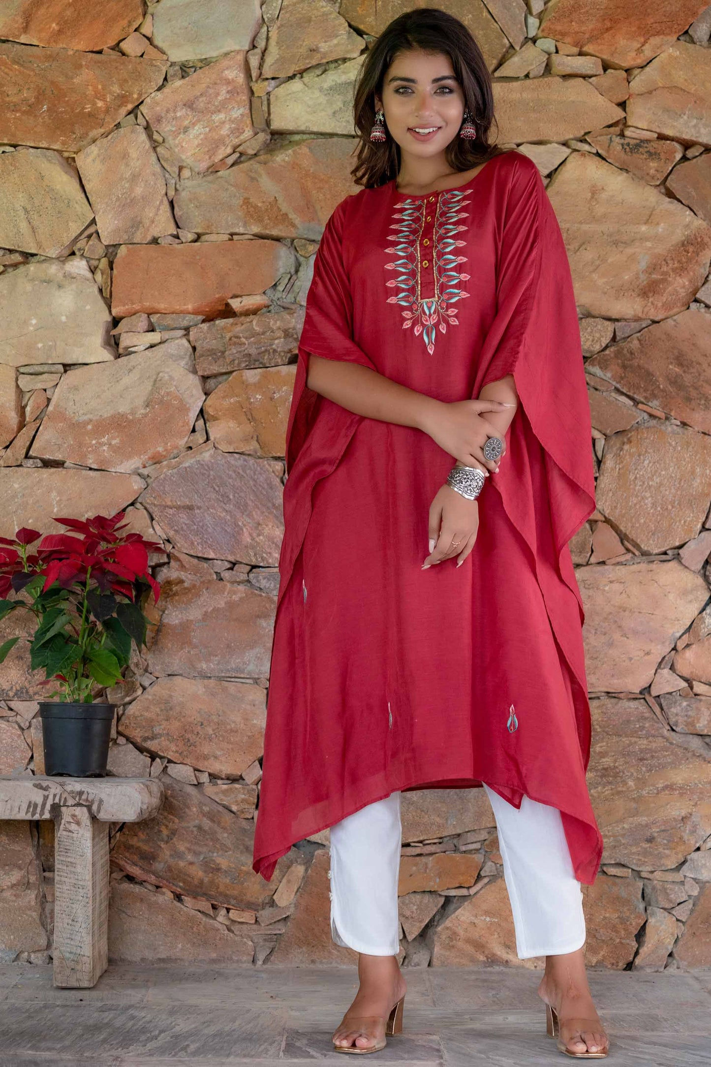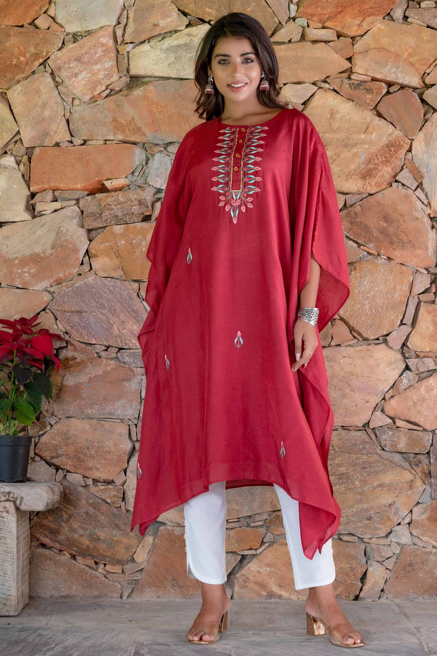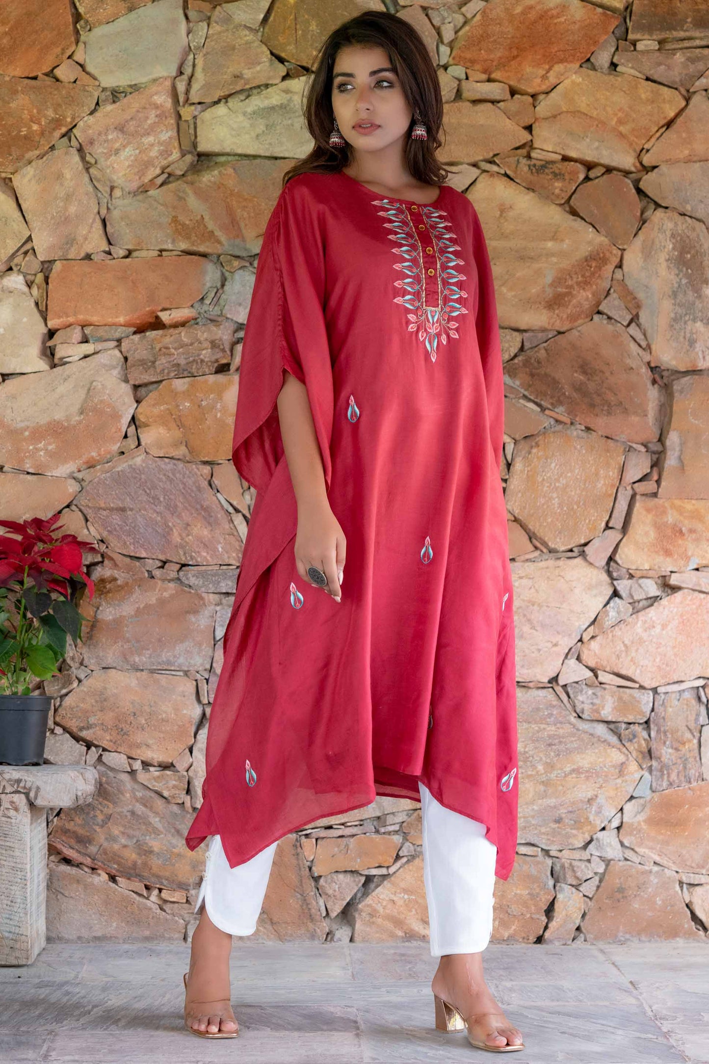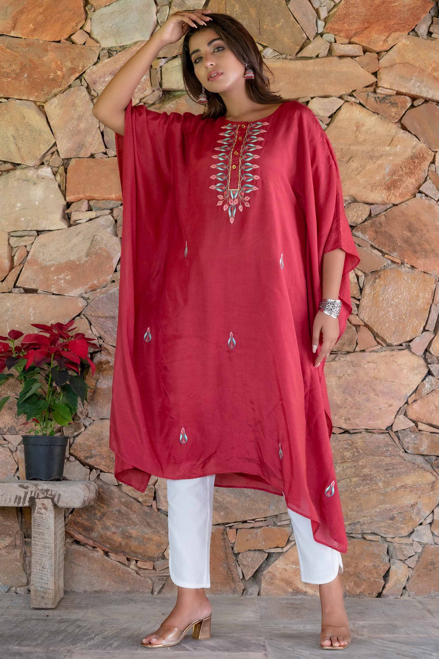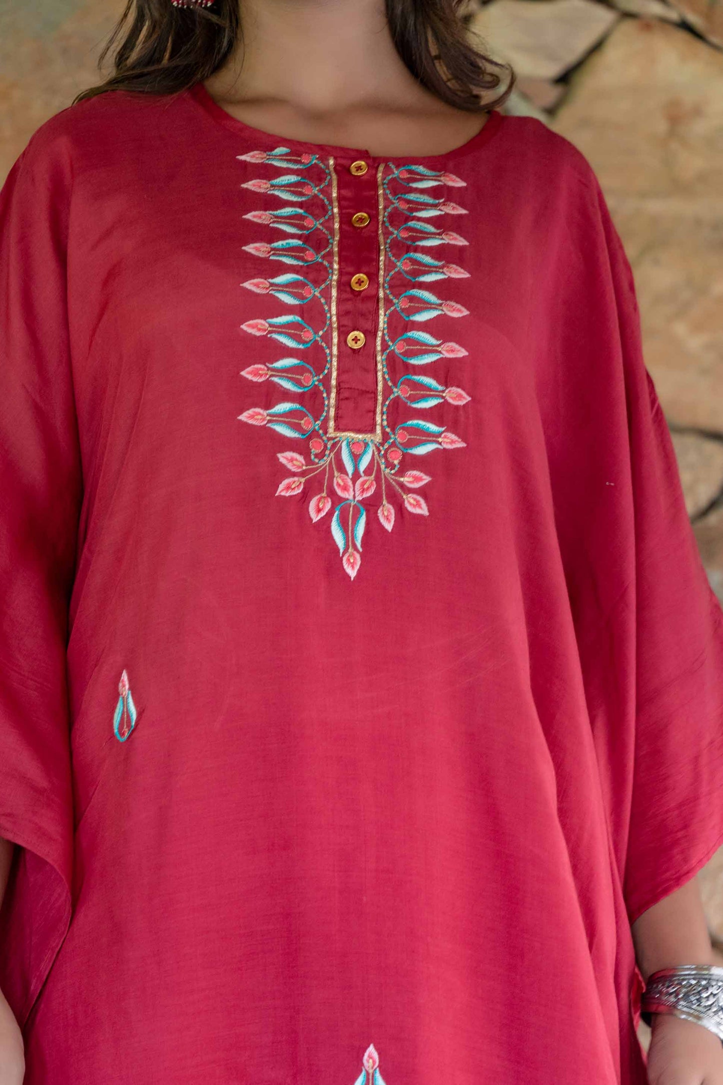 Celebrate special occasion with this beautiful summer friendly cranberry red muslin silk fabric embroidered kaftan dress.