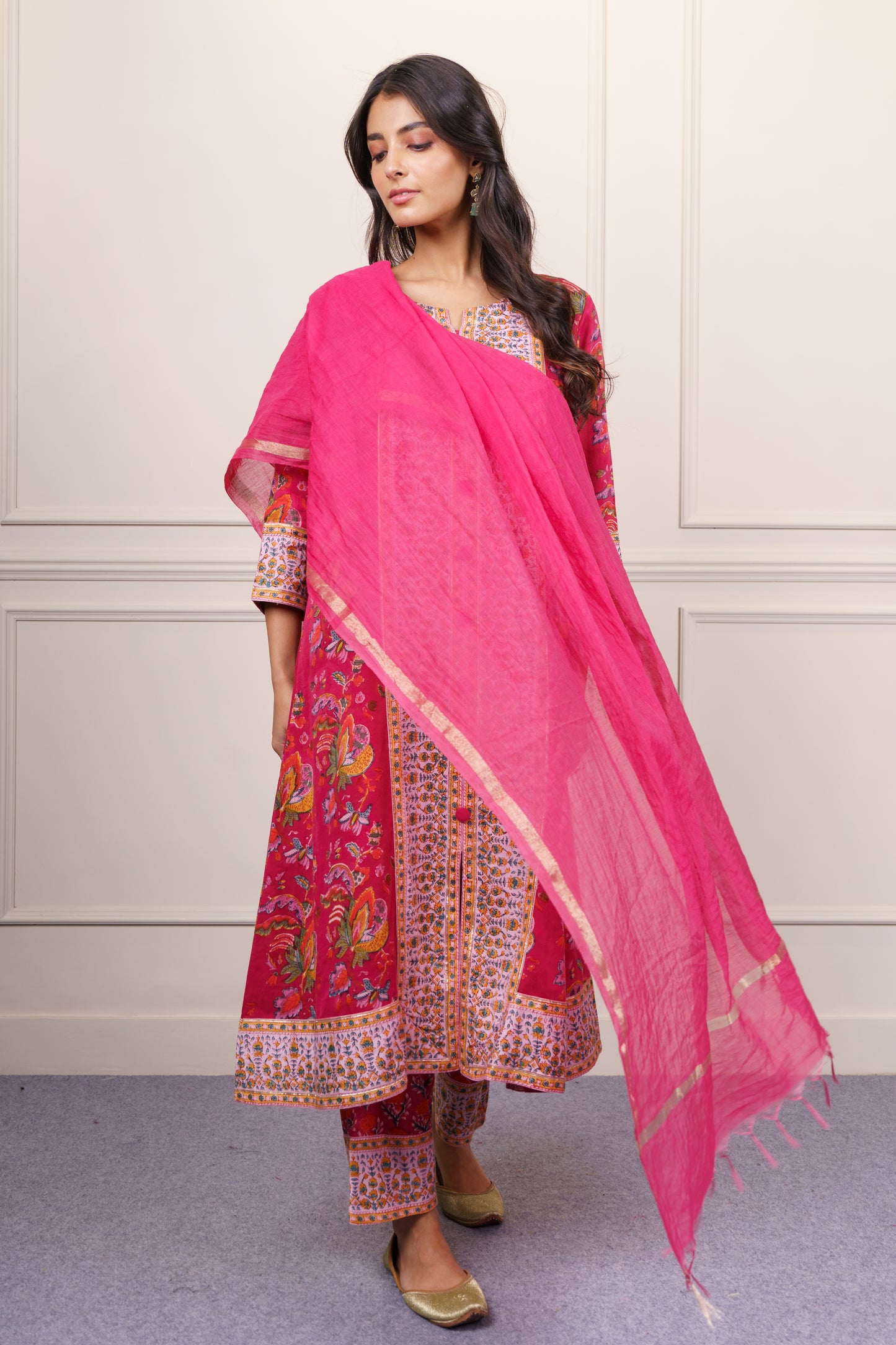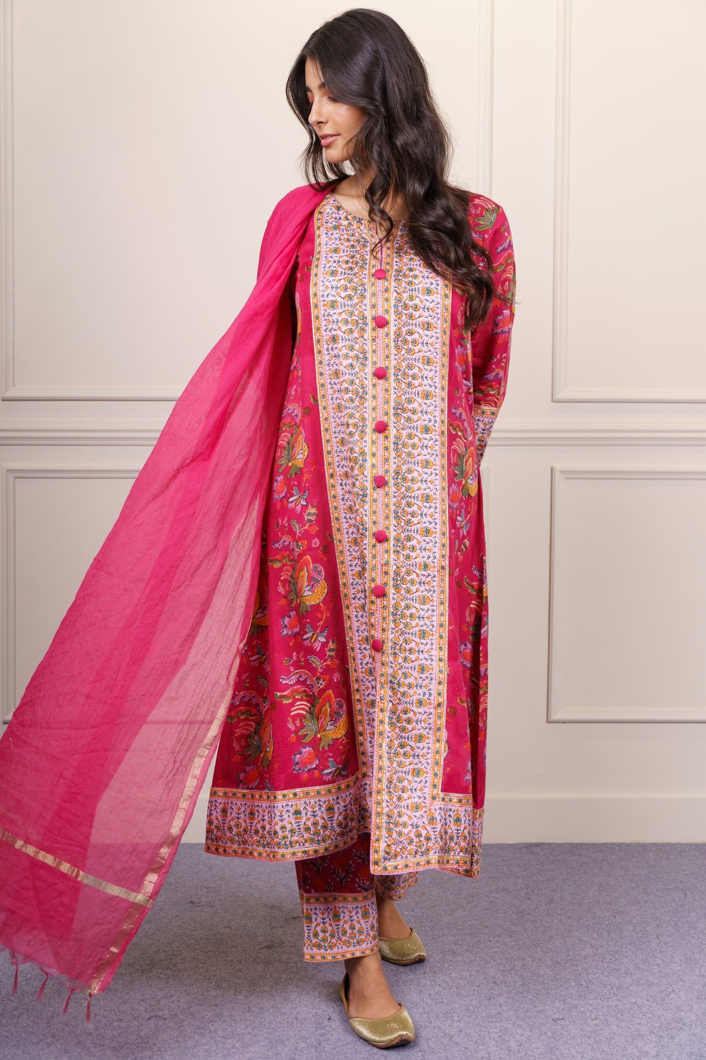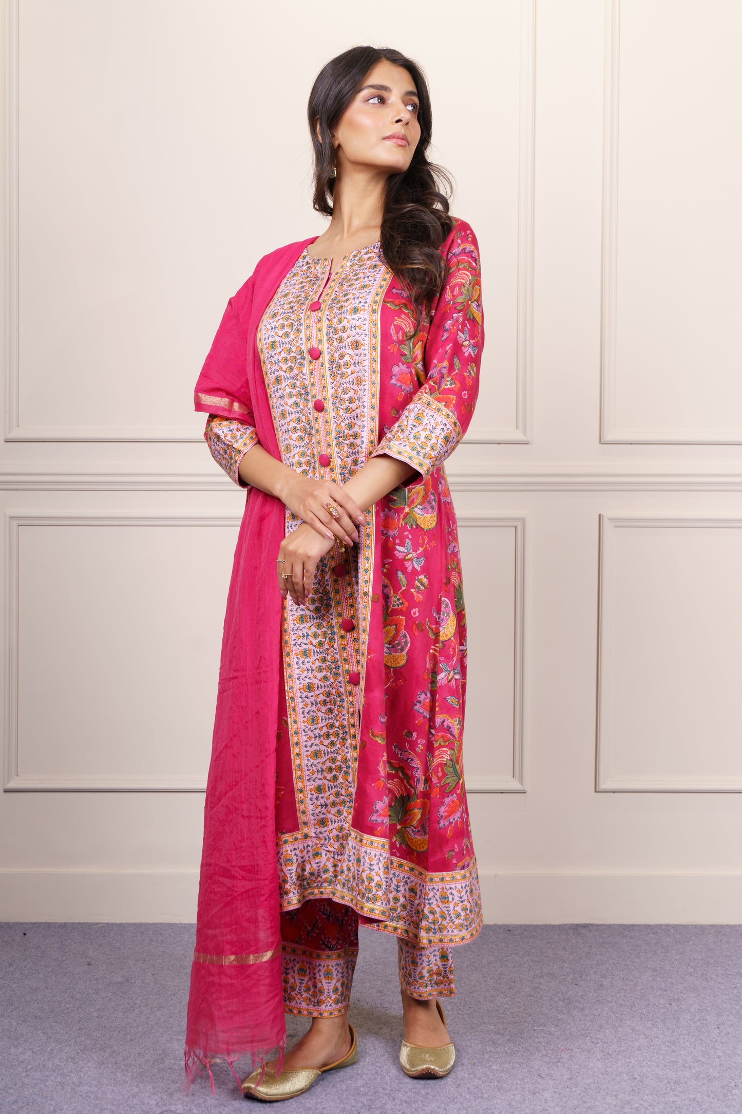 Deep pink base with multicolor floral and paisley hand block prints This striking kurta set With Chanderi Dupatta features a deep pink cotton flared kurta Set adorned with intricate multicolor floral and paisley hand block prints Bottom. A contrast-printed front panel with bold buttons and rich border detailing adds elegance. Paired with matching printed straight pants, this coordinated set is ideal for festive occasions, blending traditional artistry with modern flair.