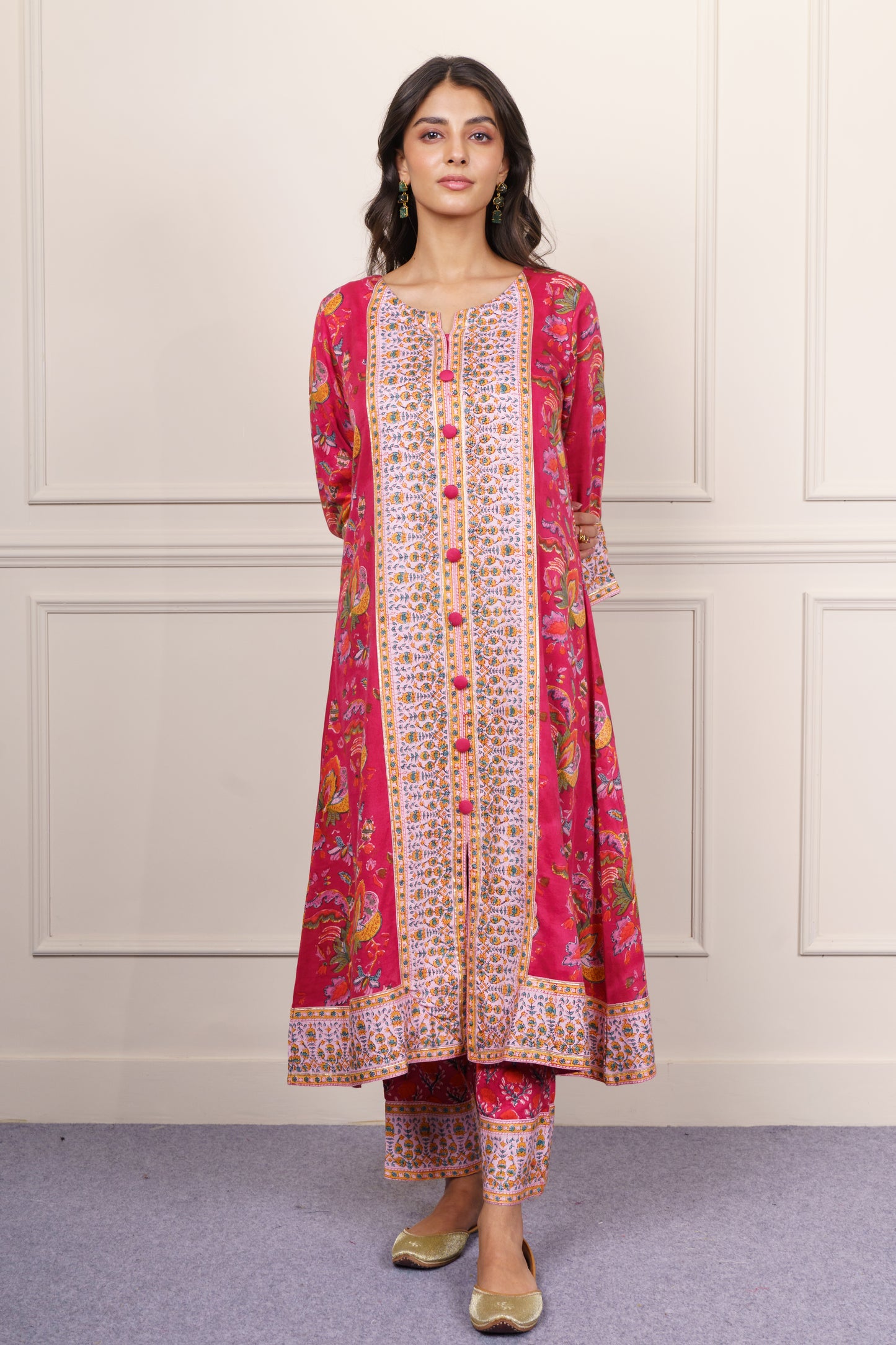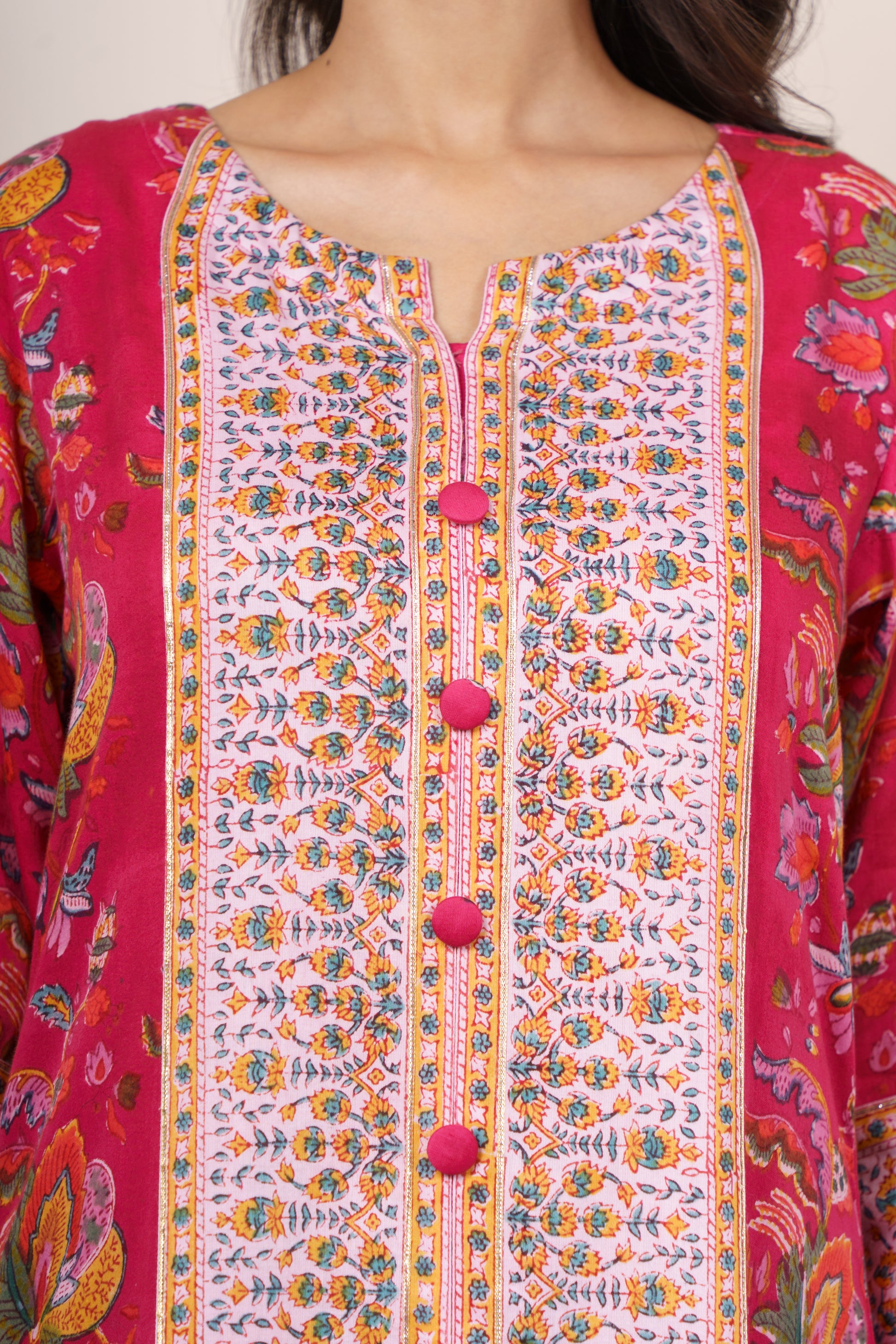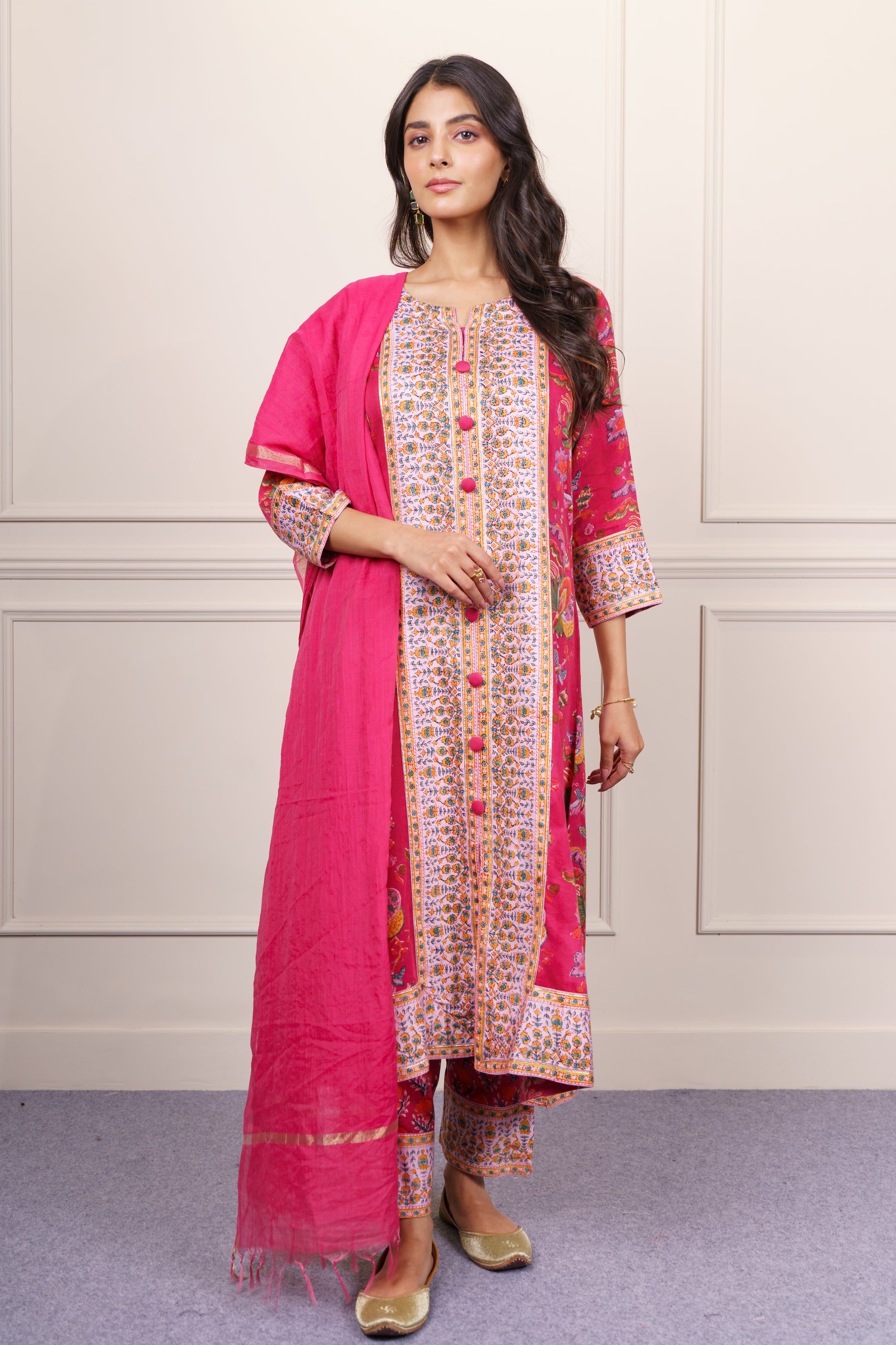 Deep pink base with multicolor floral and paisley hand block prints This striking kurta set With Chanderi Dupatta features a deep pink cotton flared kurta Set adorned with intricate multicolor floral and paisley hand block prints Bottom. A contrast-printed front panel with bold buttons and rich border detailing adds elegance. Paired with matching printed straight pants, this coordinated set is ideal for festive occasions, blending traditional artistry with modern flair.