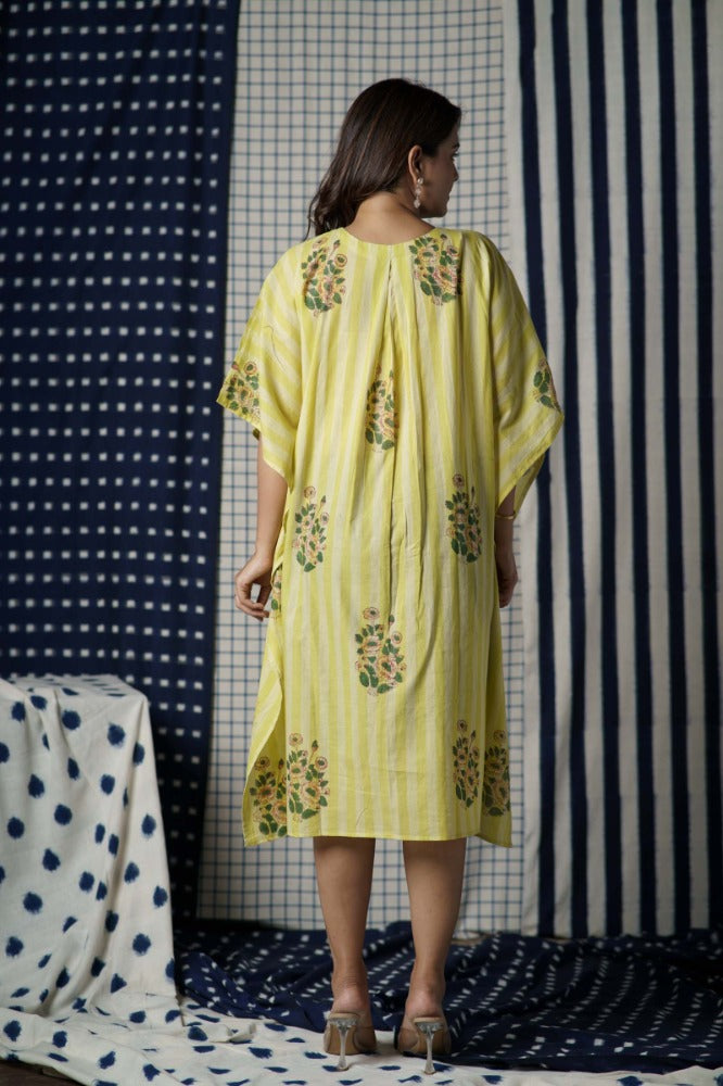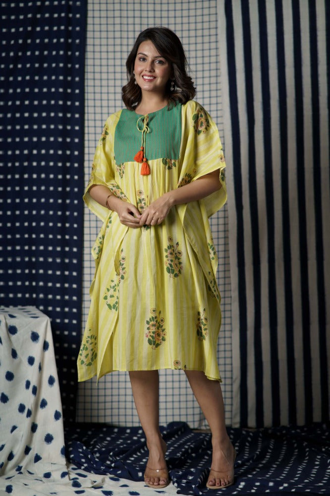 Green hand block printed kaftan dress in khari cotton fabric with thread detailing at the yoke and drawstring at the neck gives it an elegant look with summer styling.