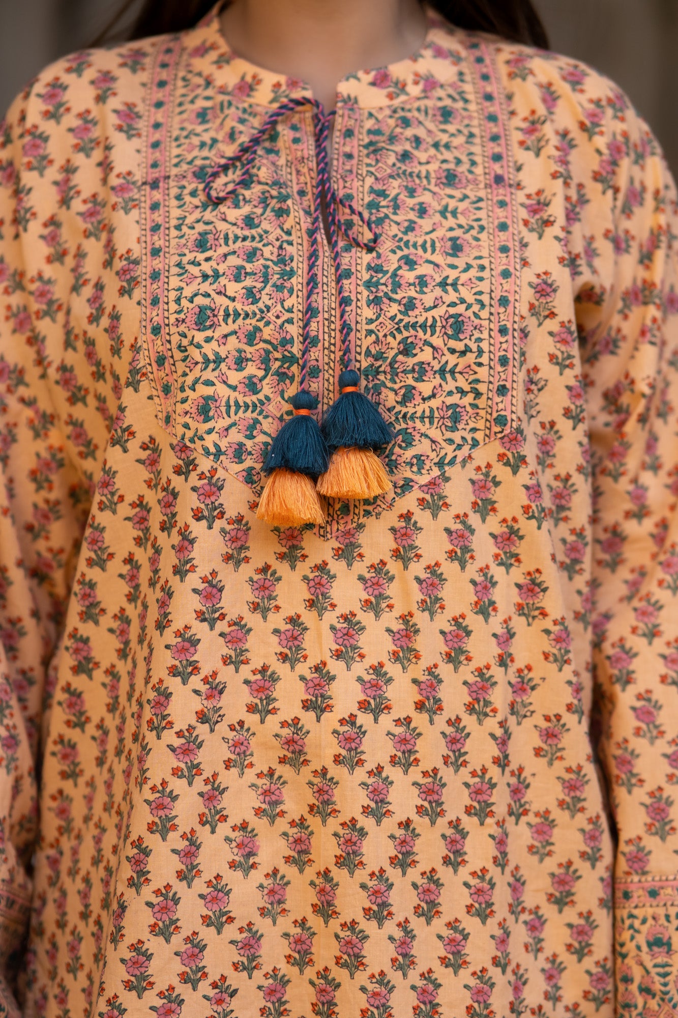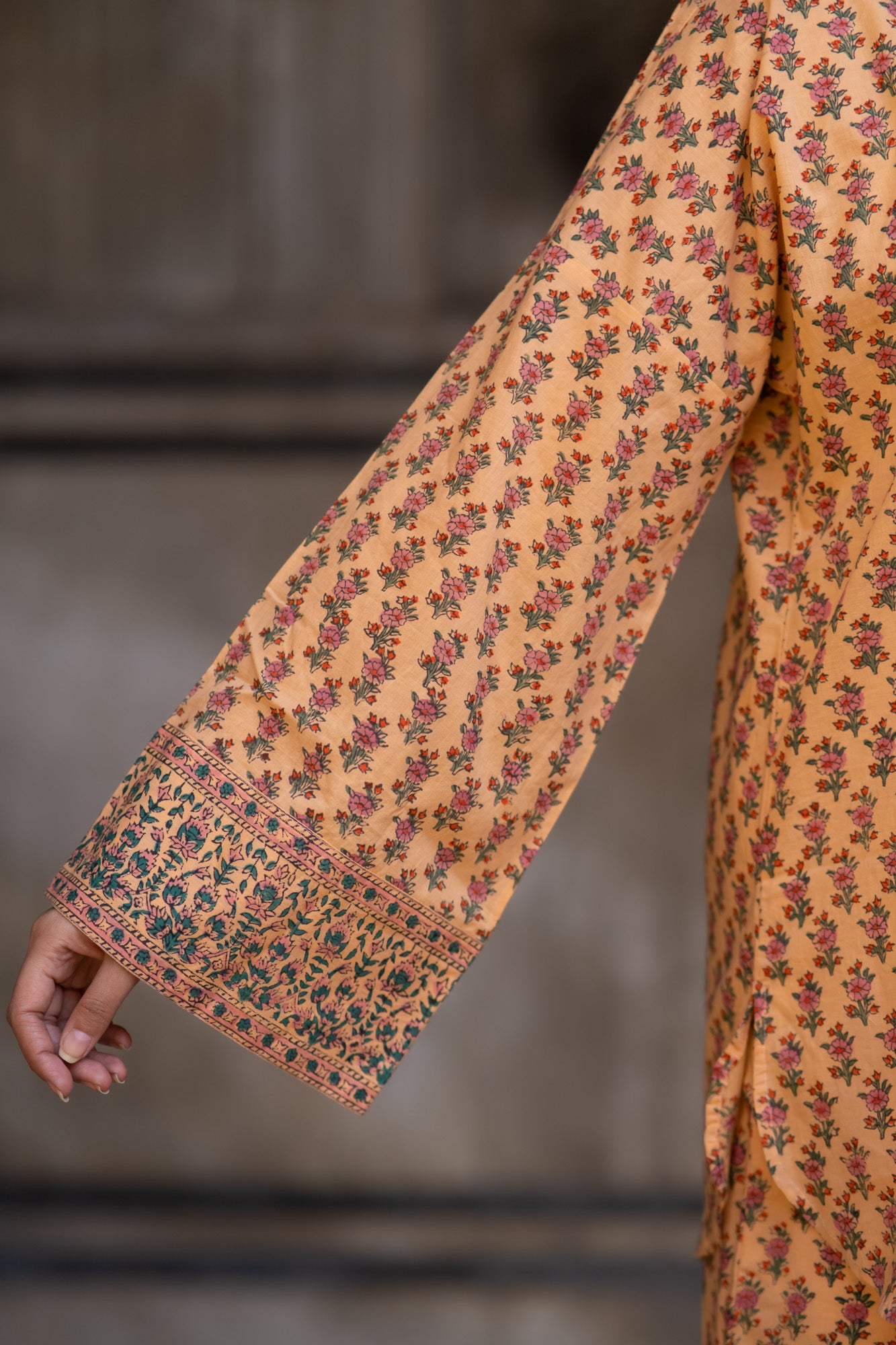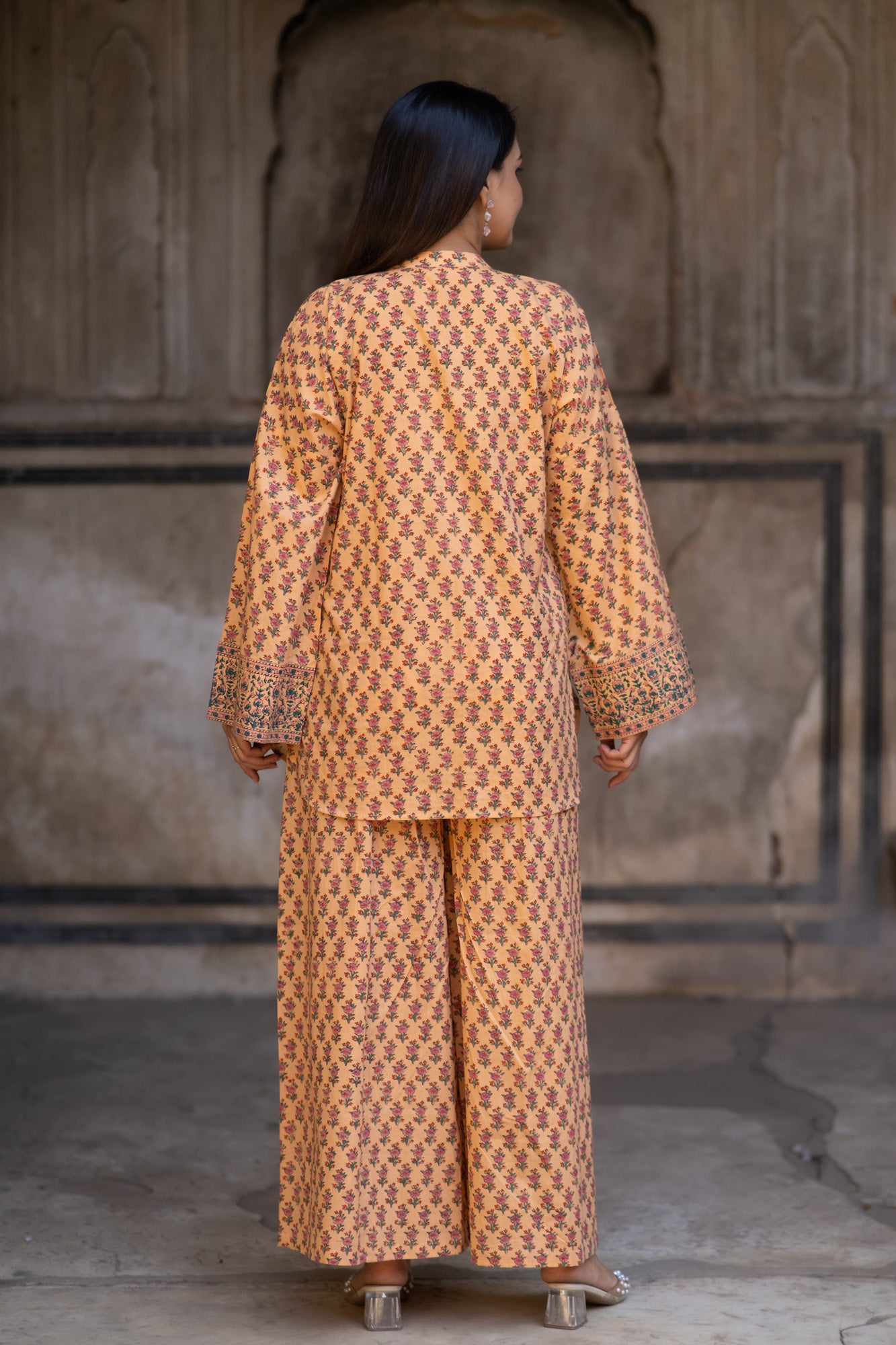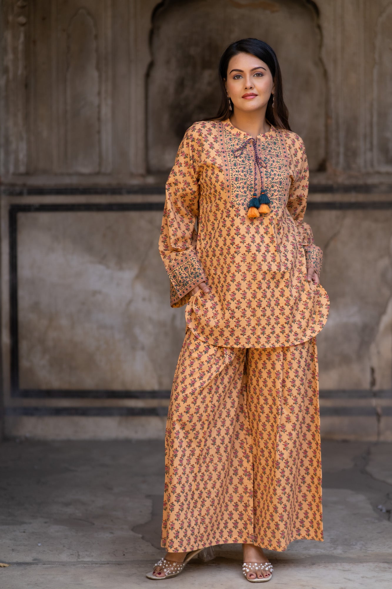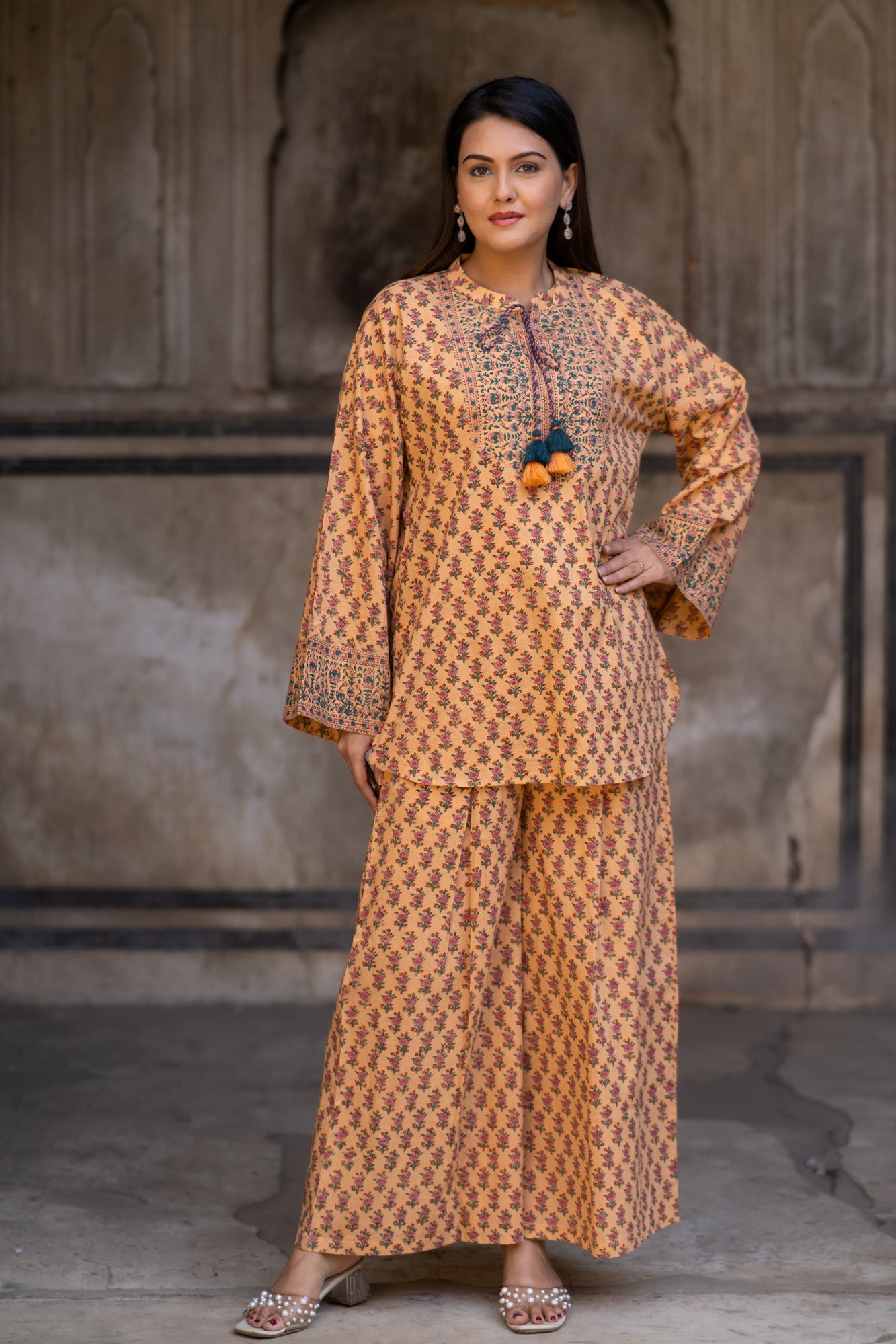 Hand block printed floral co-ord set makes it a perfect choice for all fashion lovers. This piece has border styling on the yoke and the sleeves.