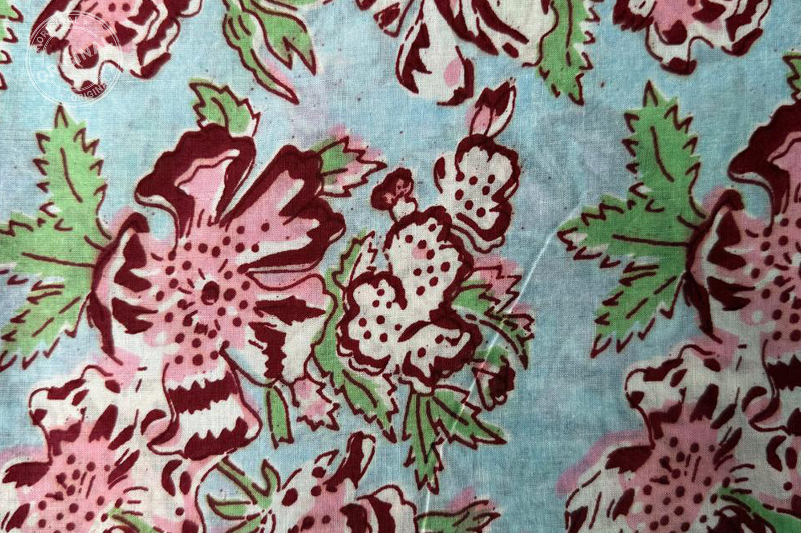 Sky Blue Floral Hand Block Printed Running Fabric Natural Dyed Dress Materiel HF6407