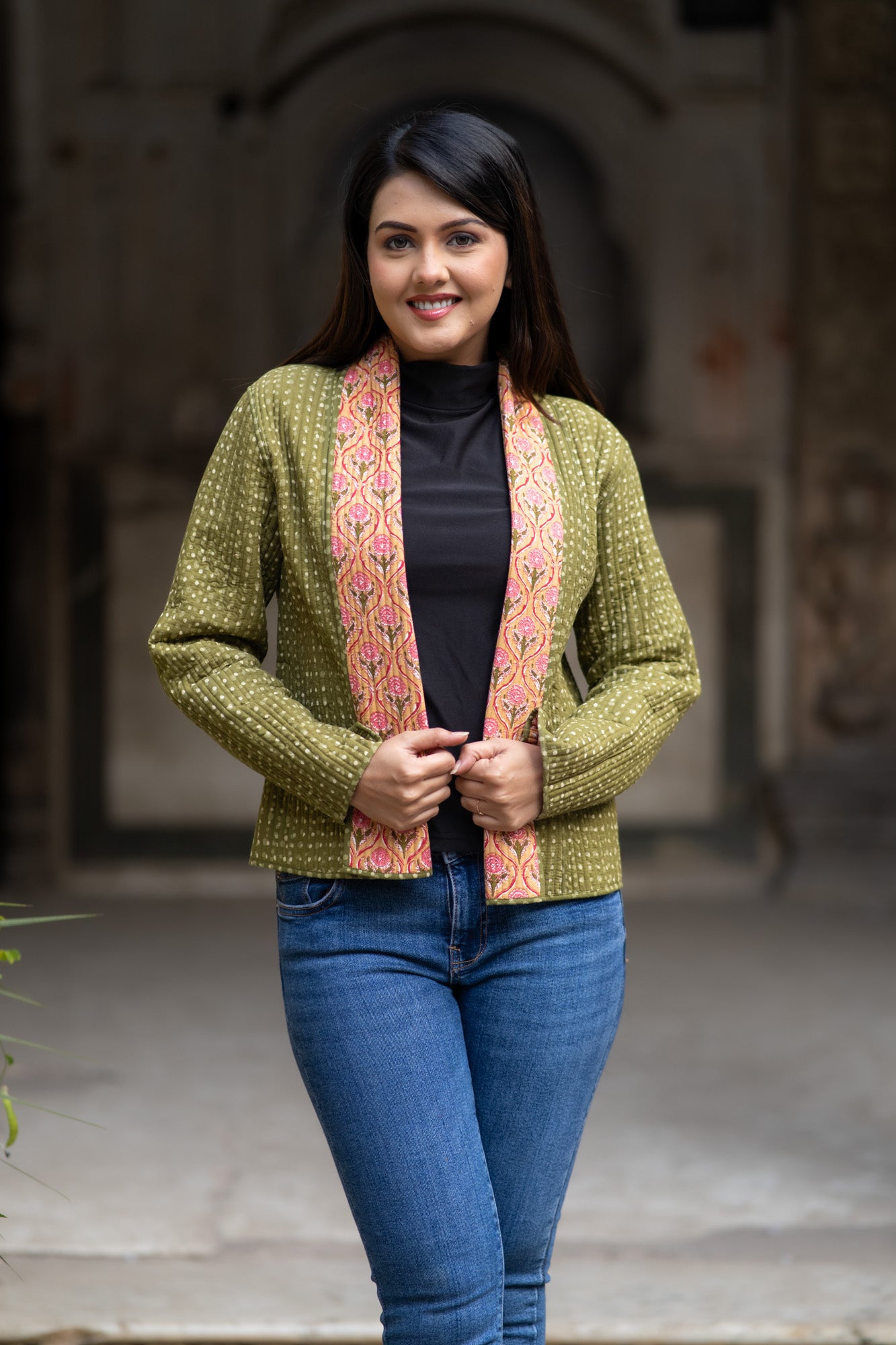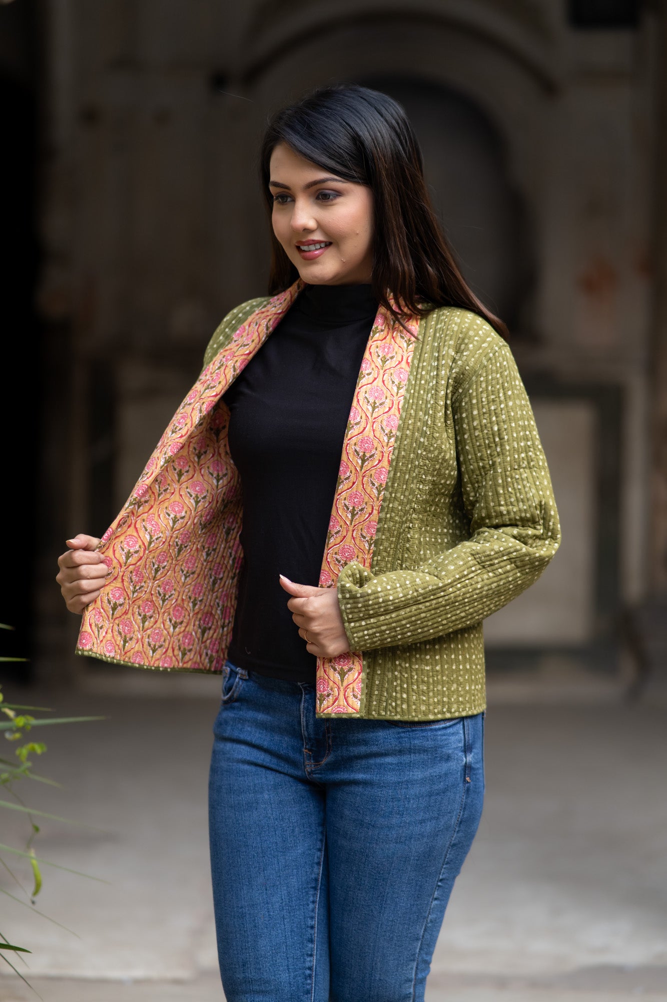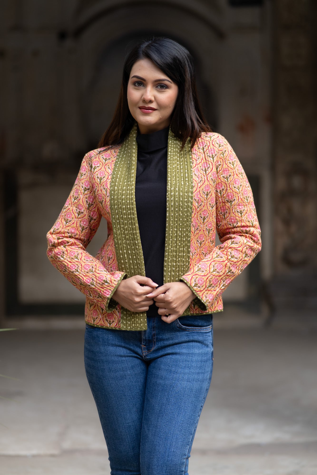 Hand floral block printed front open jacket with contrasting border panel in the front. This jacket has a printed fabric on the other side making it wearable from both the sides