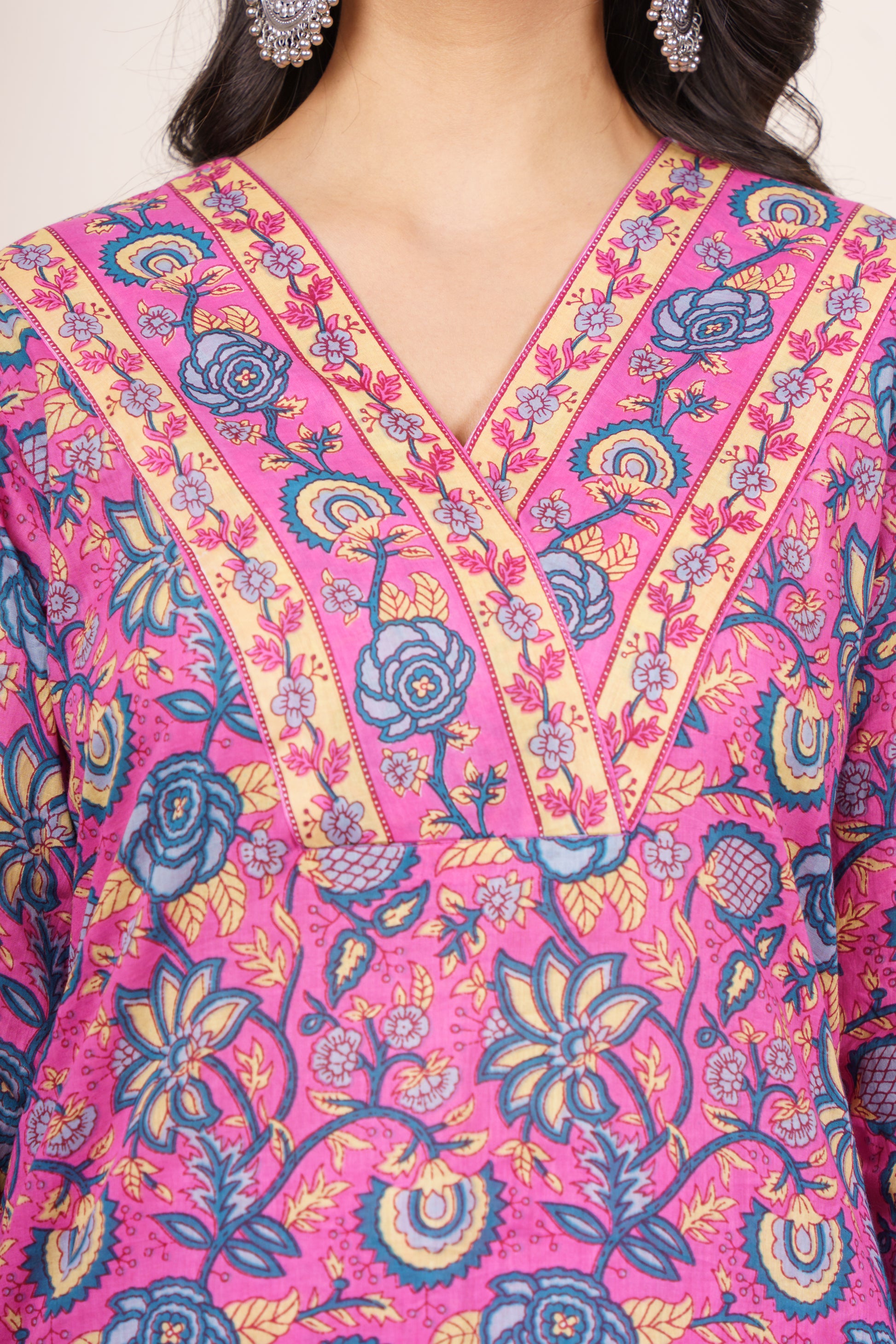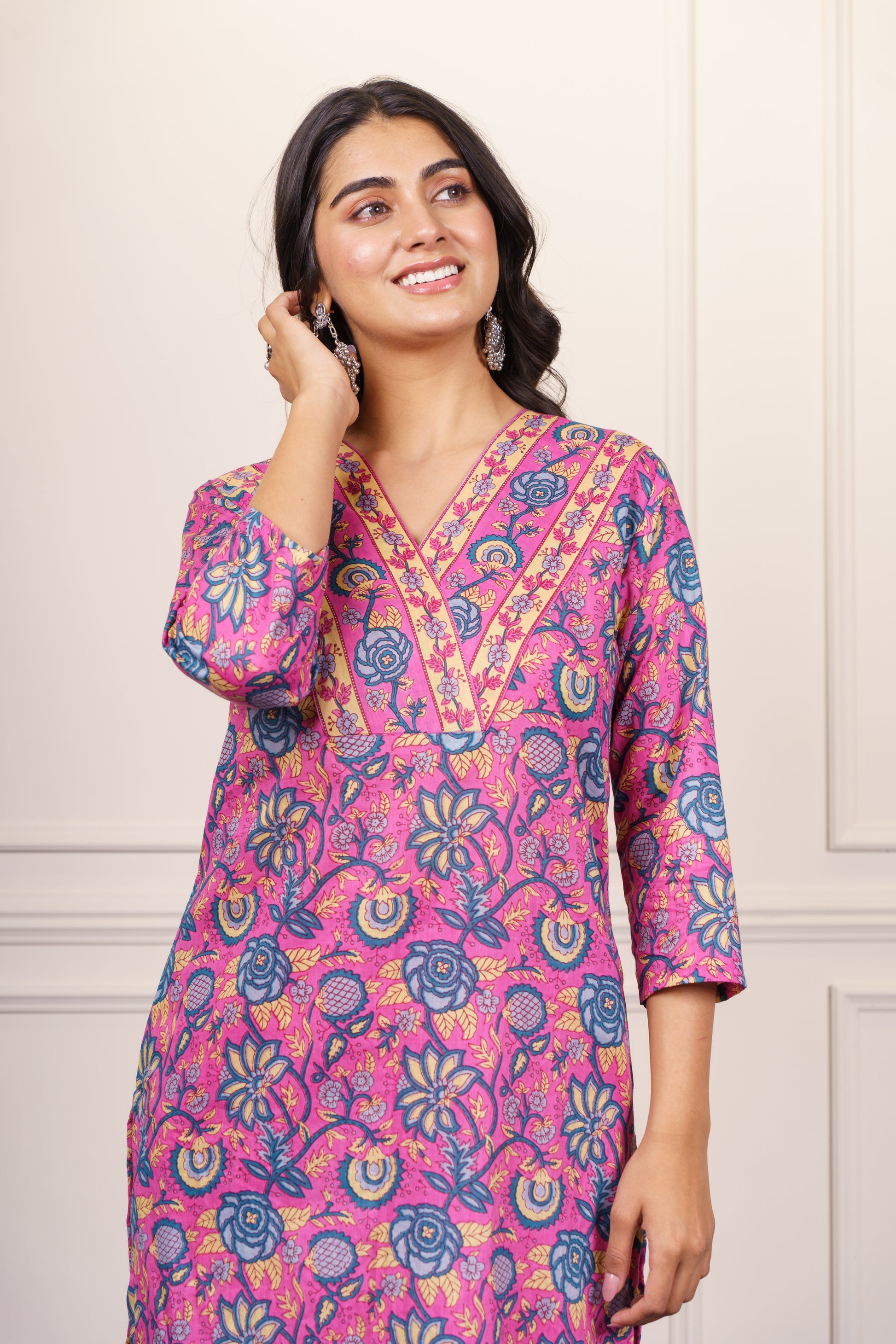 A delightful burst of color, this cotton kurta features vibrant pink and blue floral prints, enhanced by smart piping detail at the neckline. Crafted from breathable cotton, the straight silhouette and three-quarter sleeves offer comfort with elegance. Ideal for everyday wear or casual outings, this kurta adds cheerful sophistication to your ethnic wardrobe.