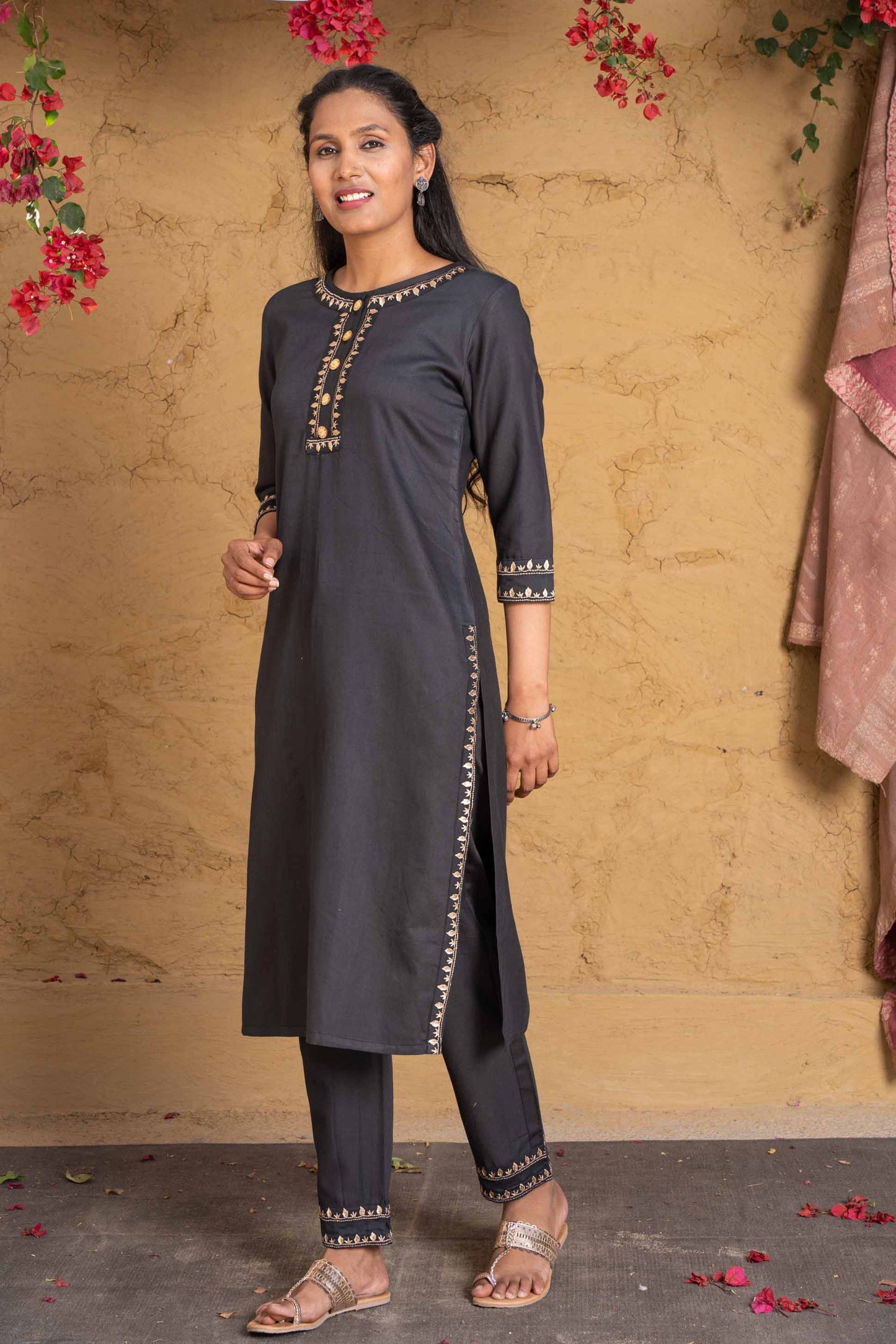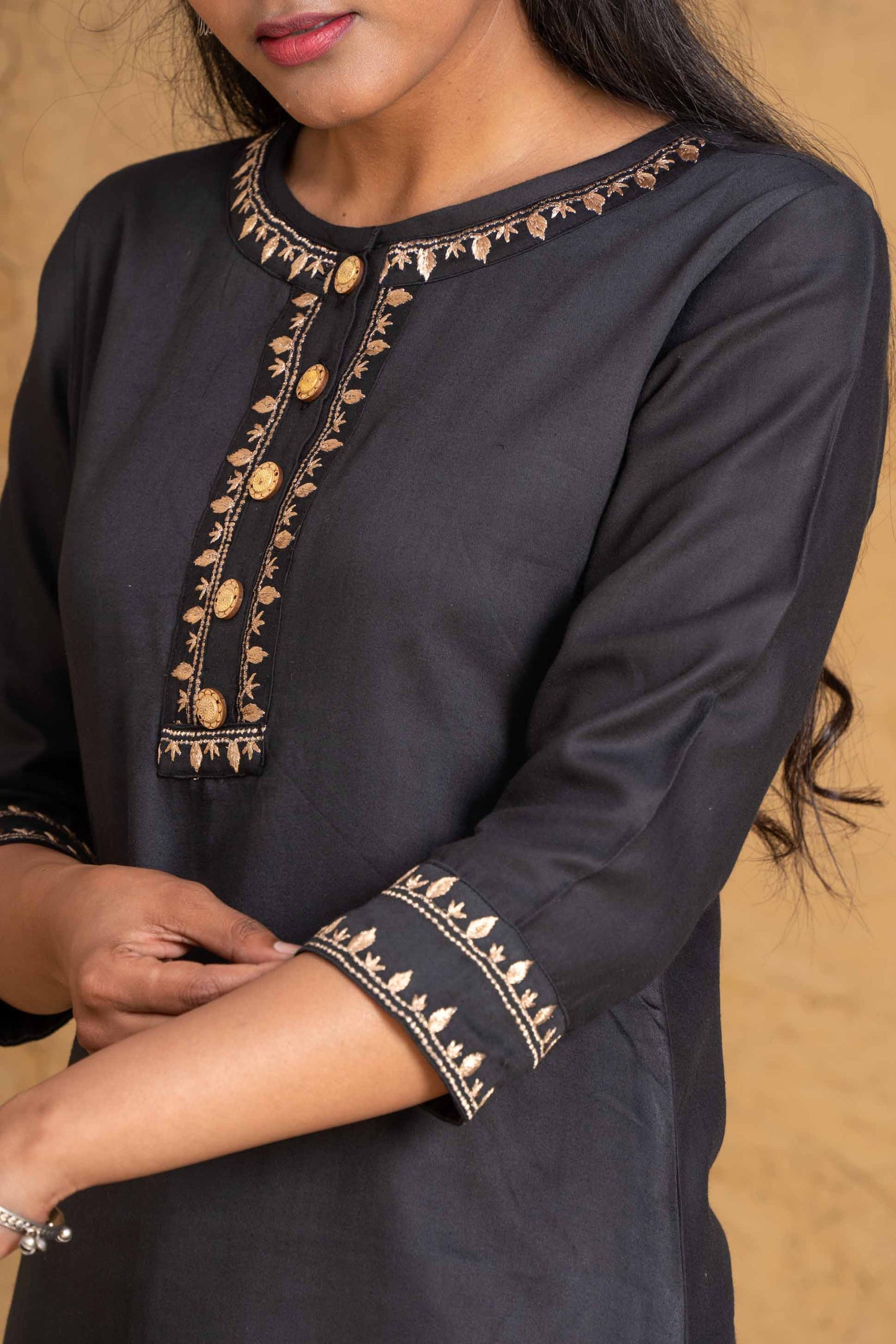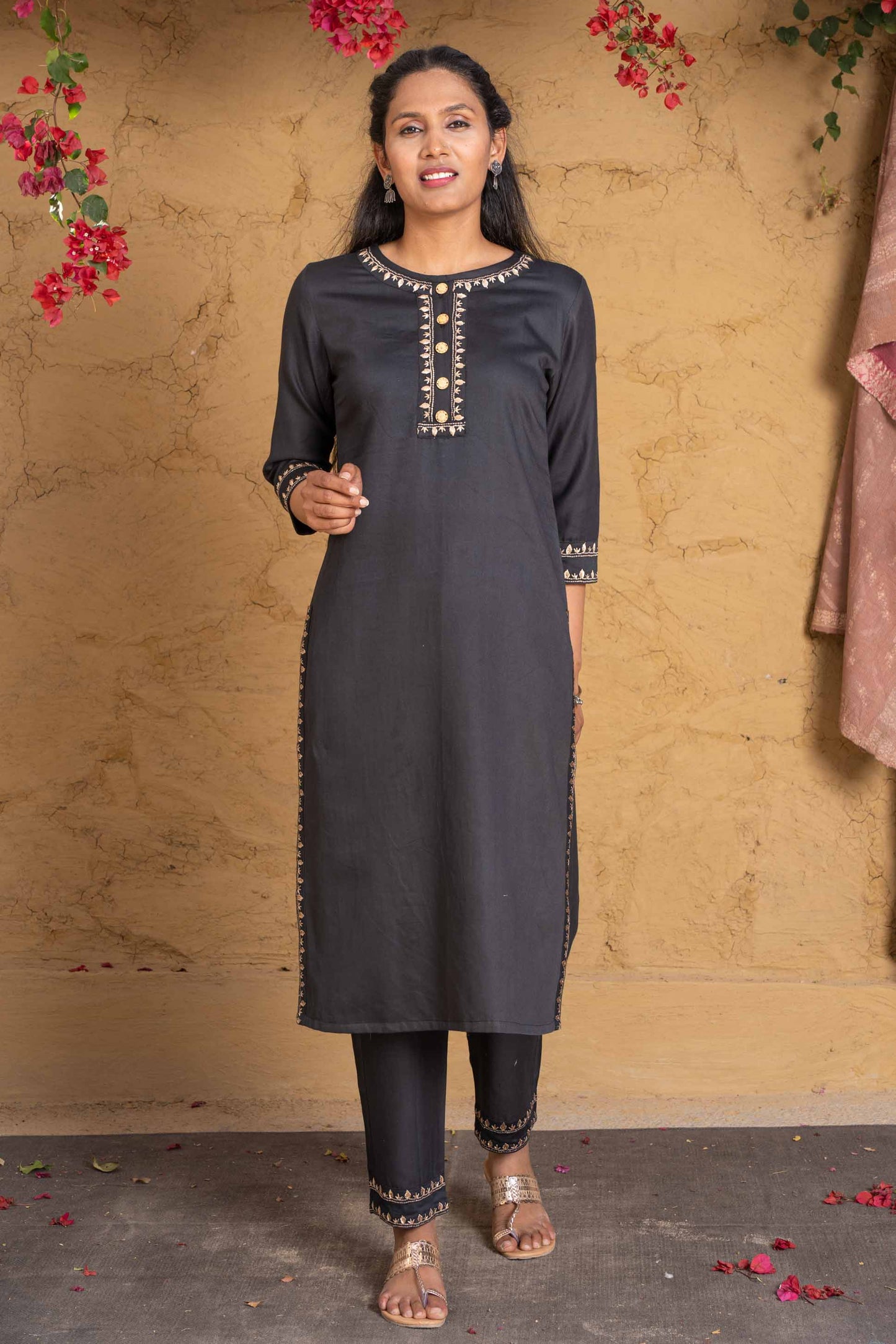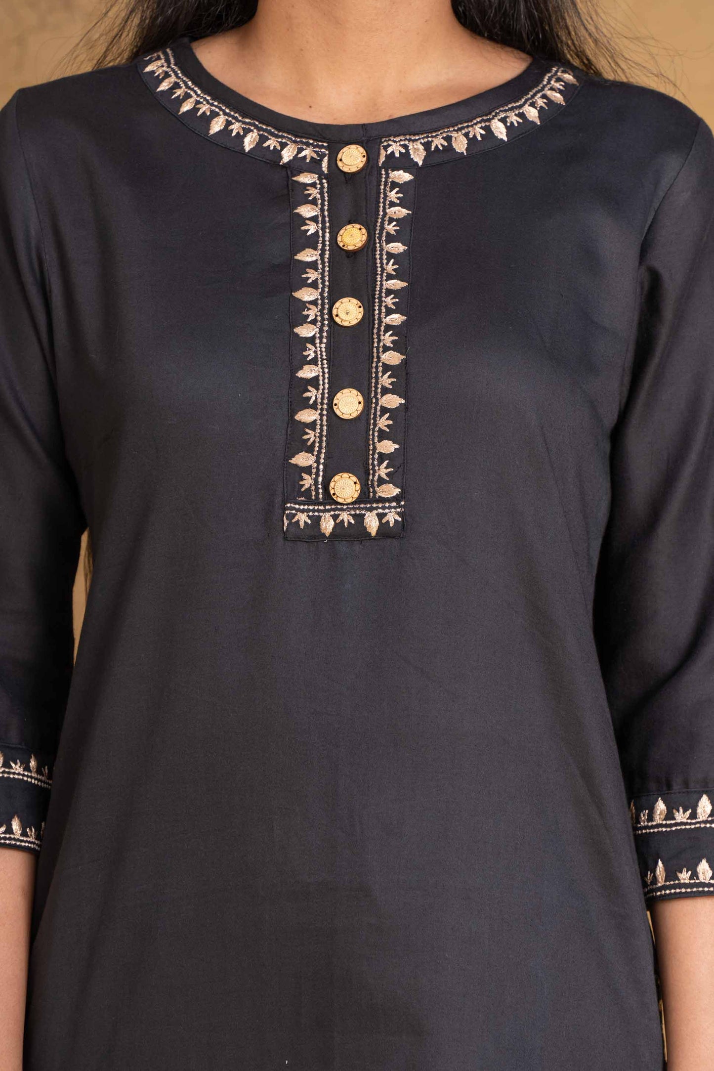 Three forth sleeves golden zari embroidered kurta pant set in jet black color.