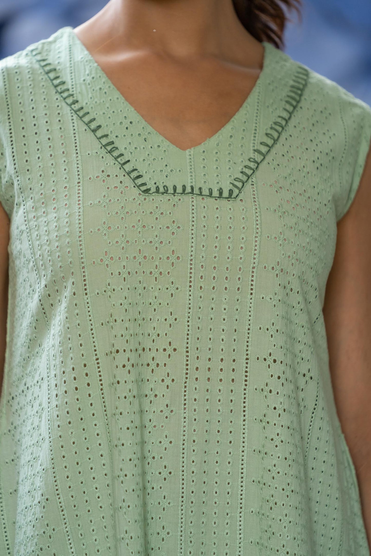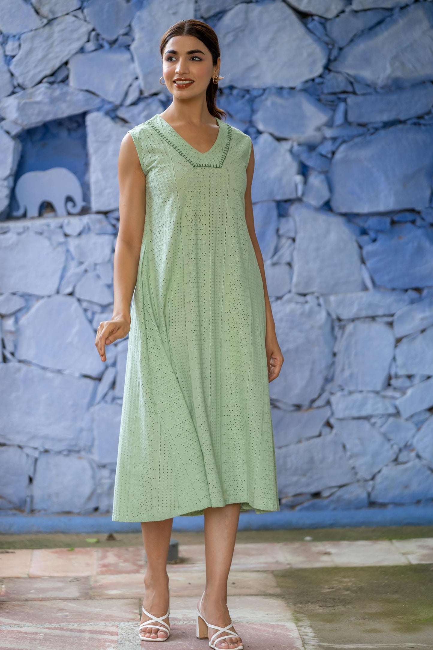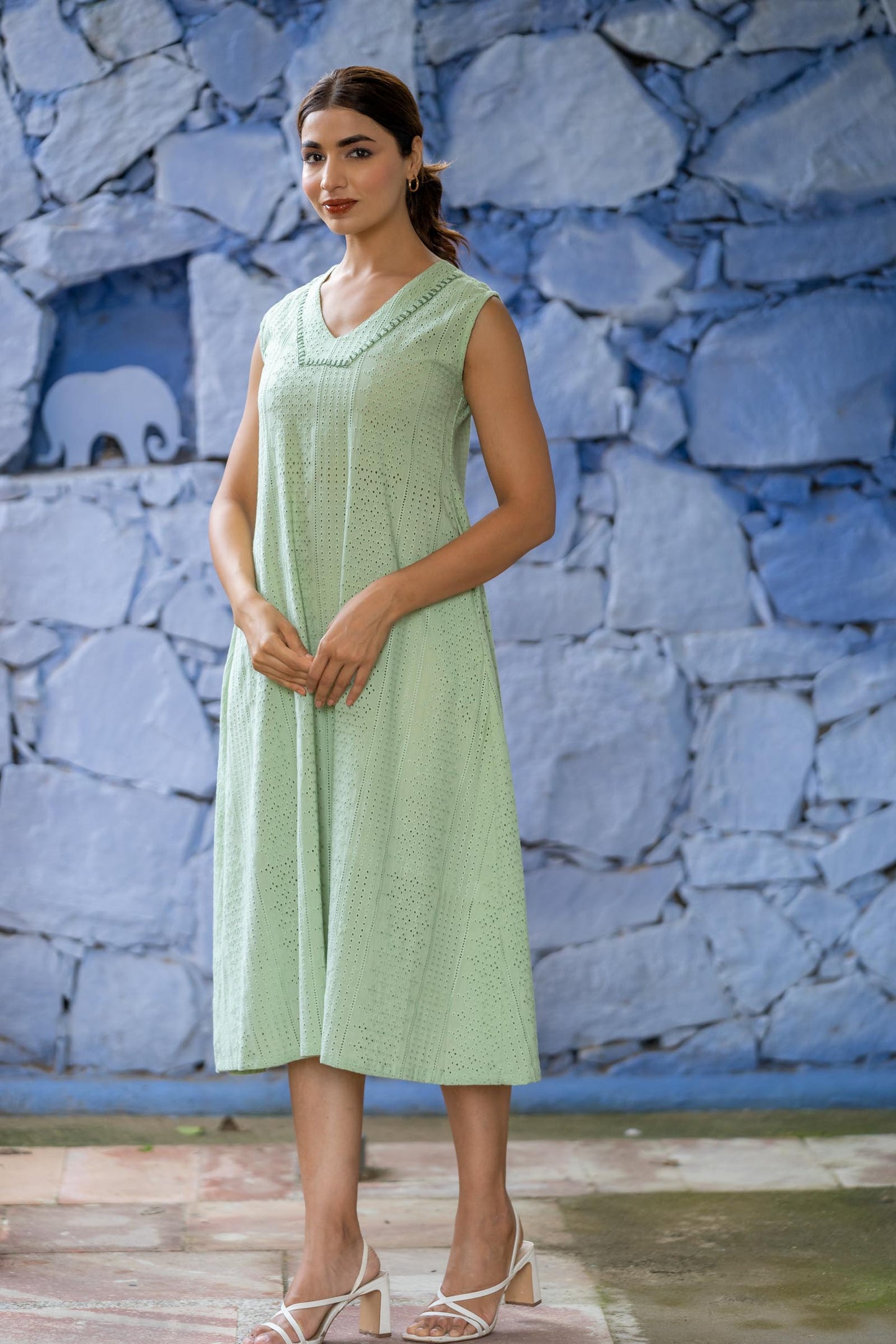 GREEN CHIKANKARI SLEEVELESS DRESS-NFD63
