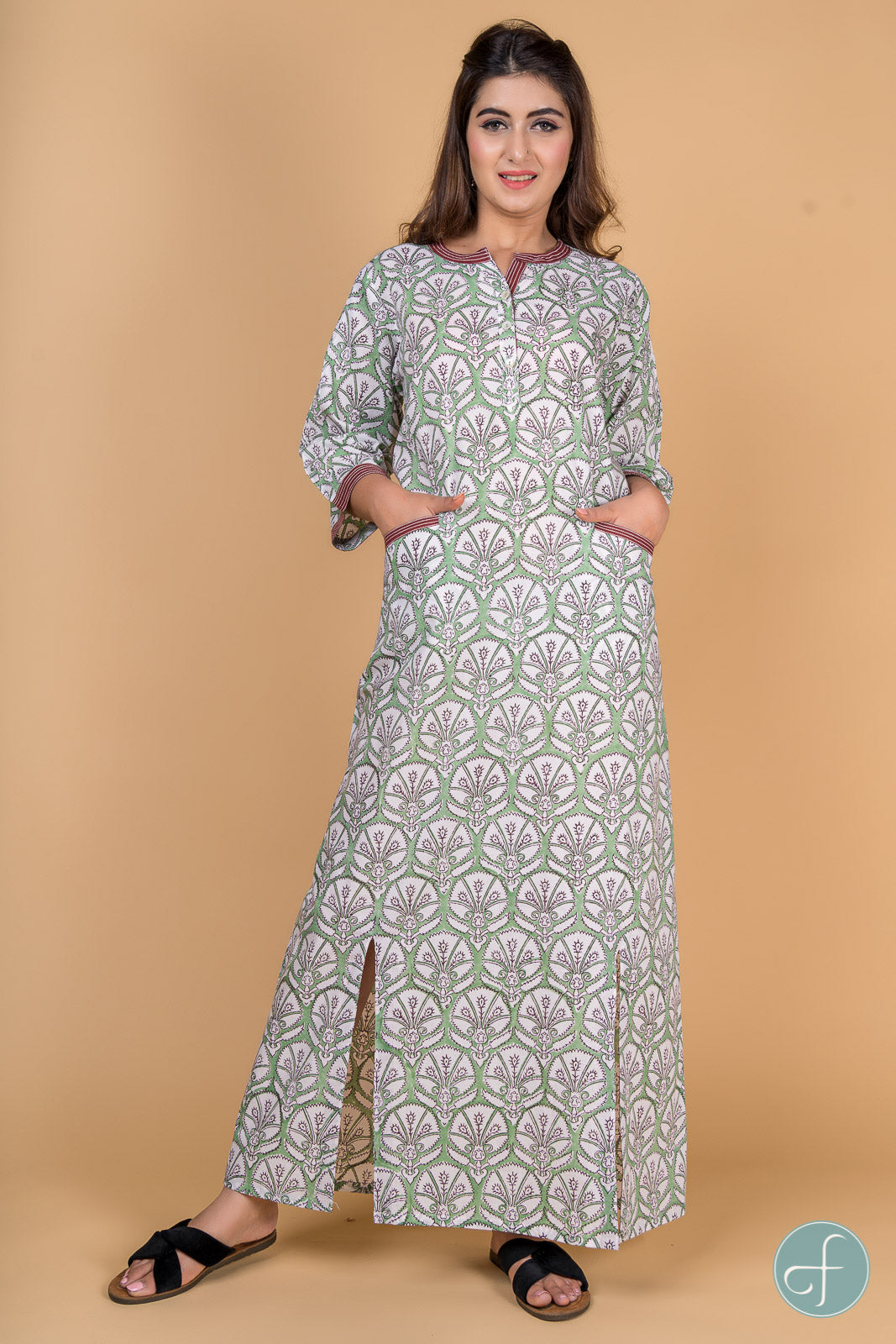 Flowing and Comfortable Cotton Nighty with Sleeves. It has front slits and pocket details.