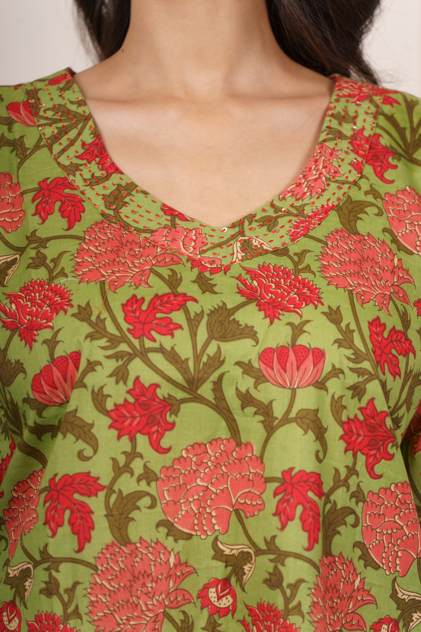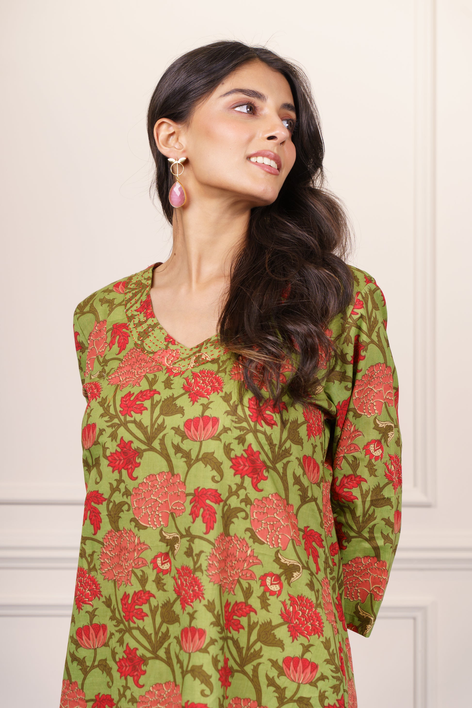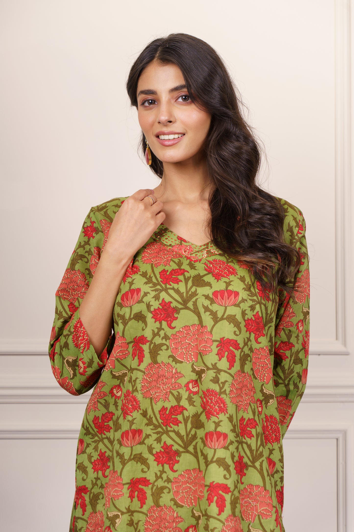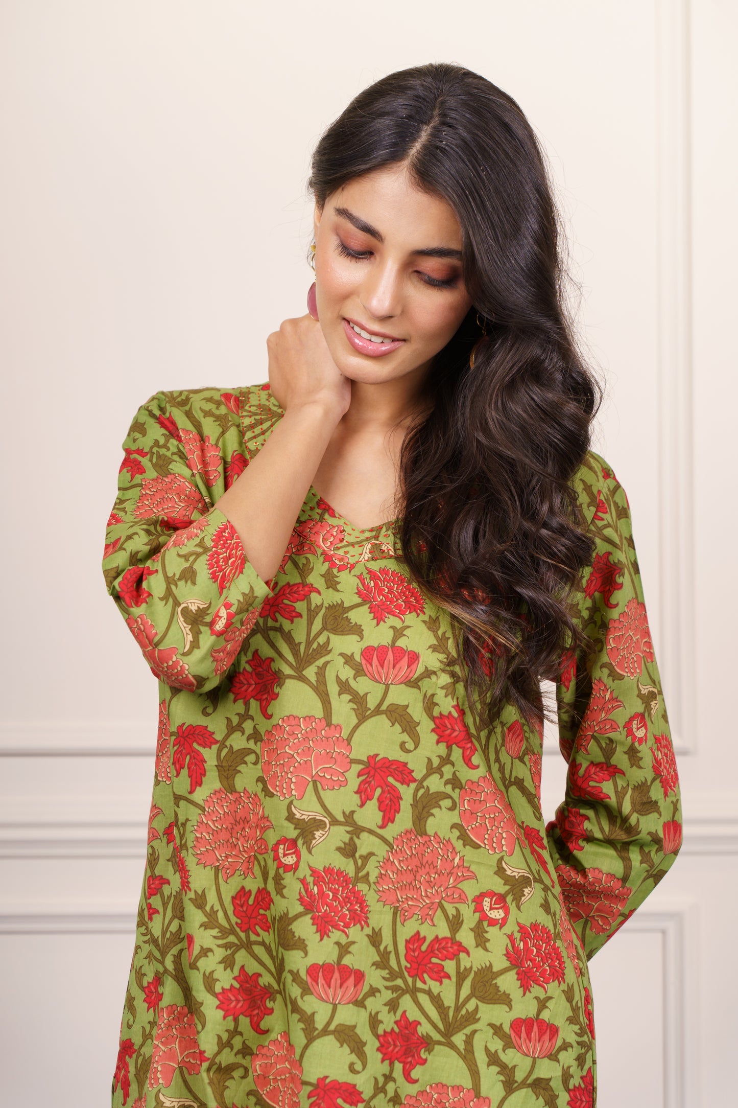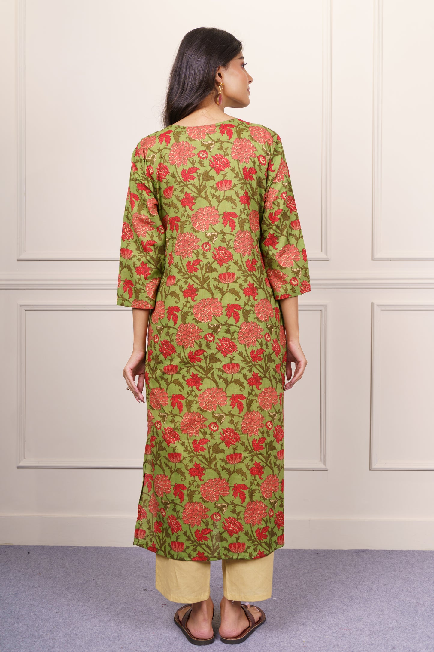 This charming olive green cotton kurta showcases a bold floral block print in shades of red and peach, adding vibrancy to your ethnic wardrobe. Designed with a comfortable straight silhouette, V-neckline, and 3/4th sleeves, it offers both elegance and ease. Perfect for everyday wear or casual gatherings, the breathable fabric ensures comfort throughout the day.