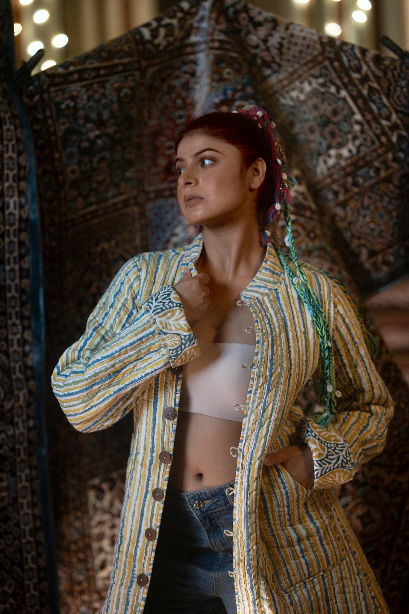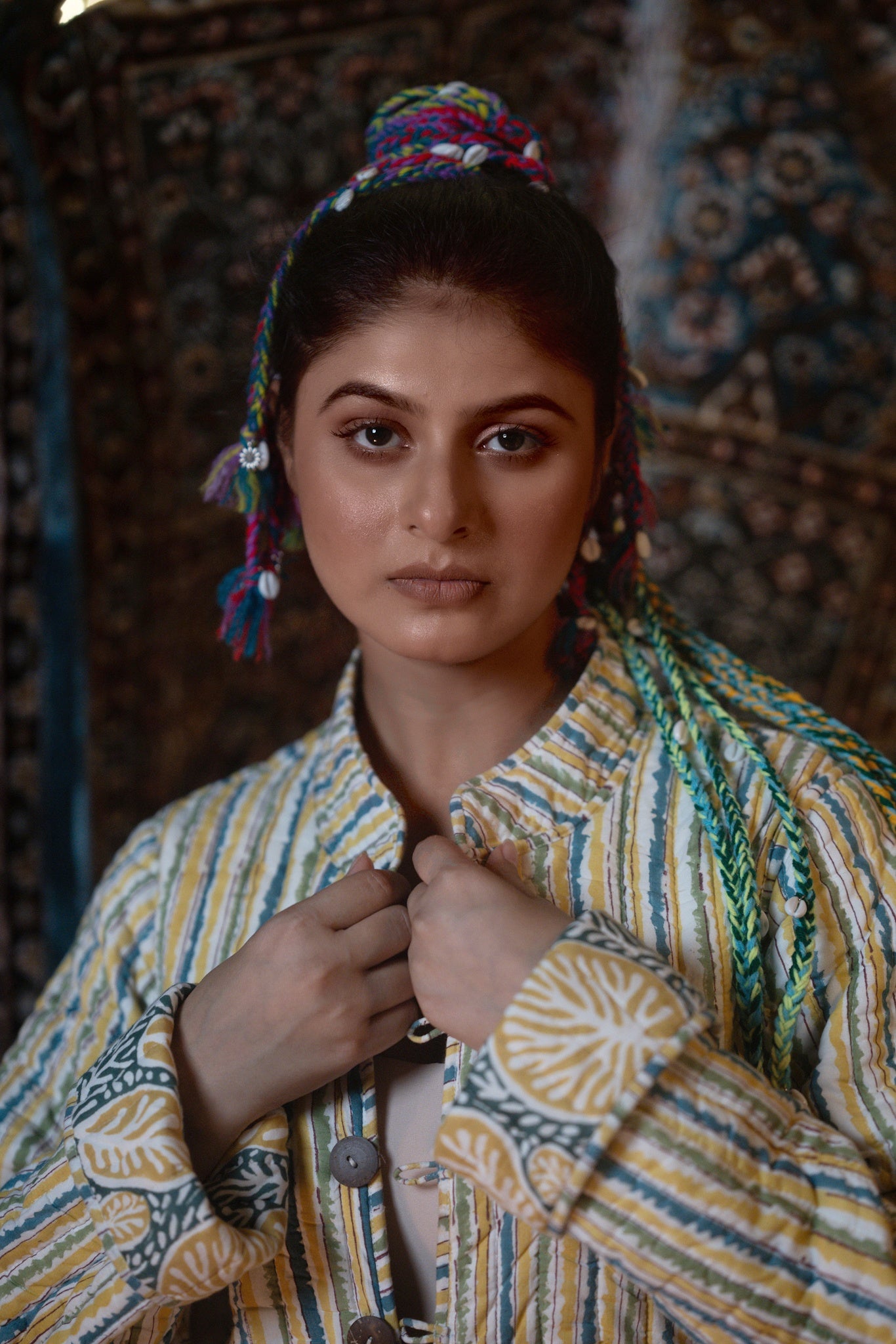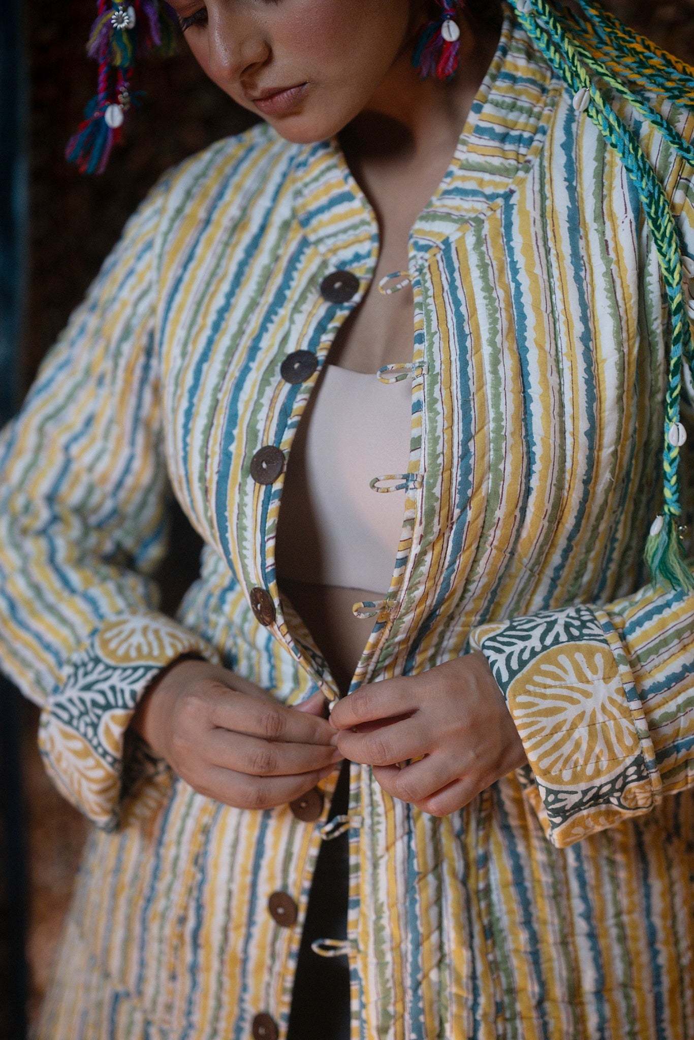 Beautiful hand block printed quilted coat with long sleeves that can be folded to add style to this winter outfit. The button closure coat has a printed fabric at the other side making it wearable from both the sides.