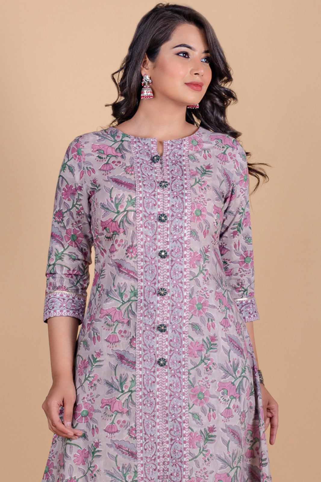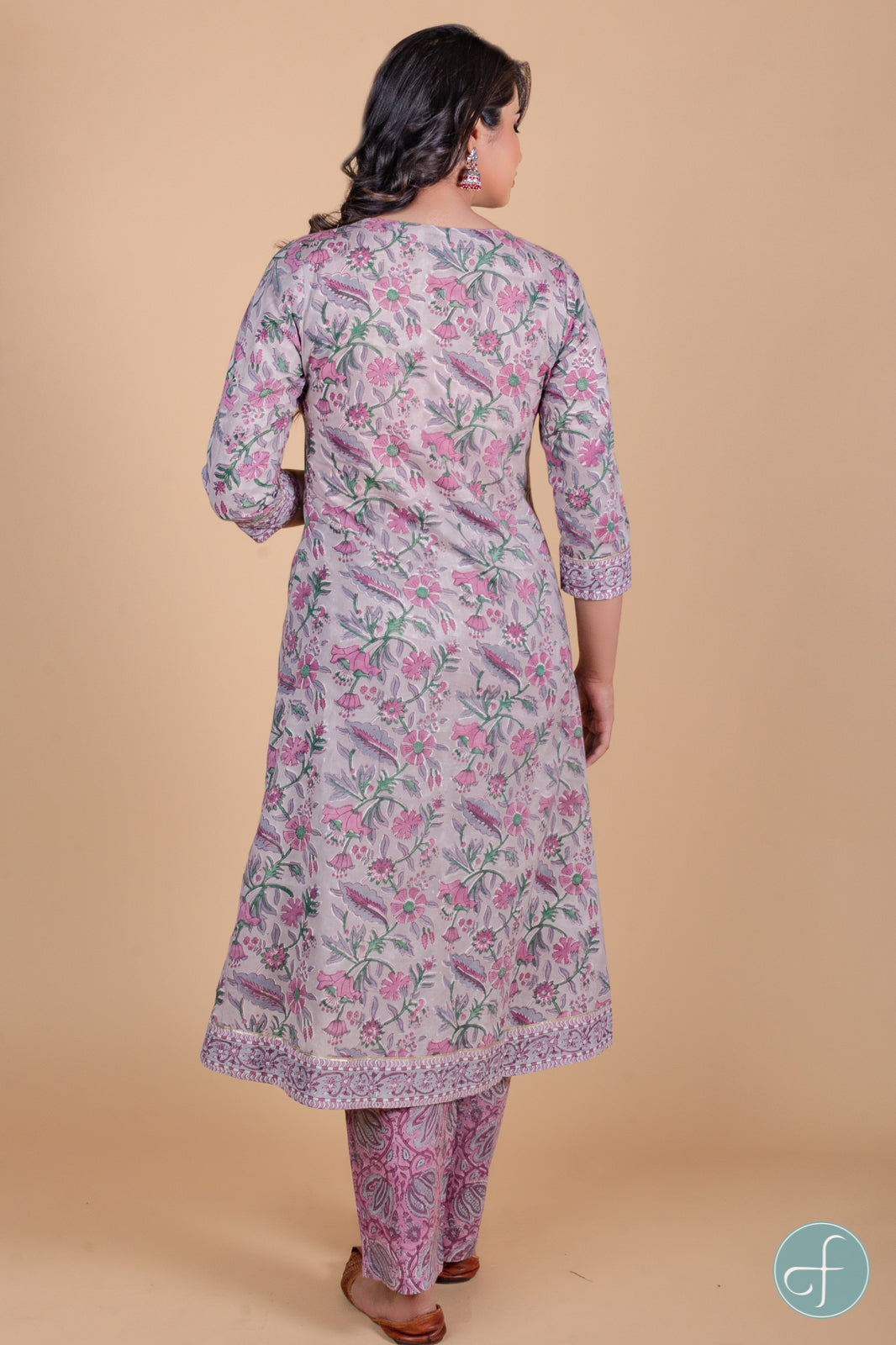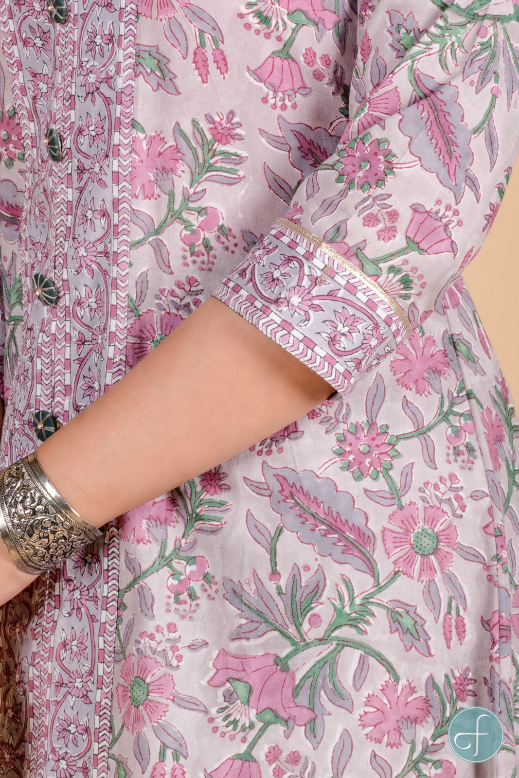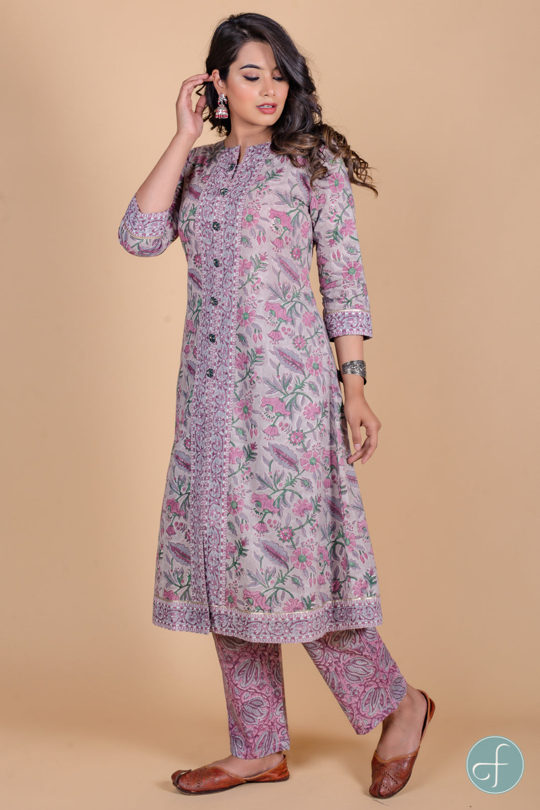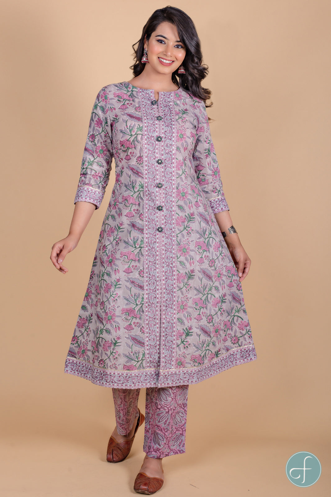 A-Line kurta dipped in grey base color with floral block print is a perfect choice for the summer season. This 3/4th sleeves kurta is embellished with gota buttons throughout the length. The piece has beautiful borders at the front and flair. Gota detailing can be seen on the neck, sleeves and the flair of the kurta.