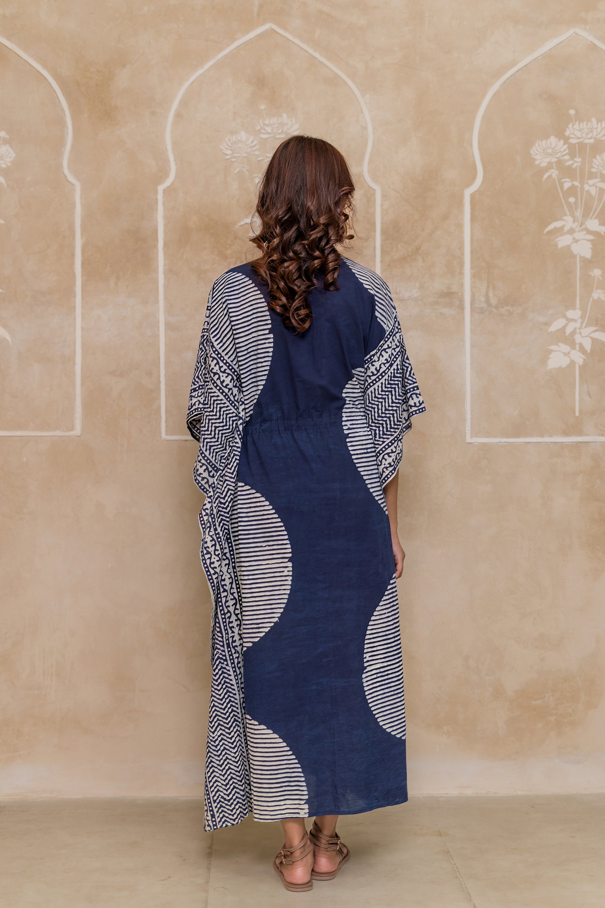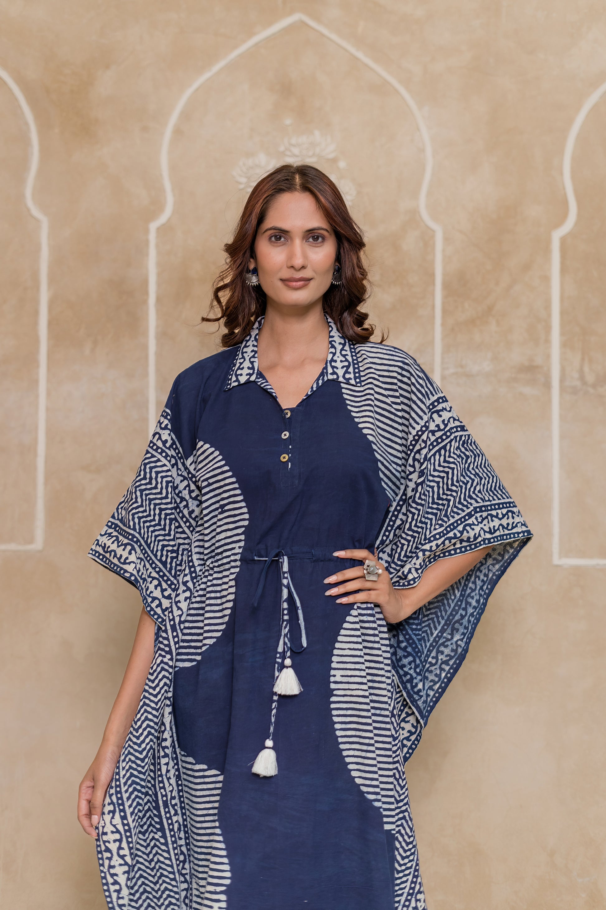 Buy this indigo hand block printed kaftan dress for casual outings in a stylish way. The long kaftan has shirt style collar with geometric hand block print.