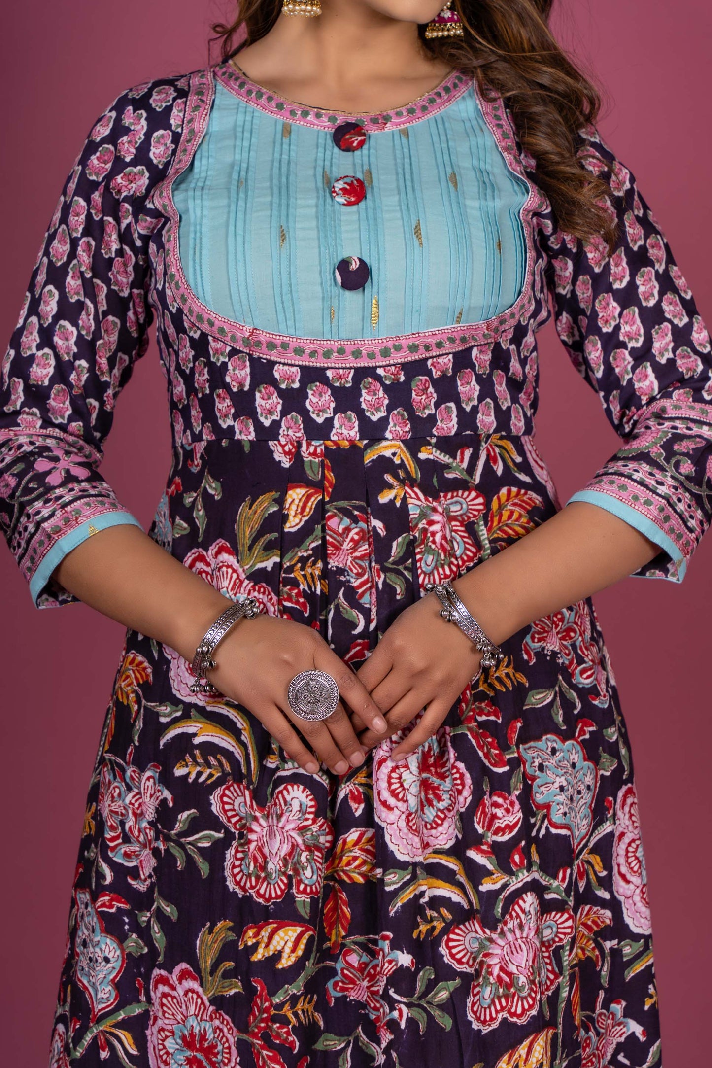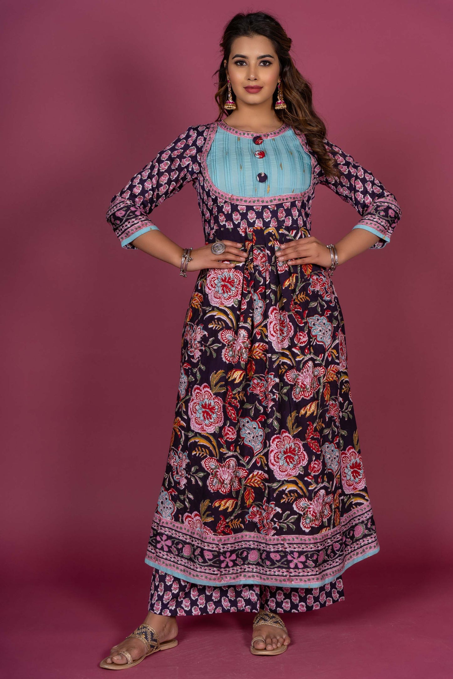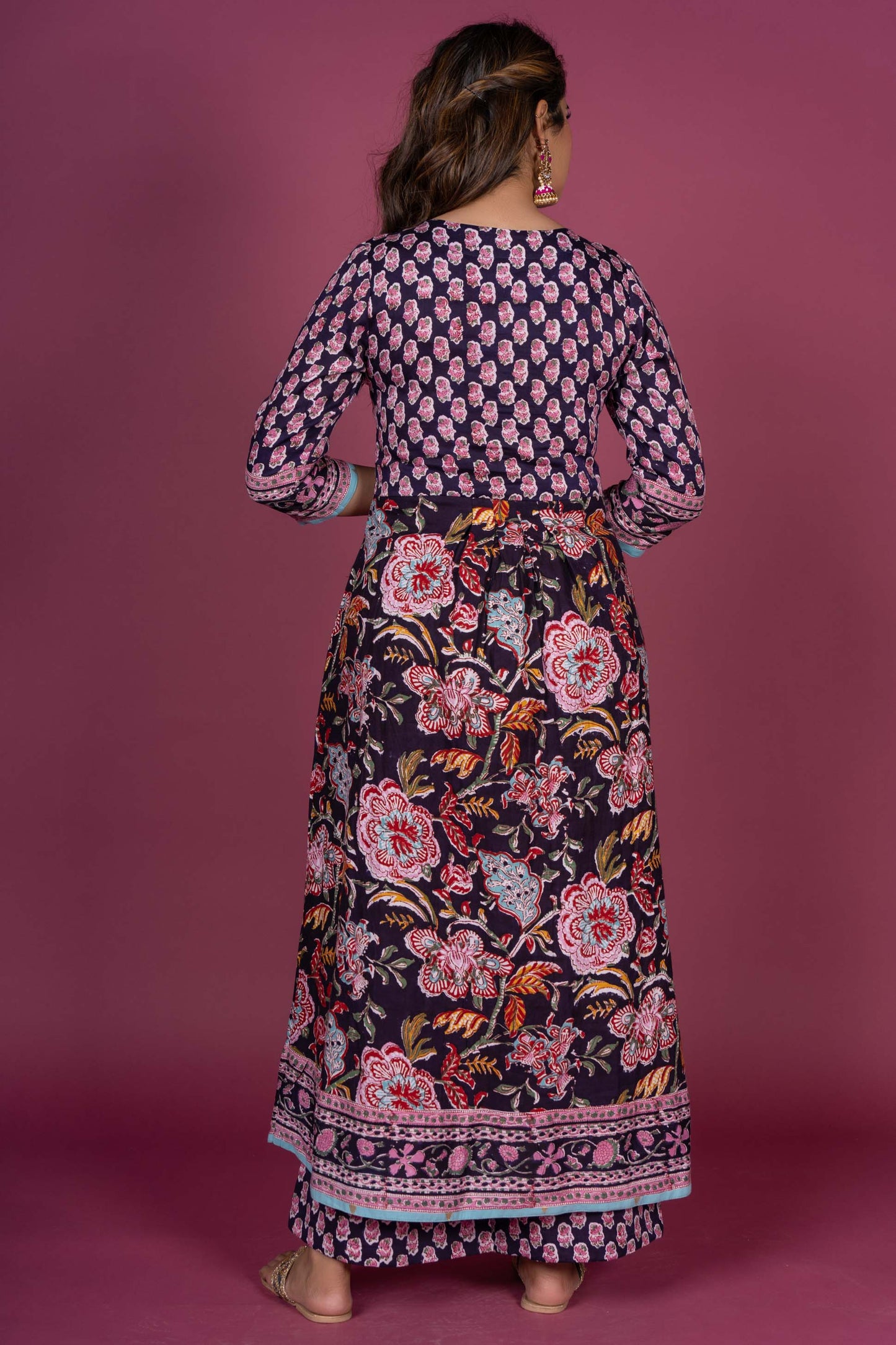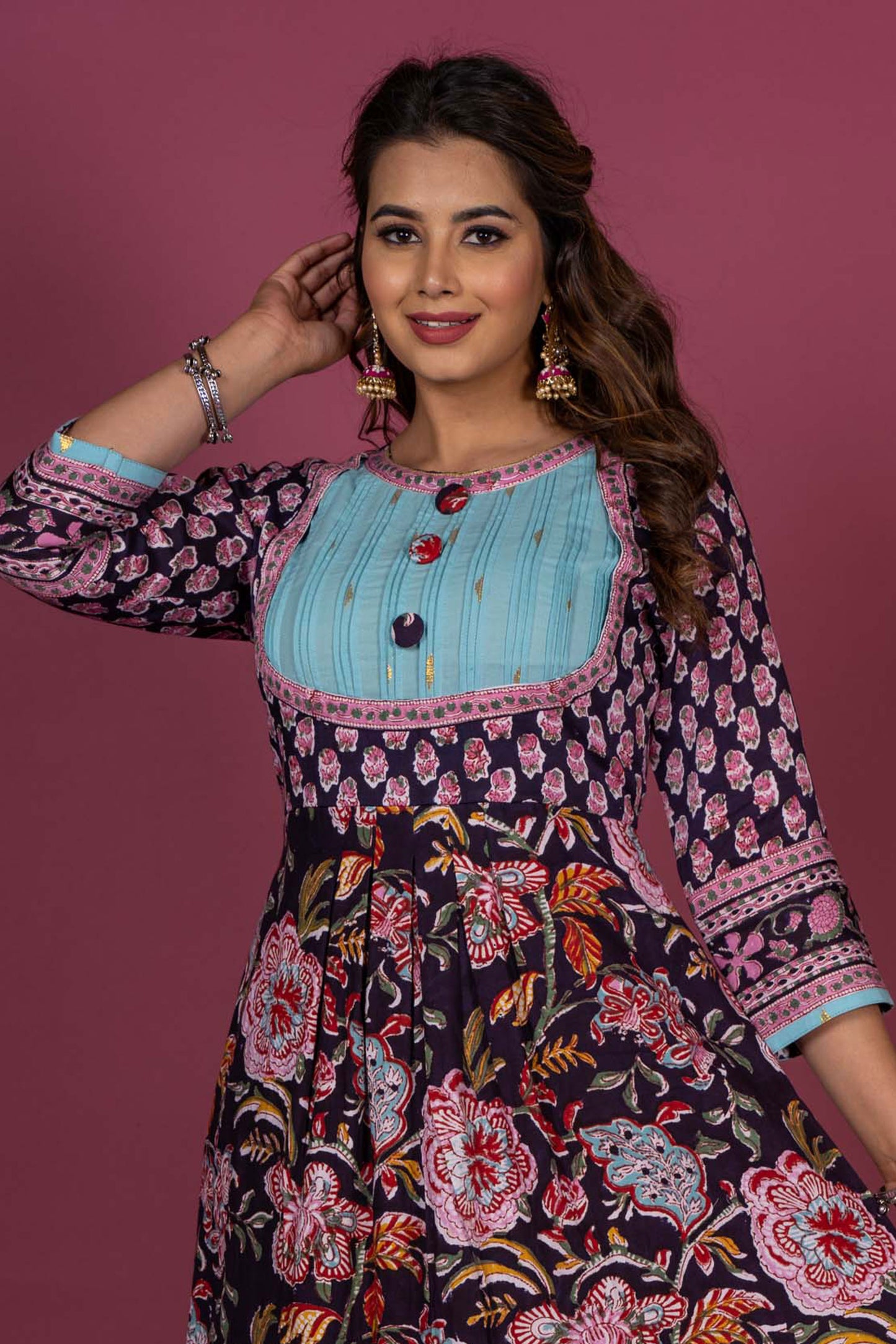 Three forth sleeves hand block printed long kurta in black base with multicolor hand block print on it.