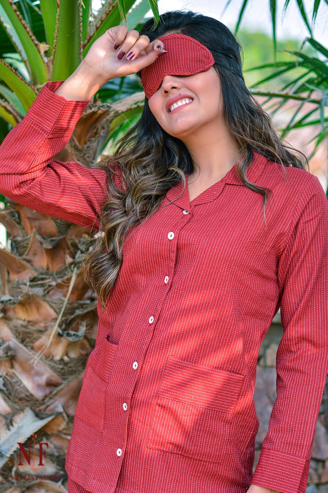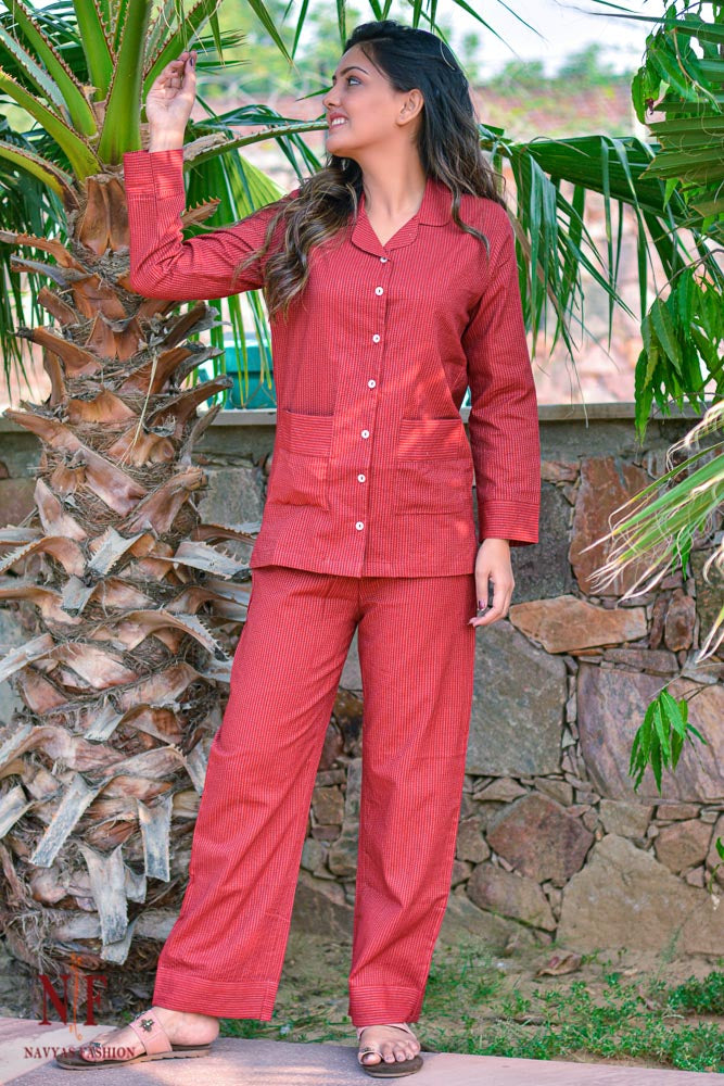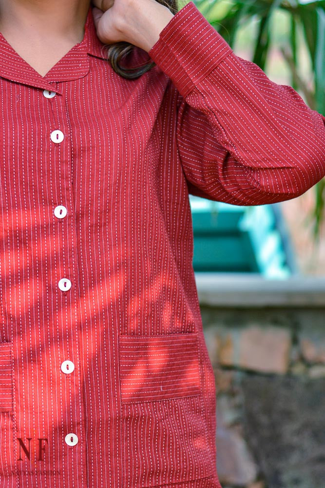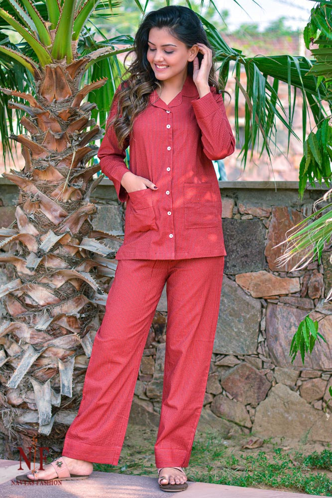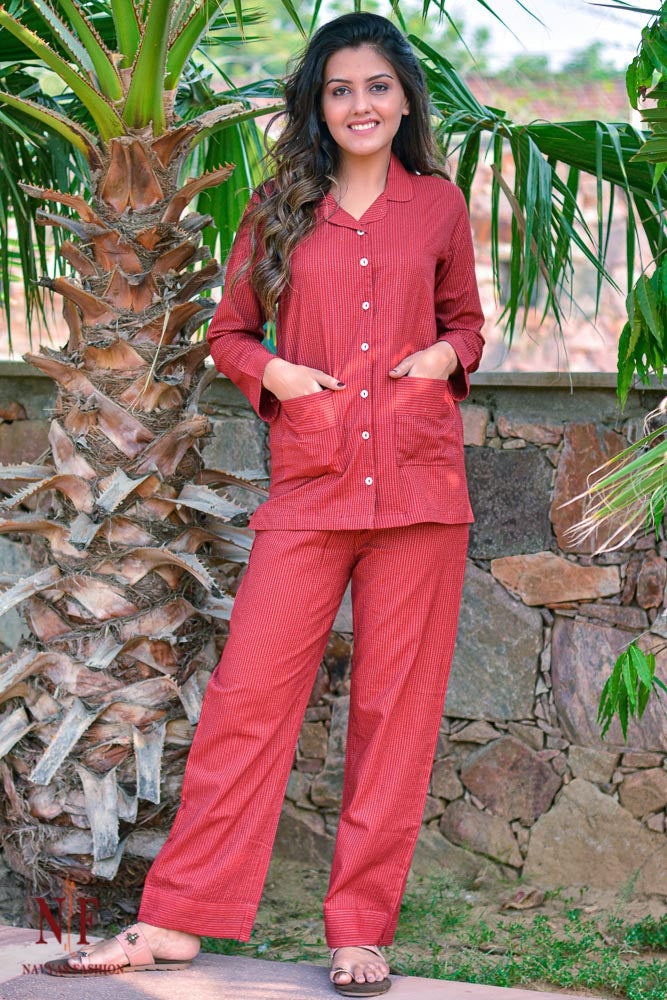MAROON KANTHA STITCH COTTON NIGHT SUIT-NS49