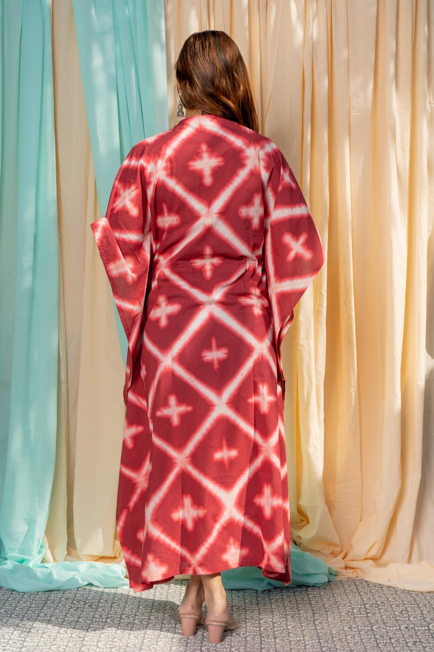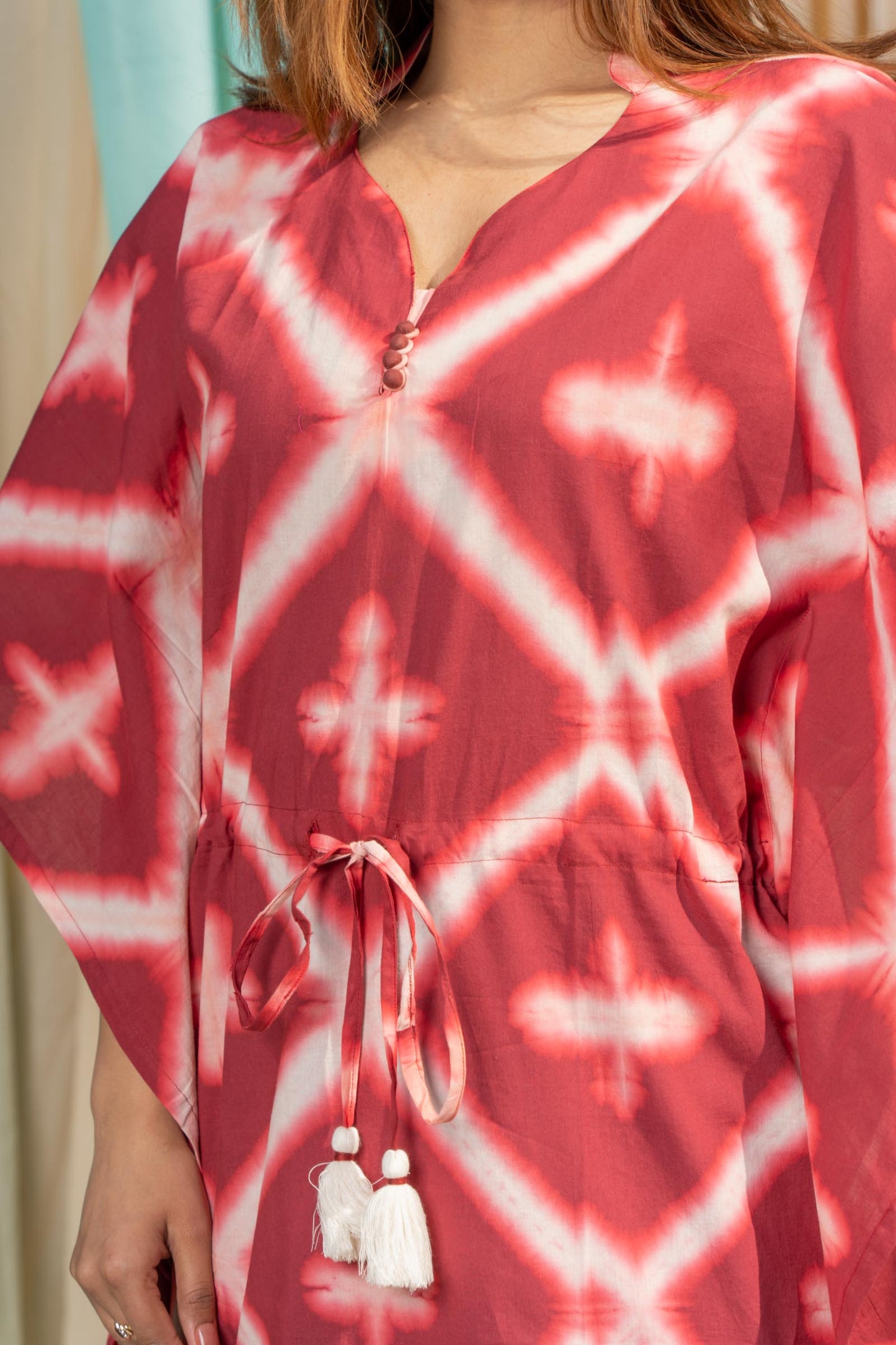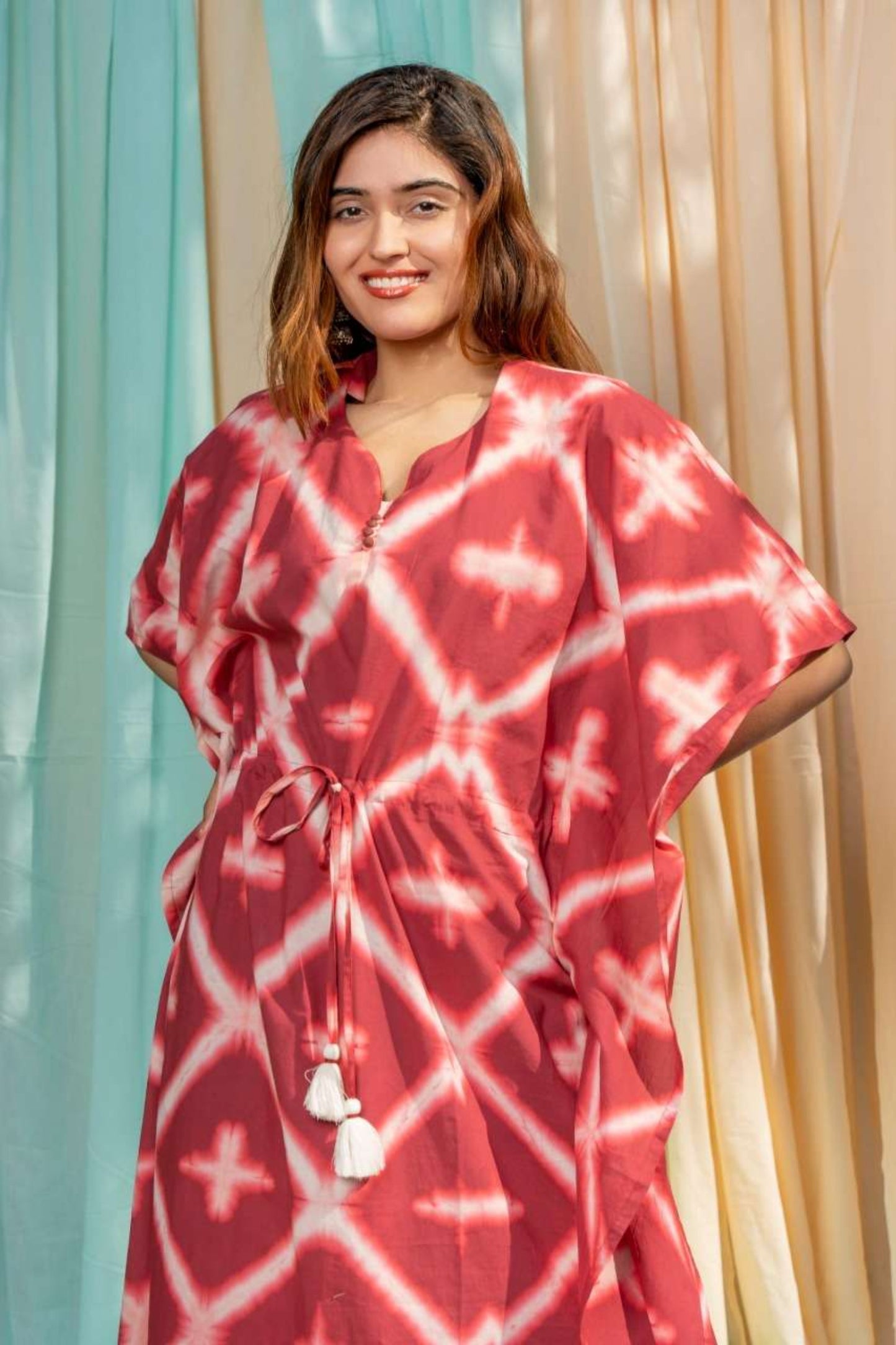Maroonish red handcrafted clamp dye long kaftan dress for summer season. Drawstring with tassels makes it adjustable at the waist.