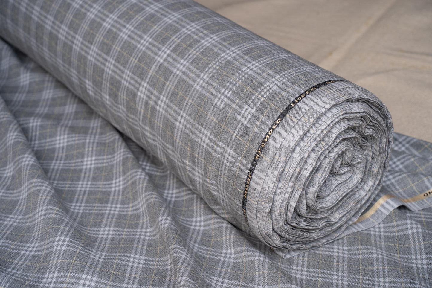 Tweed wool from India in grey color with checks pattern all over the fabric. Soft texture wool fabric from India for winter wear Trousers, Jackets and Over coats.