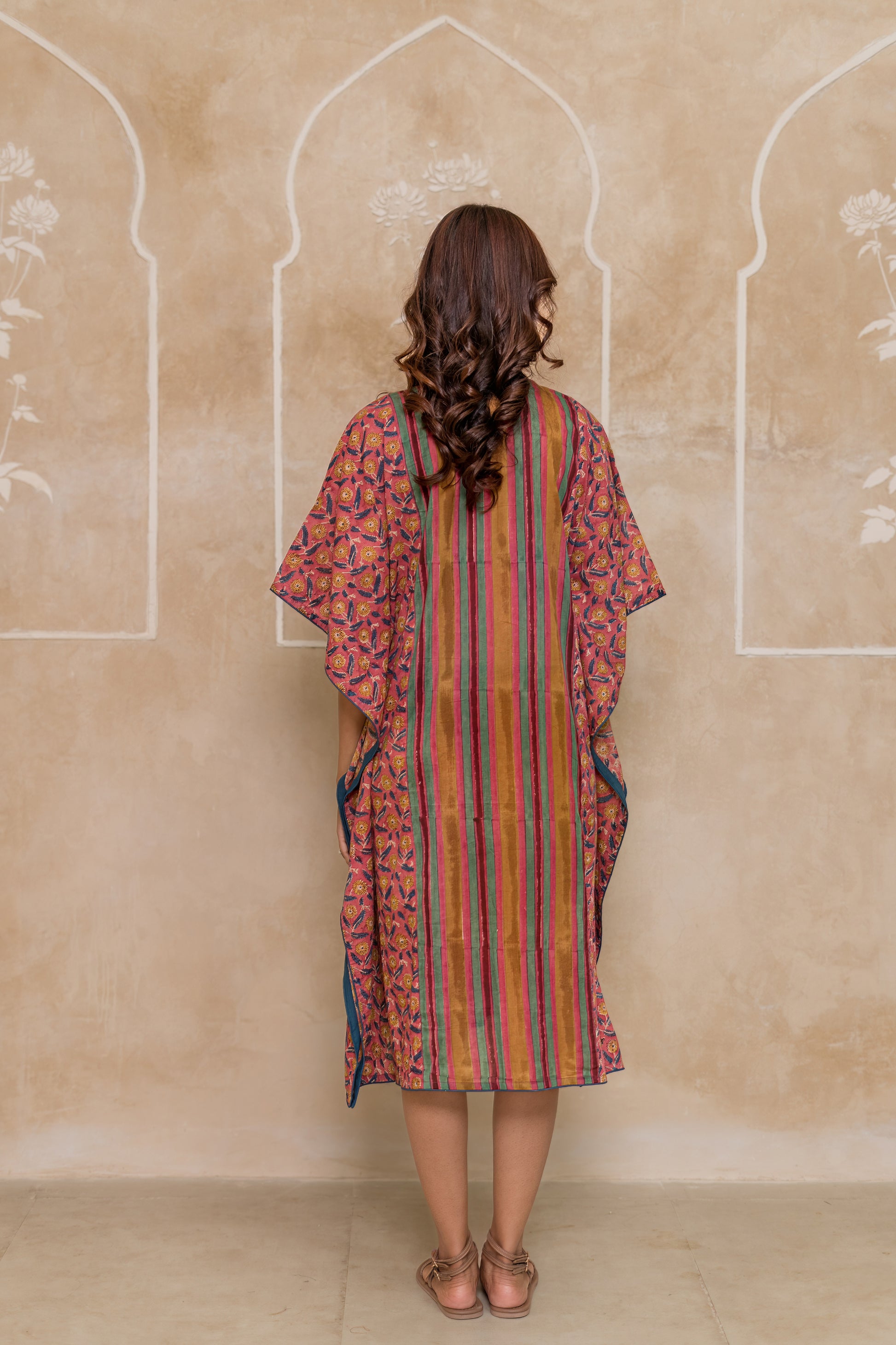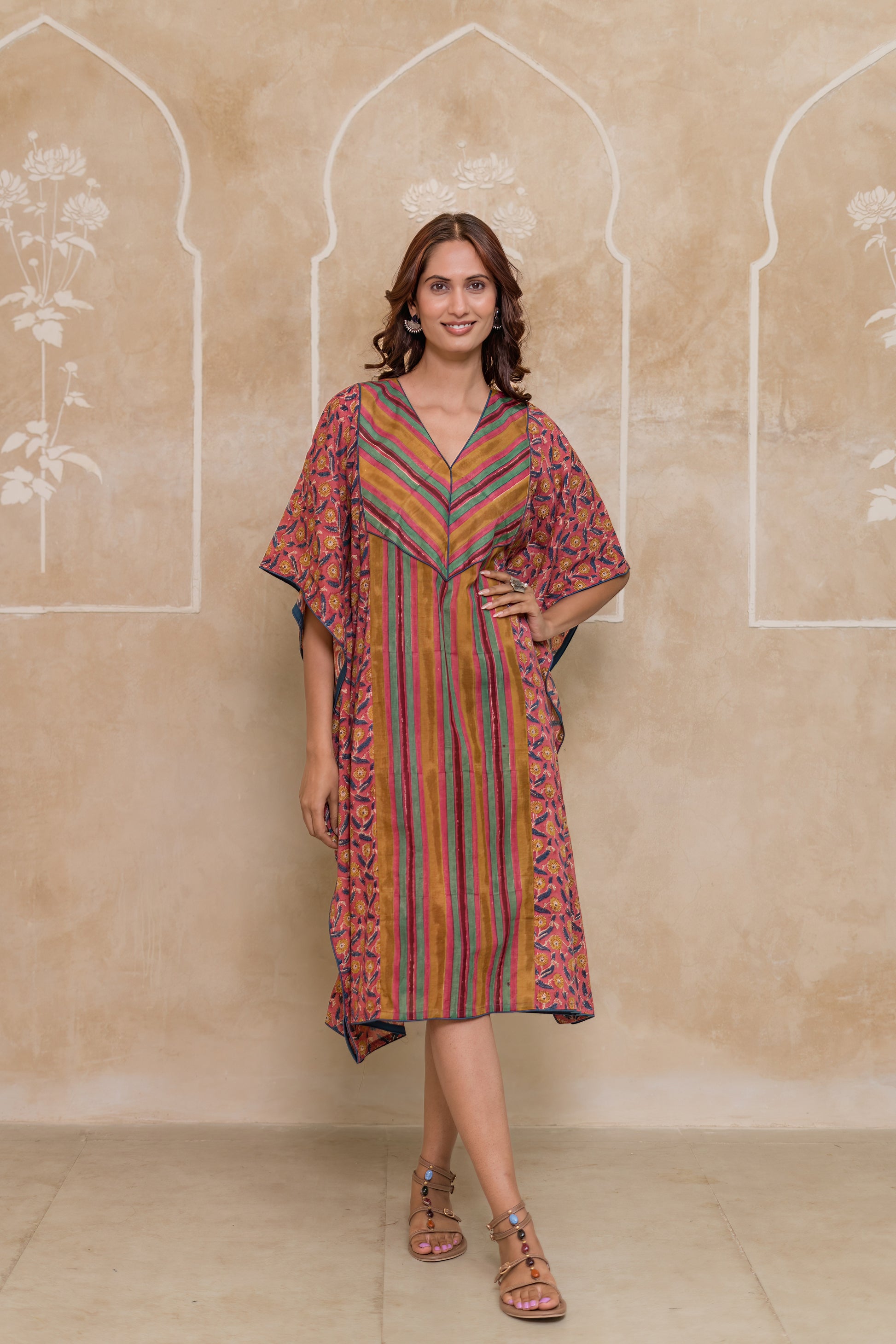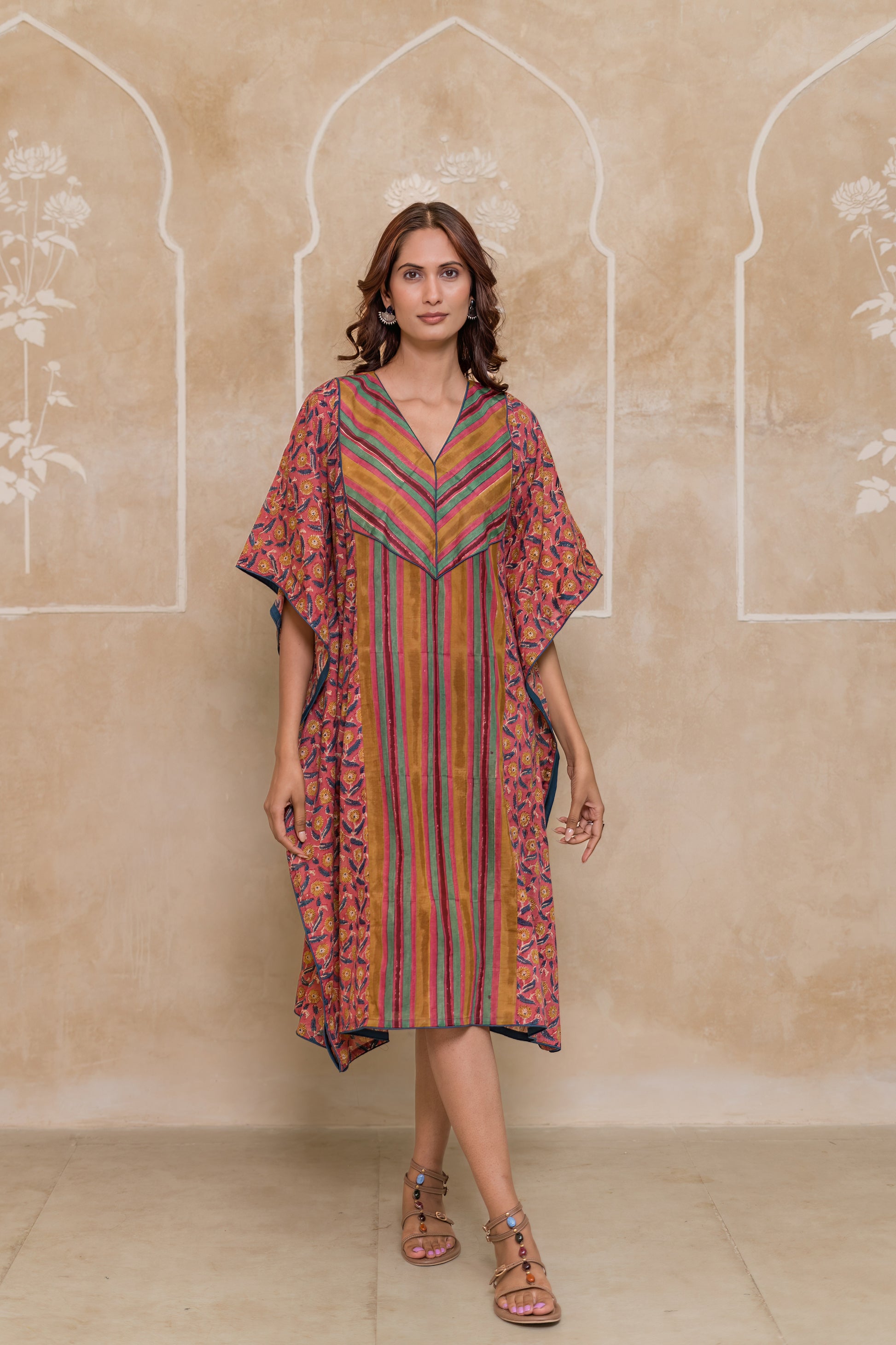 Buy this multicolor hand block printed knee length kaftan dress for casual outings. This pure cotton kaftan dress has a contrasting hand block printed panelling in the front.