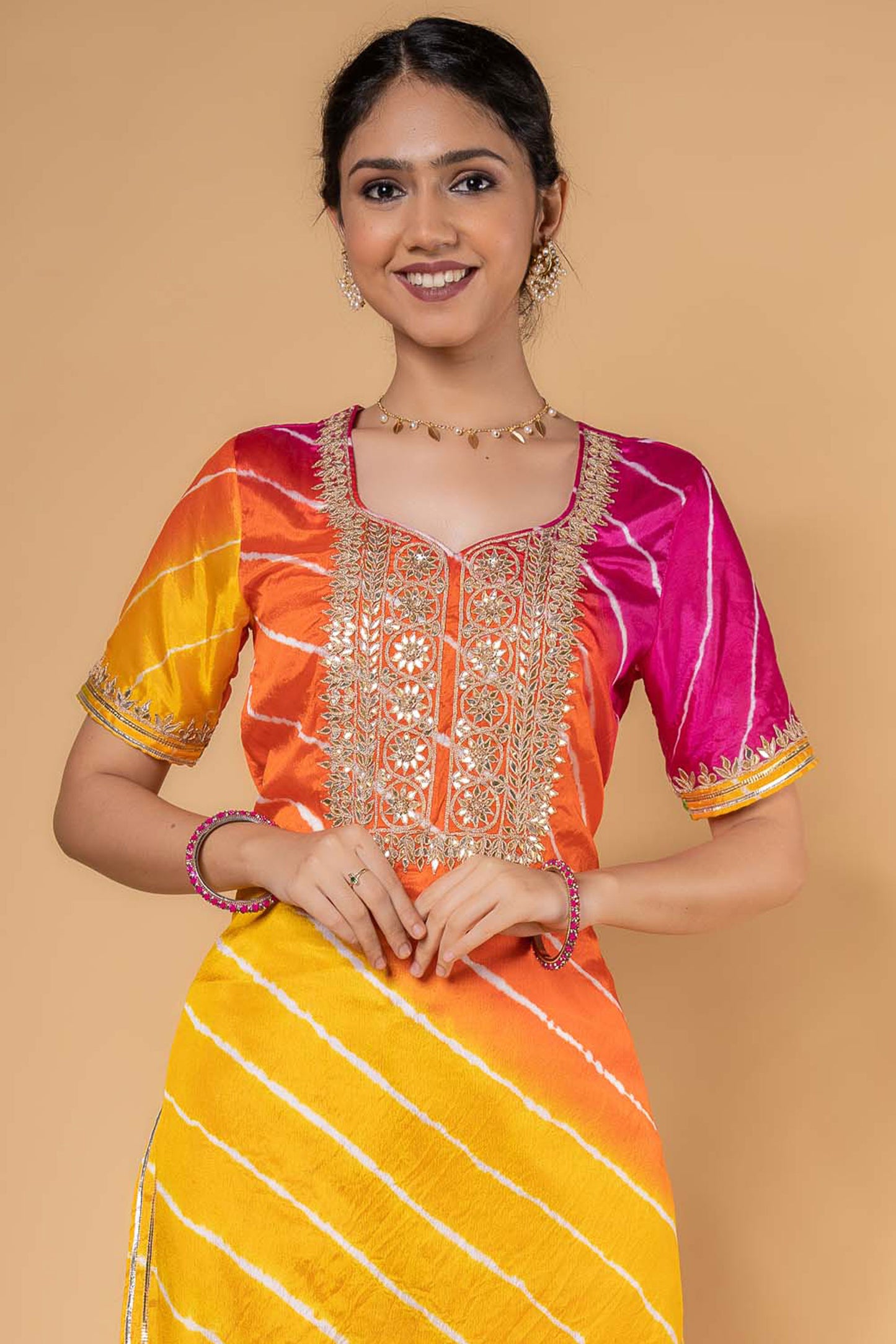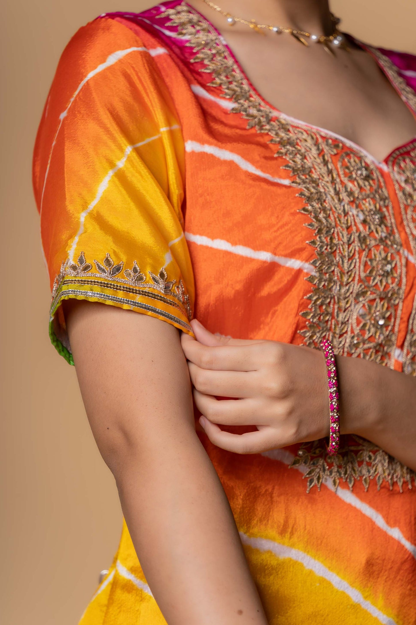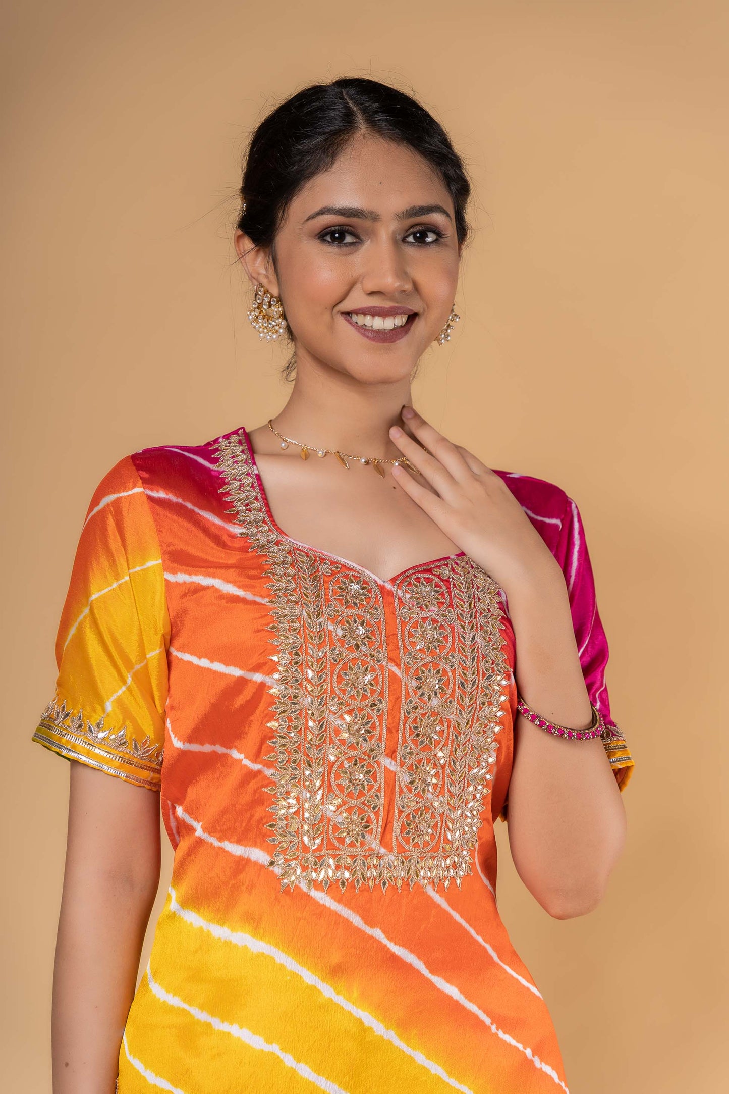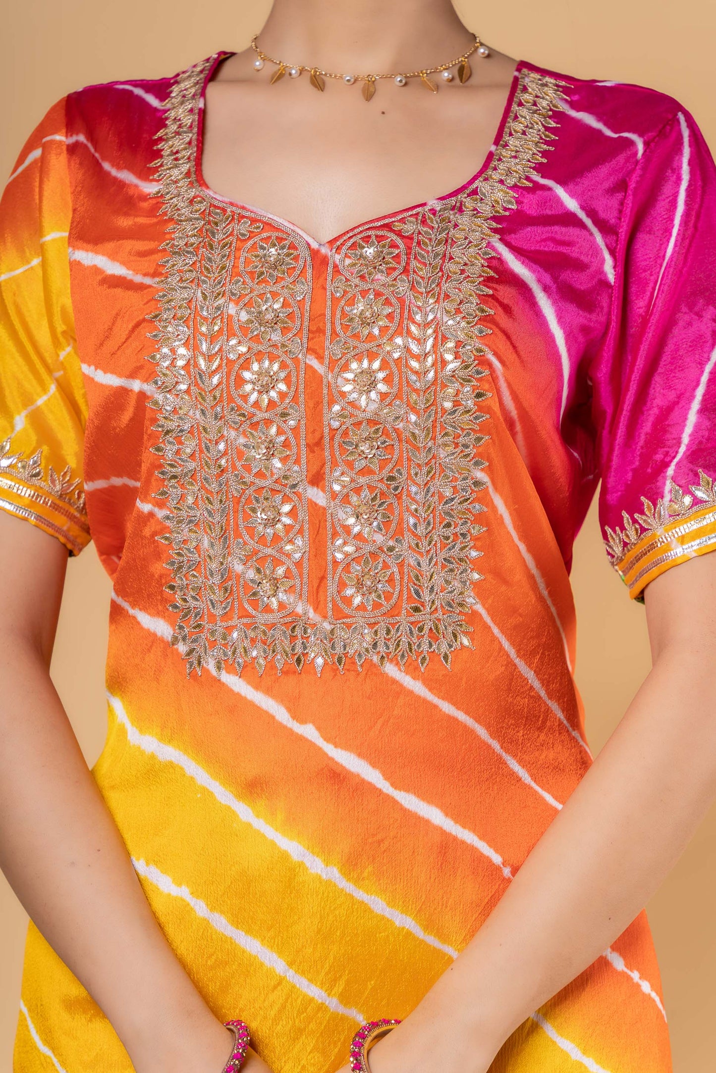 Three forth sleeves multicolor lehariya kurta in dola silk fabric. This elbow sleeves kurta has gotapatti hand work done on the yoke and sleeves.
