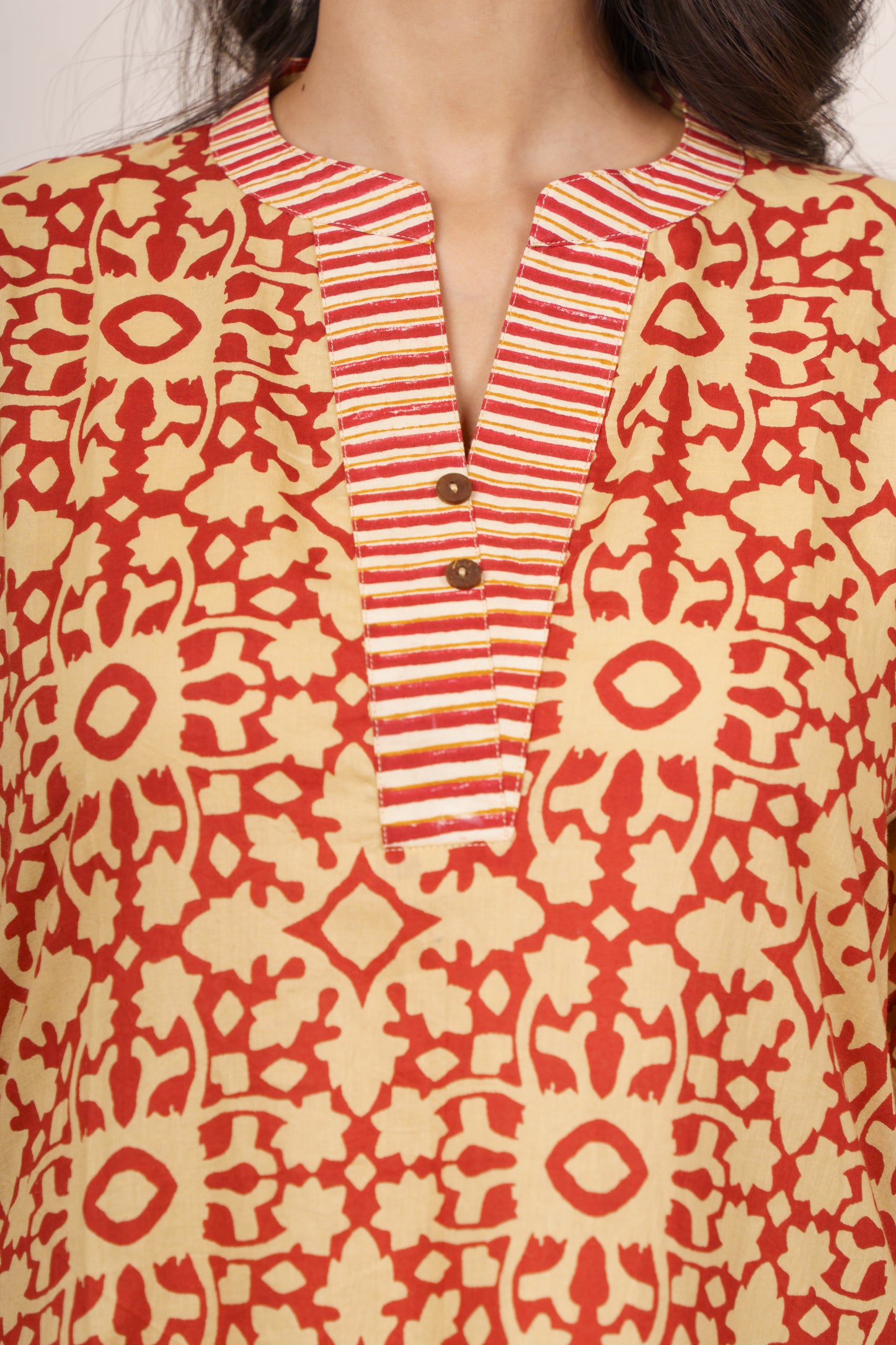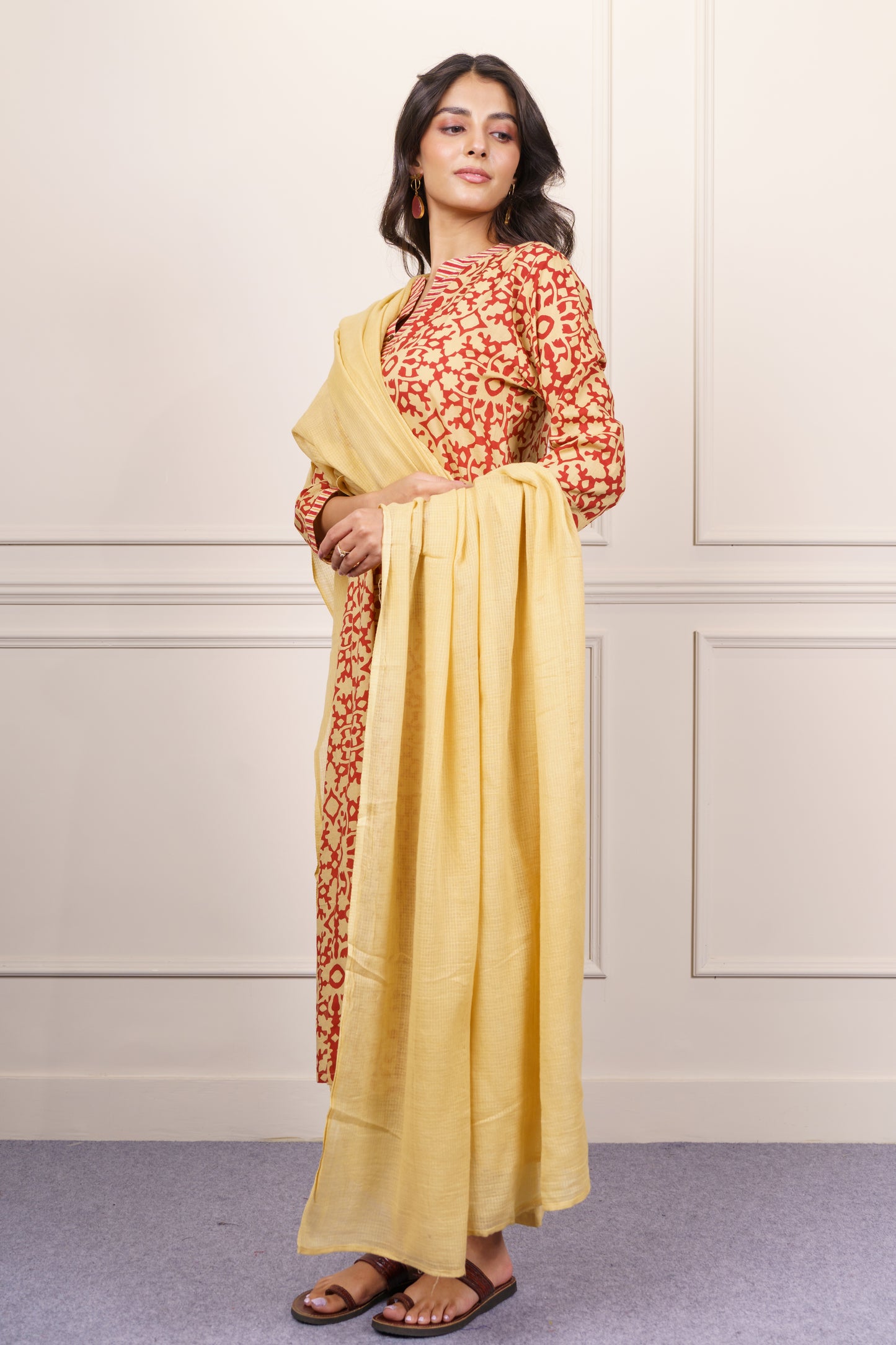 Stand out in style with this mustard cotton kurta Munga Cotton dupatta Set featuring bold red geometric block prints. The striped detailing on the neckline and cuffs adds a playful contrast. Designed in a straight-cut silhouette with side slits and three-quarter sleeves, it offers a chic yet comfortable fit perfect for effortless everyday elegance.