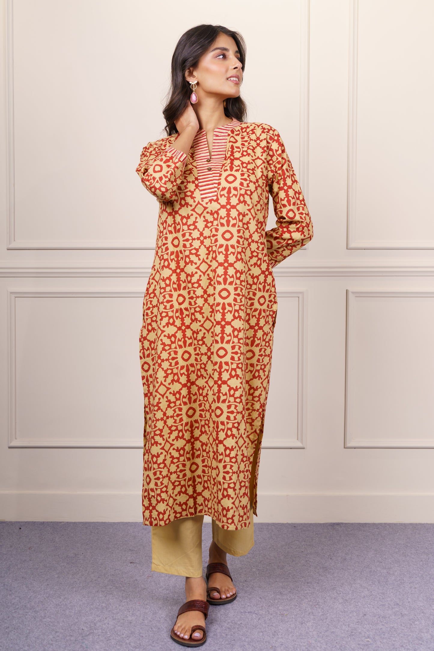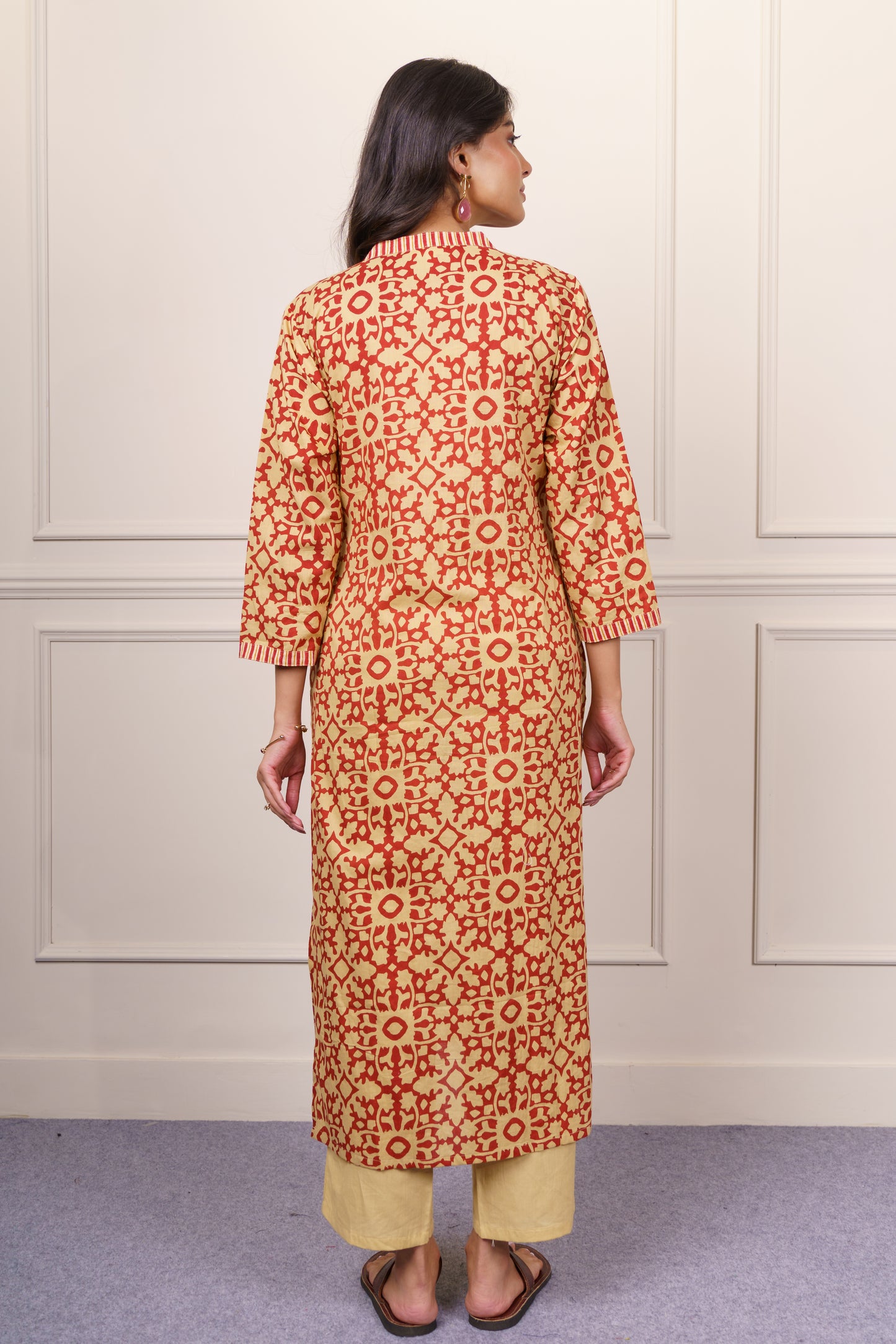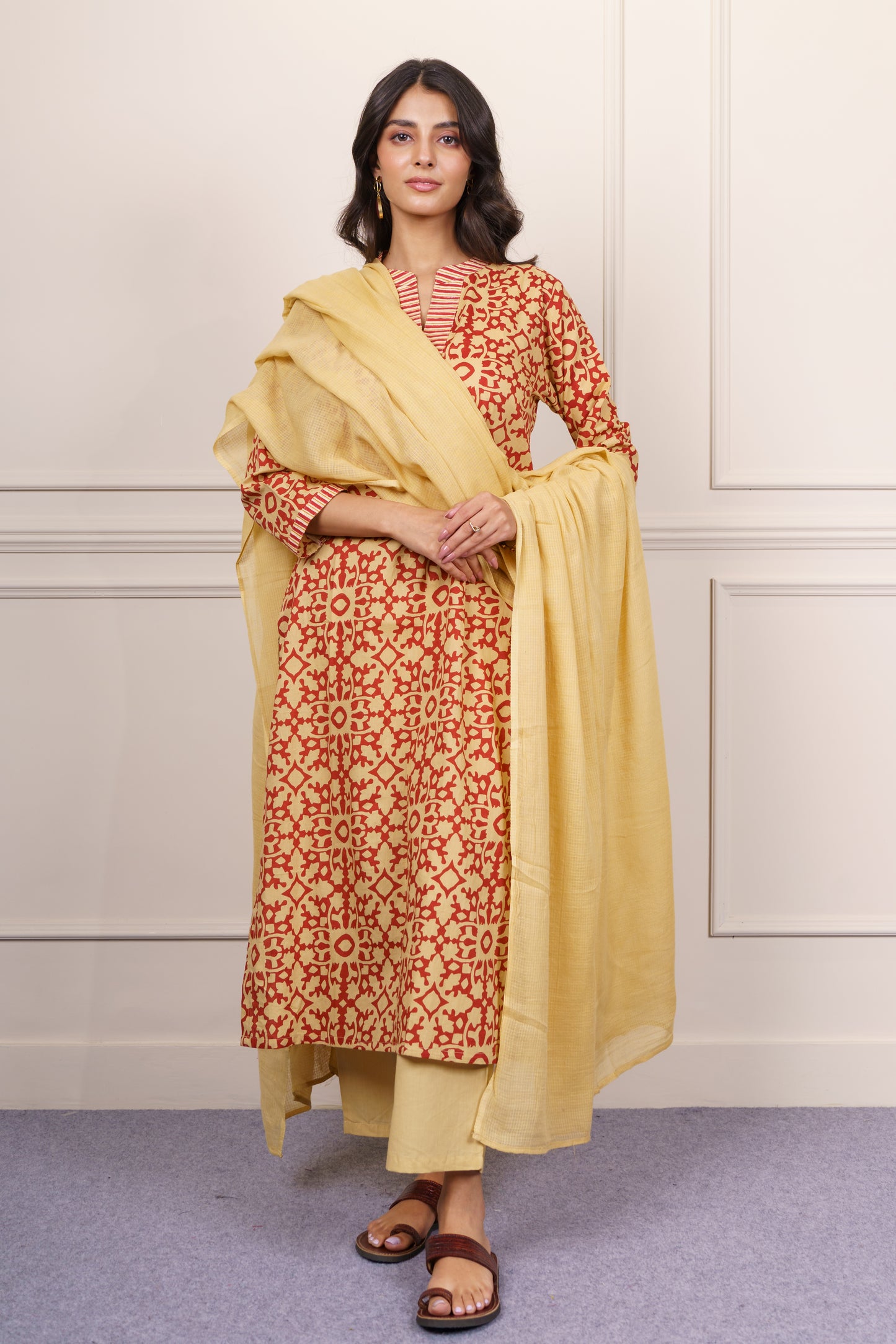 Mustard Red Geometric Cotton Kurta Dupatta Set-KS866