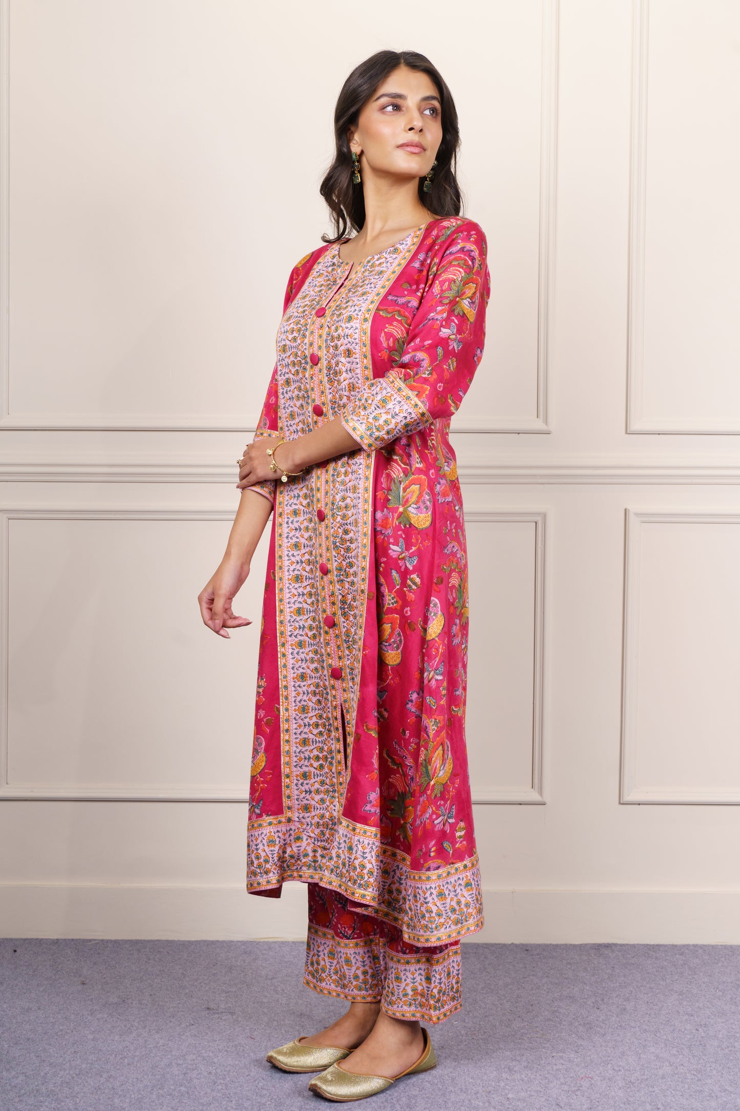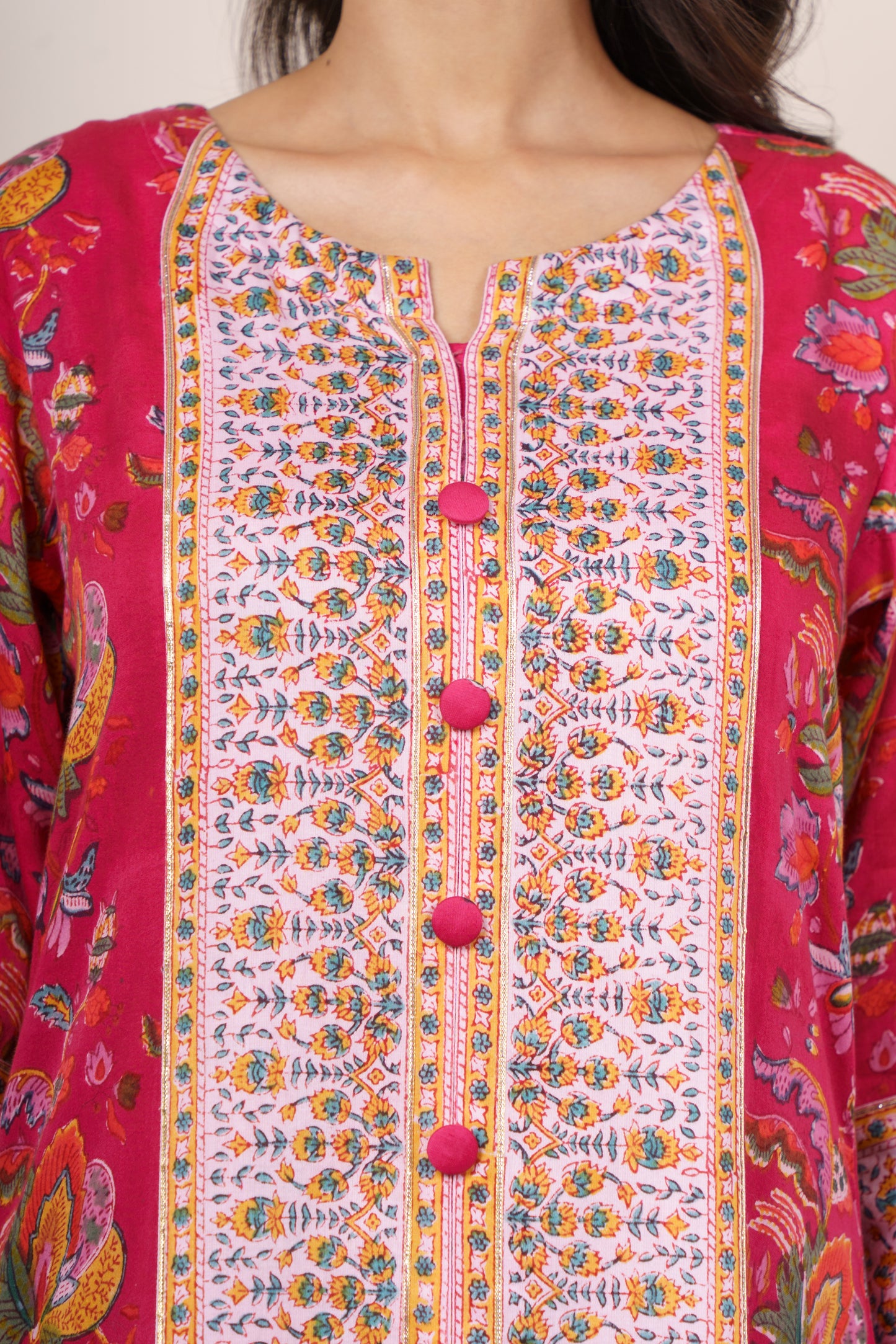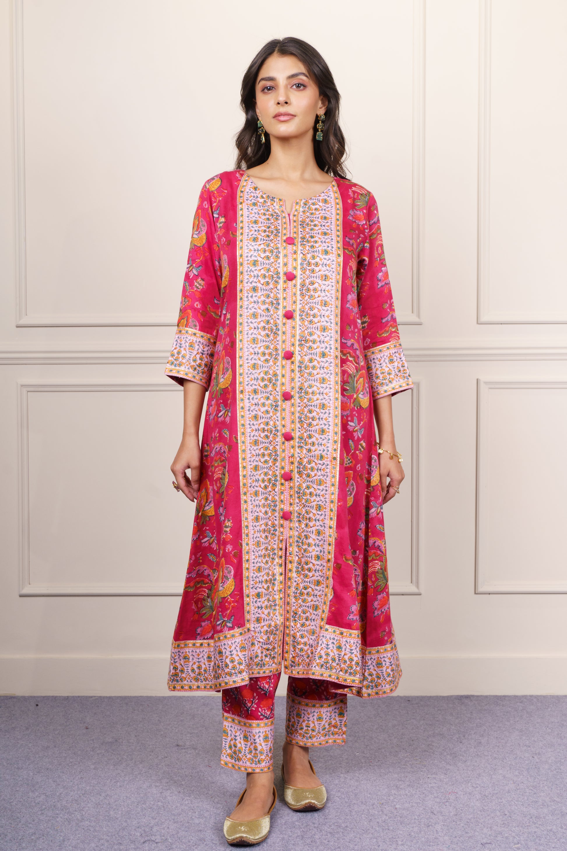 Deep pink base with multicolor floral and paisley hand block prints This striking kurta set features a deep pink cotton flared kurta adorned with intricate multicolor floral and paisley hand block prints. A contrast-printed front panel with bold buttons and rich border detailing adds elegance. Paired with matching printed straight pants, this coordinated set is ideal for festive occasions, blending traditional artistry with modern flair.