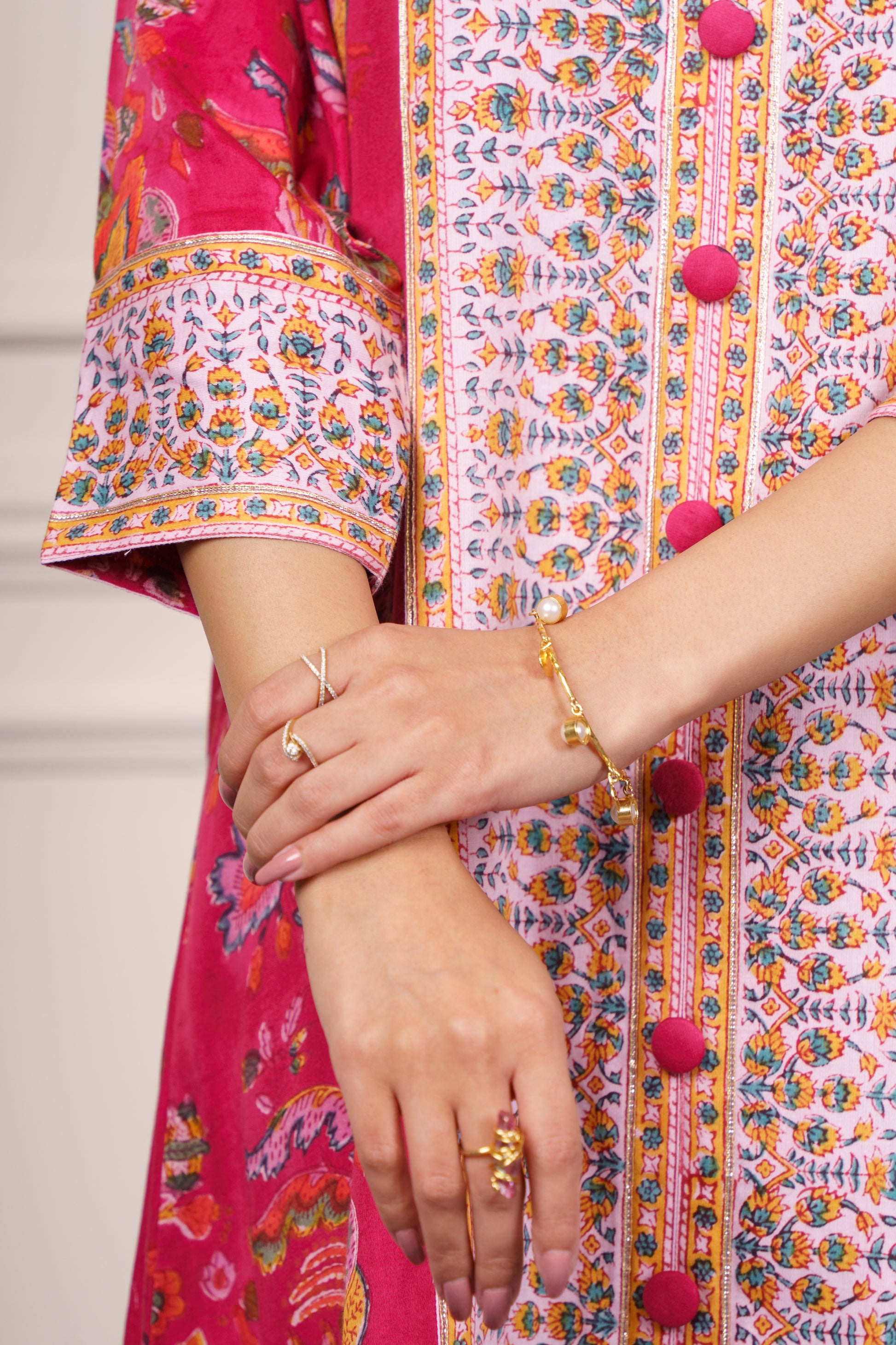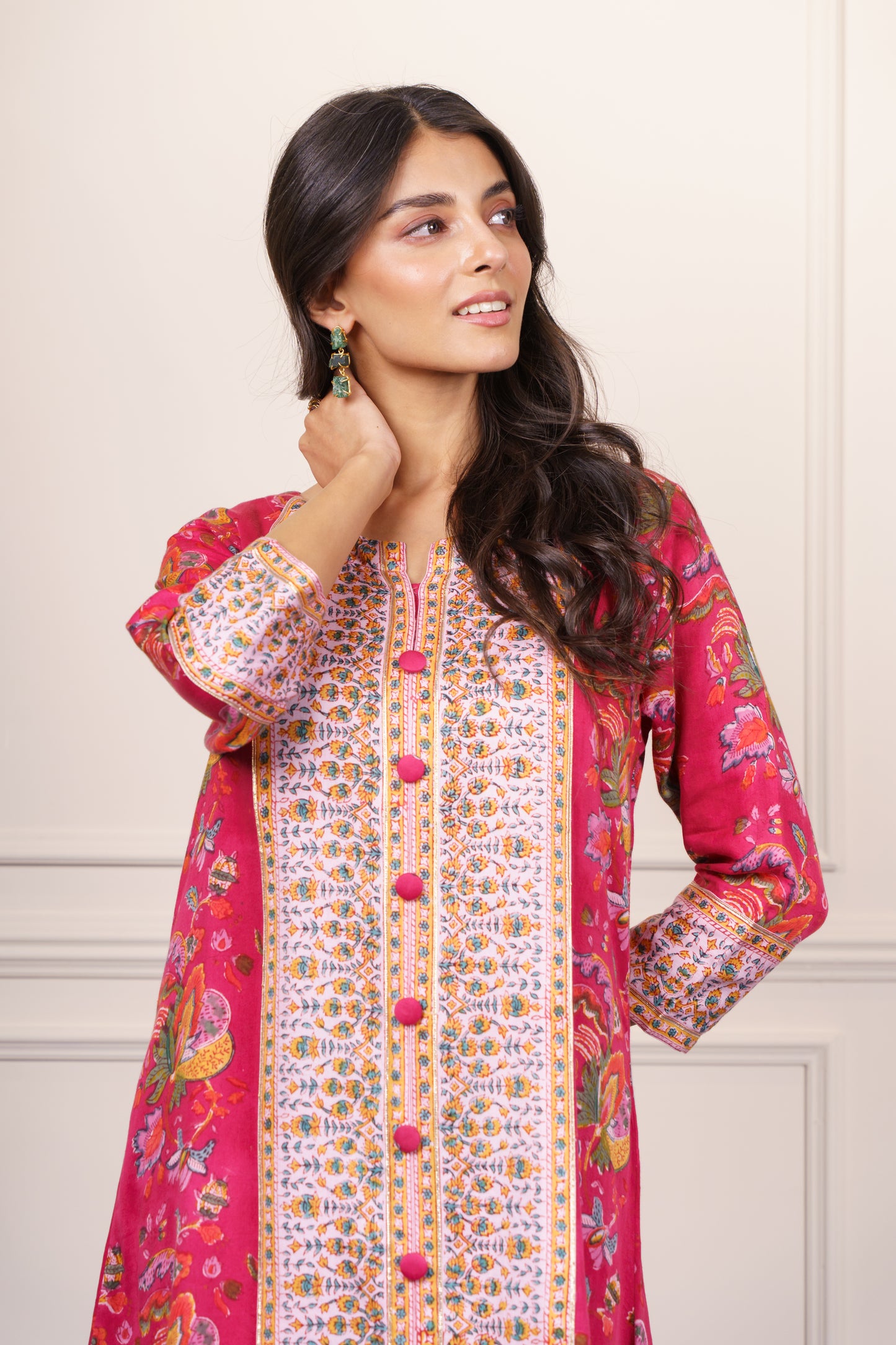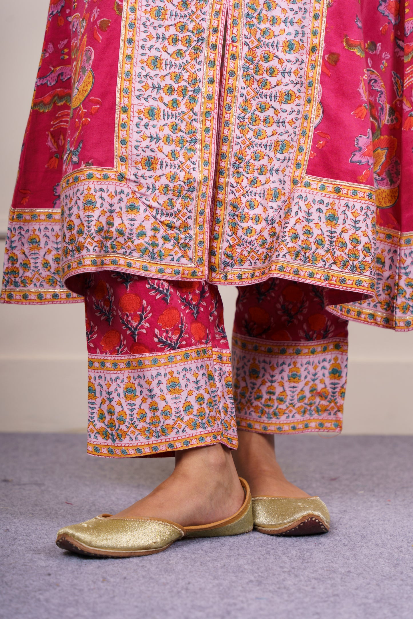 Deep pink base with multicolor floral and paisley hand block prints This striking kurta set features a deep pink cotton flared kurta adorned with intricate multicolor floral and paisley hand block prints. A contrast-printed front panel with bold buttons and rich border detailing adds elegance. Paired with matching printed straight pants, this coordinated set is ideal for festive occasions, blending traditional artistry with modern flair.
