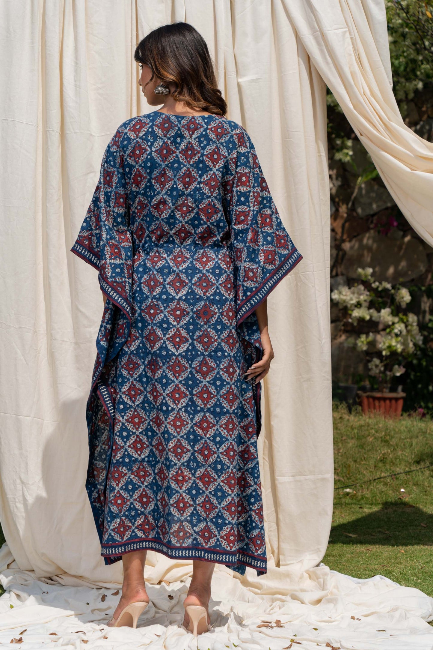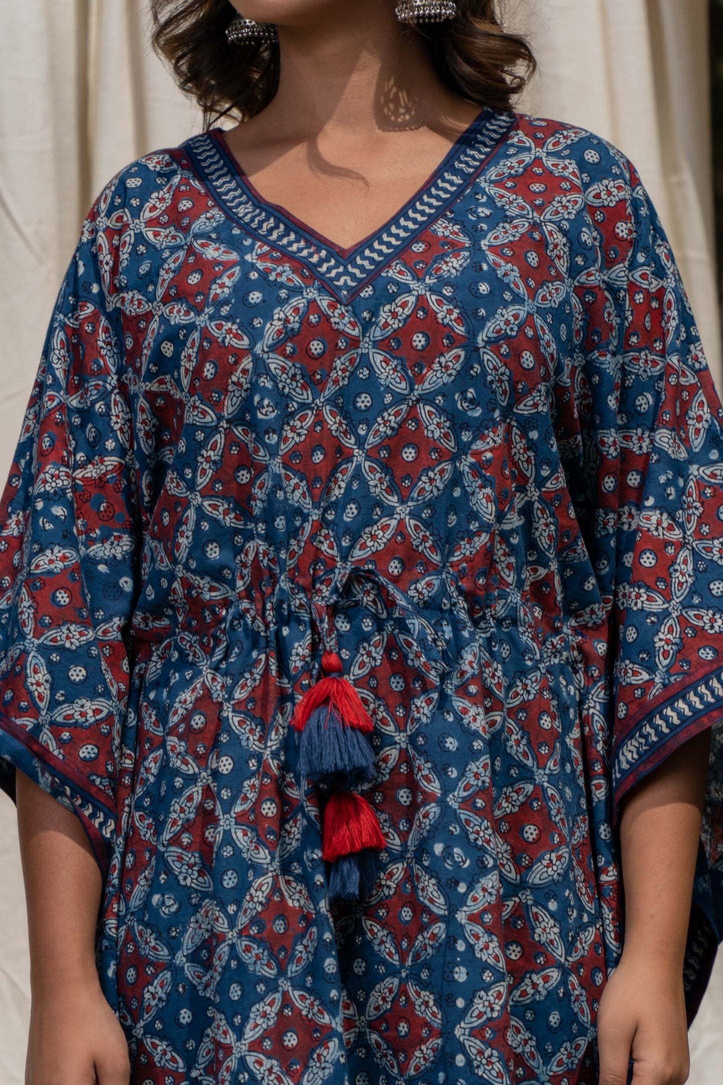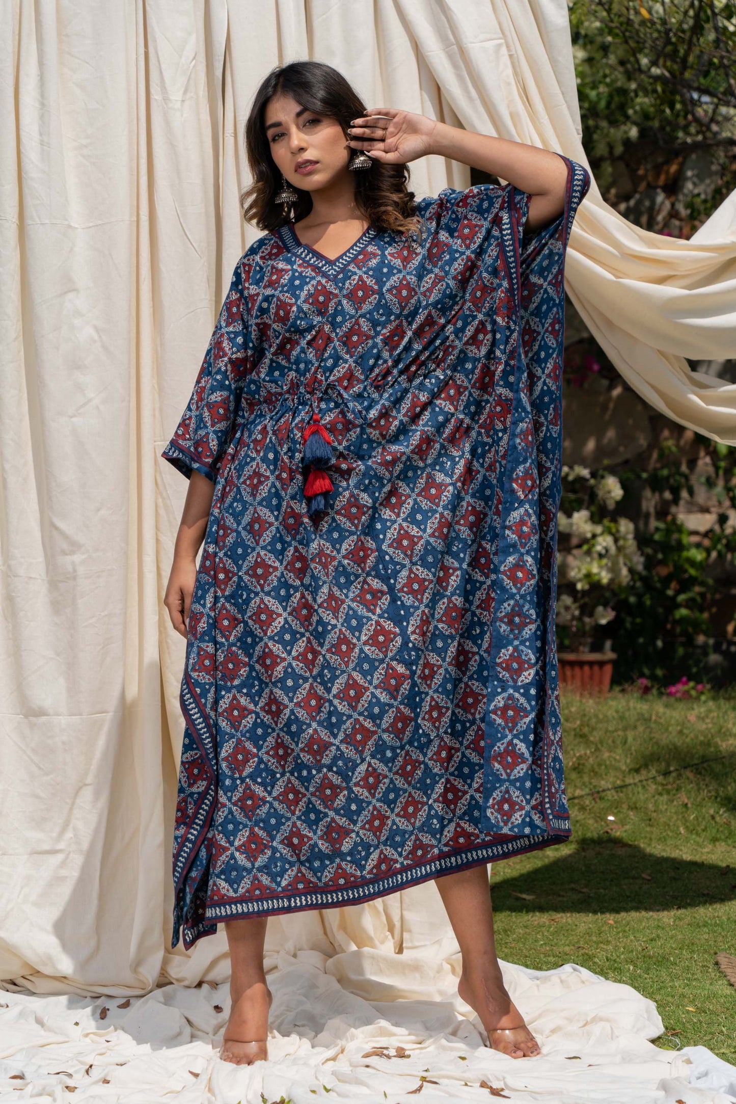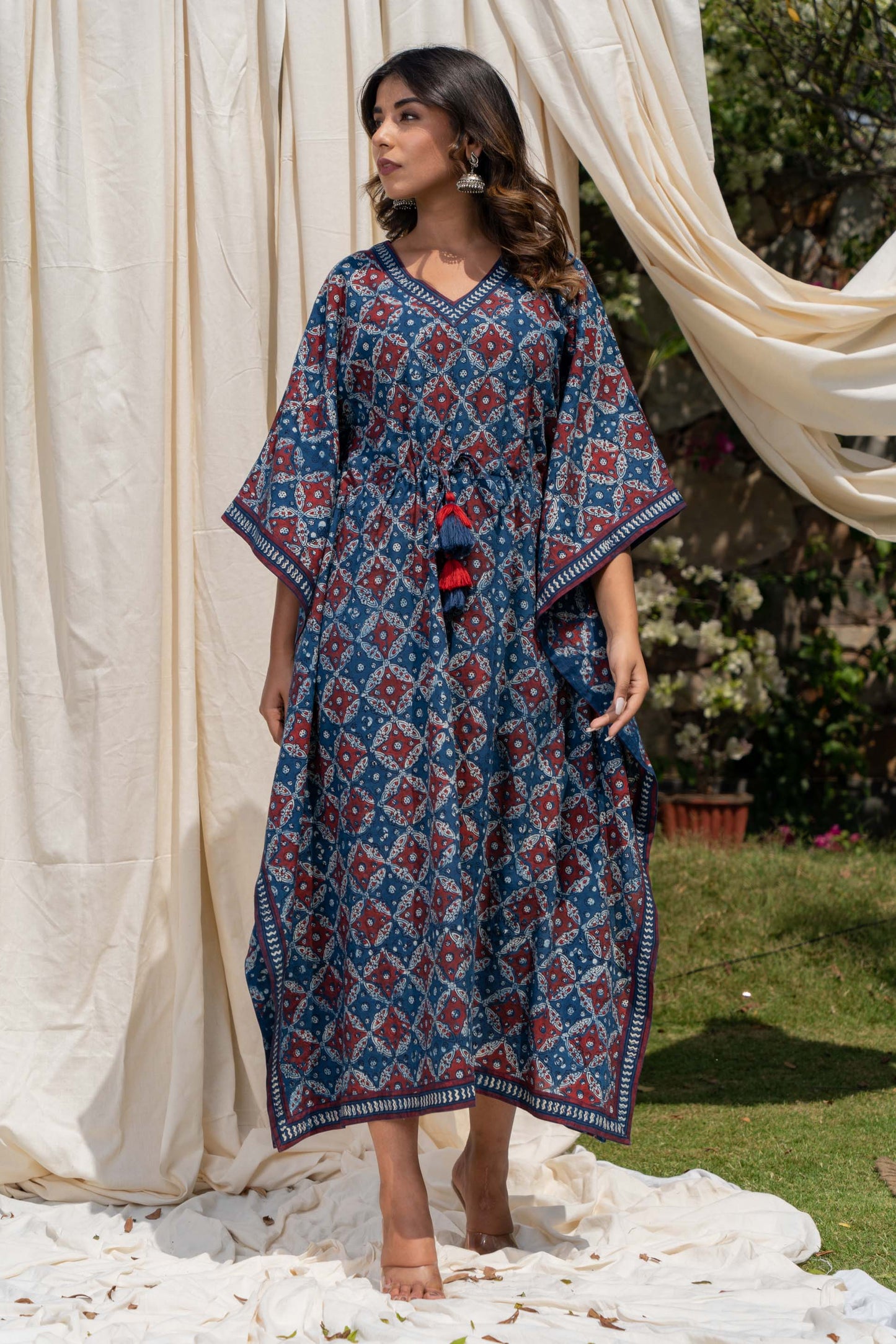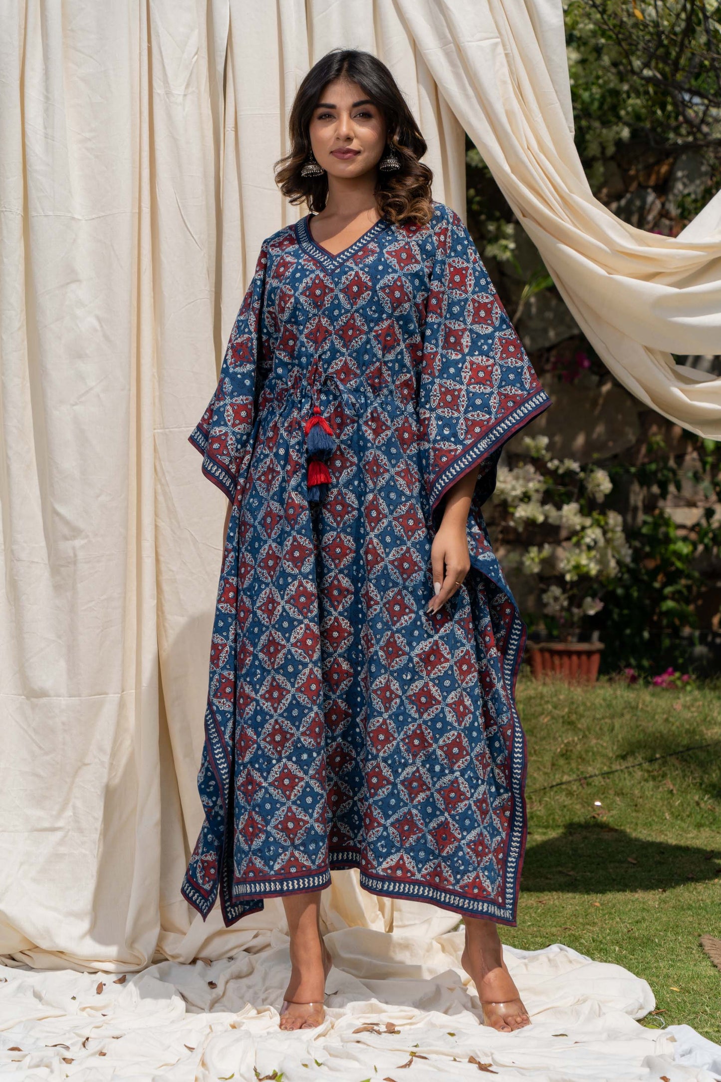 This natural vegetable dye hand block printed kaftan dress has beautiful tassels along with the drawstring to make the adjustments.