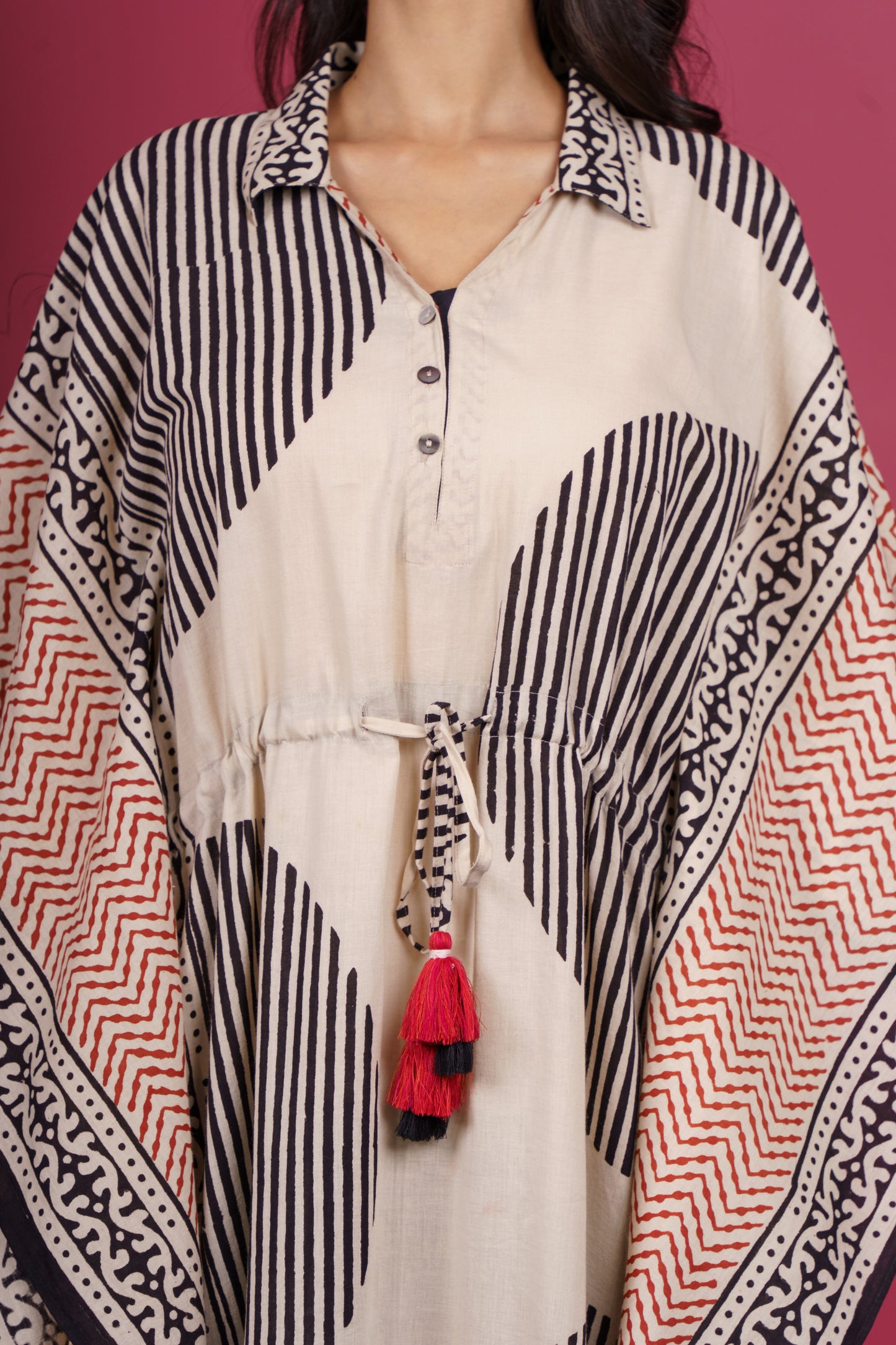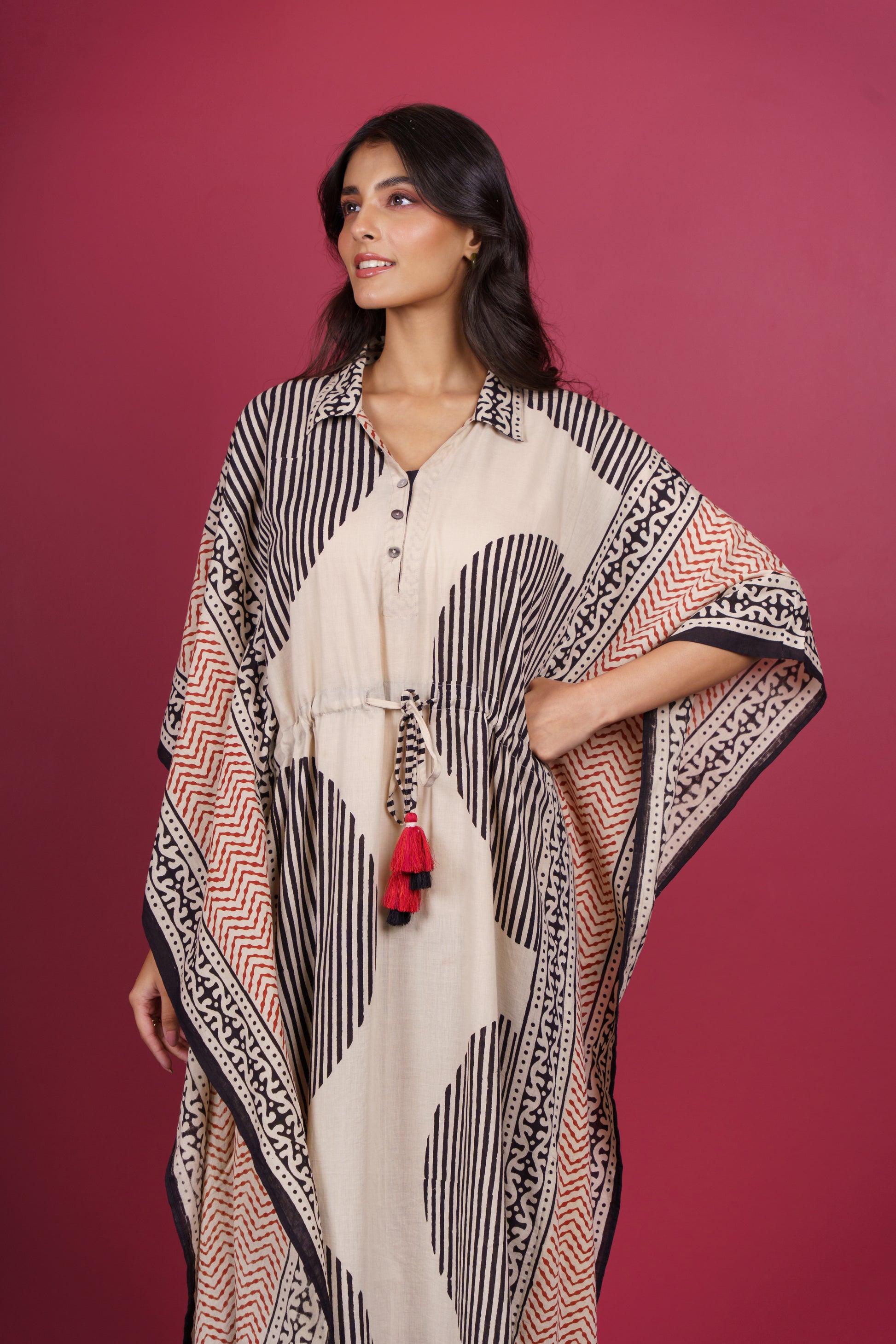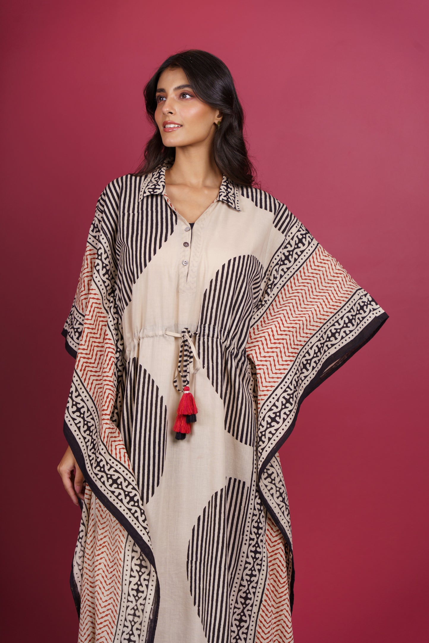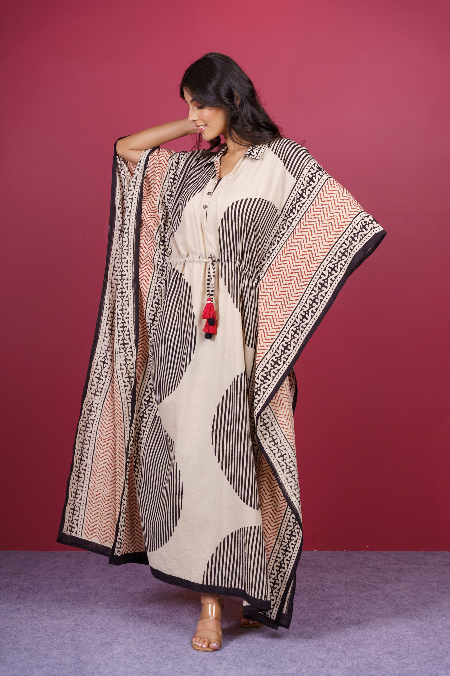 Style yourself with this bagru beige black hand block printed long kaftan dress in pure cotton fabric. Contrasting border and collar style adds beauty to the piece. Tassels with drawstrings makes it adjustable at the waist .