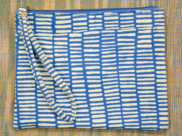 Navy Blue Block Printed Cotton Canvas bag in 8.5*7 inches size with zipper closure and a loop handle.