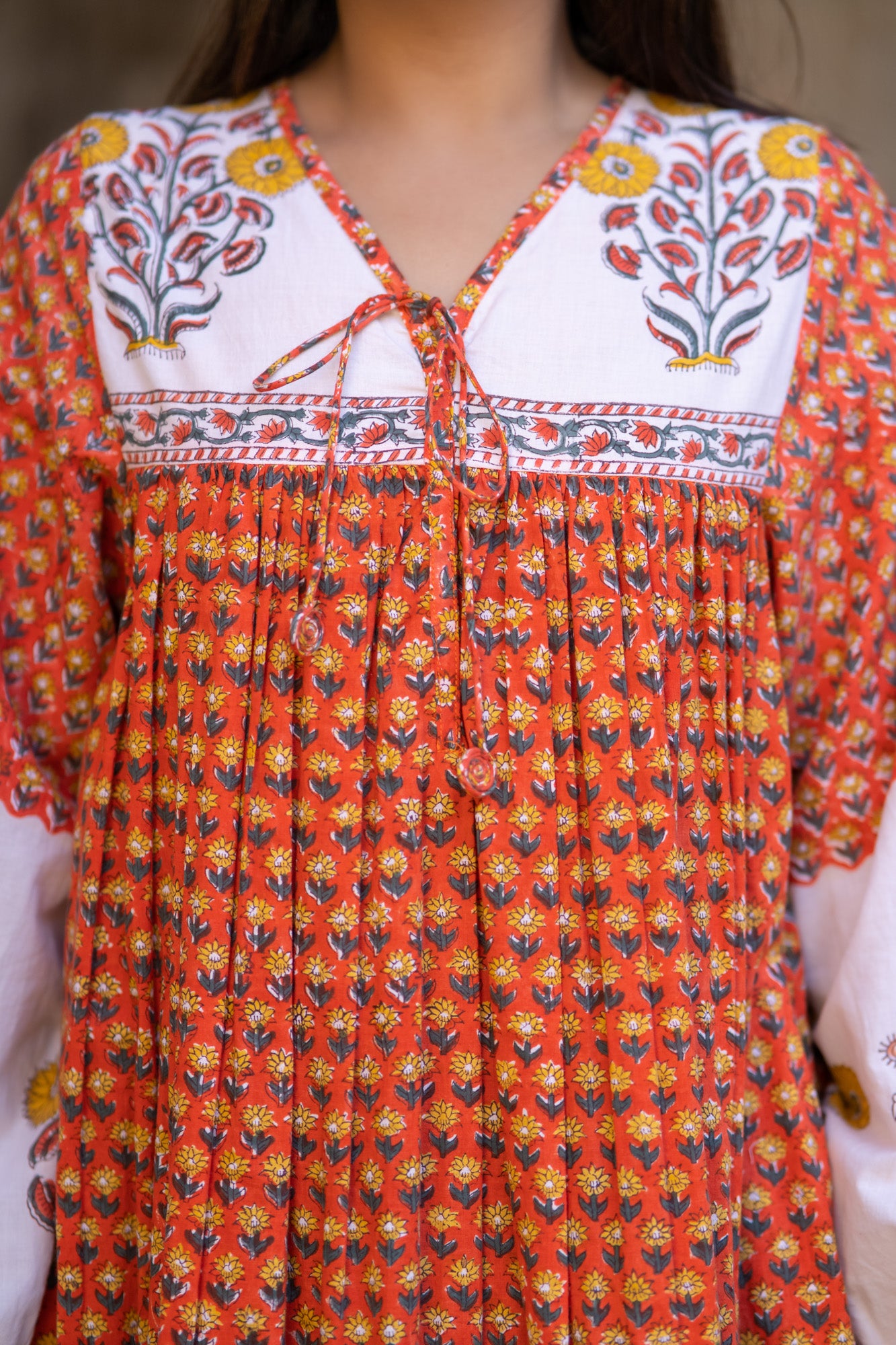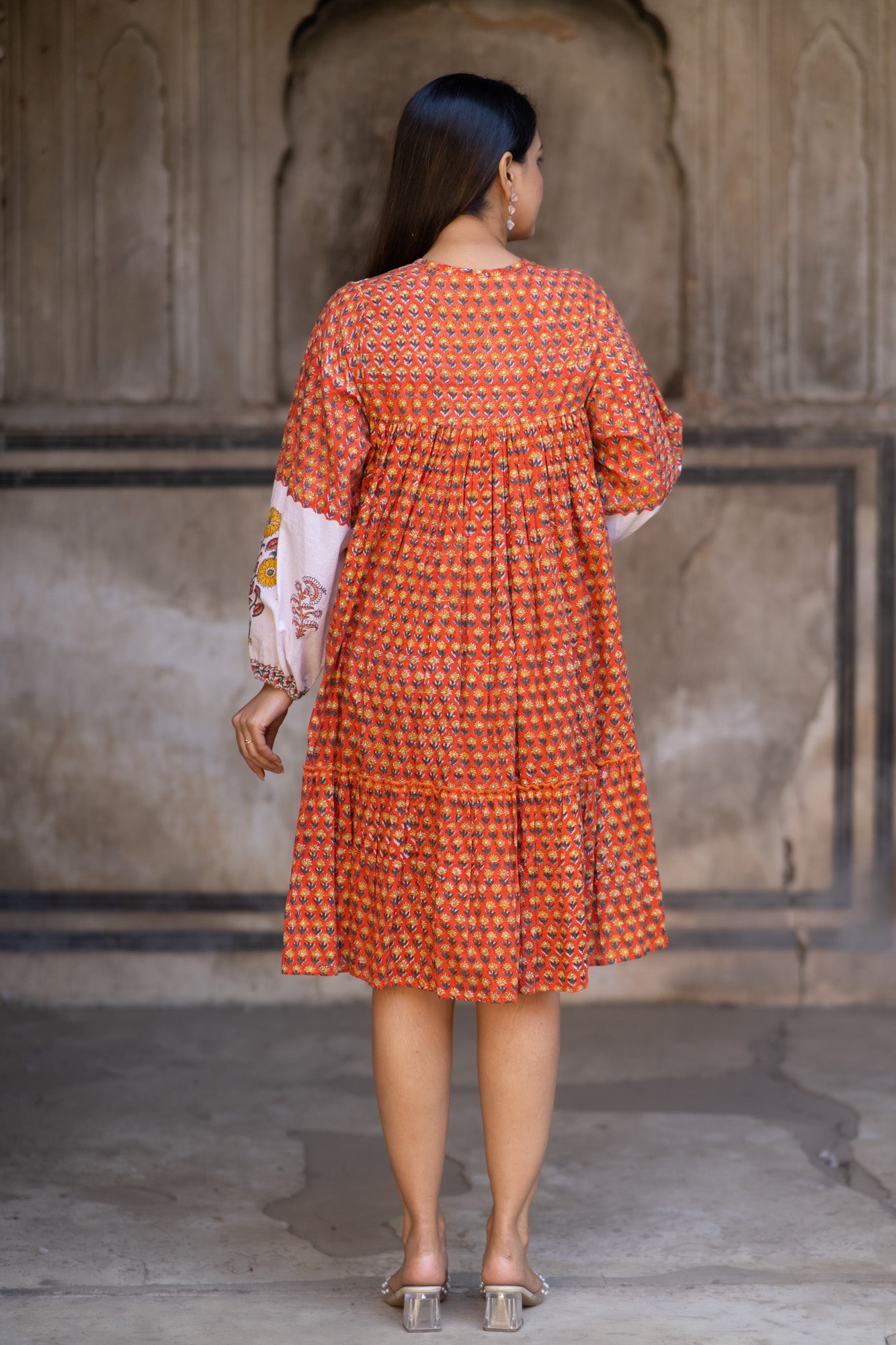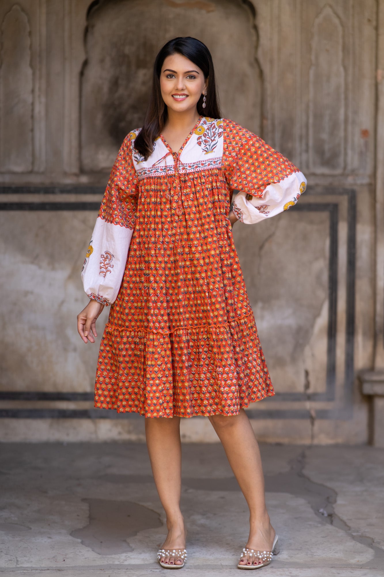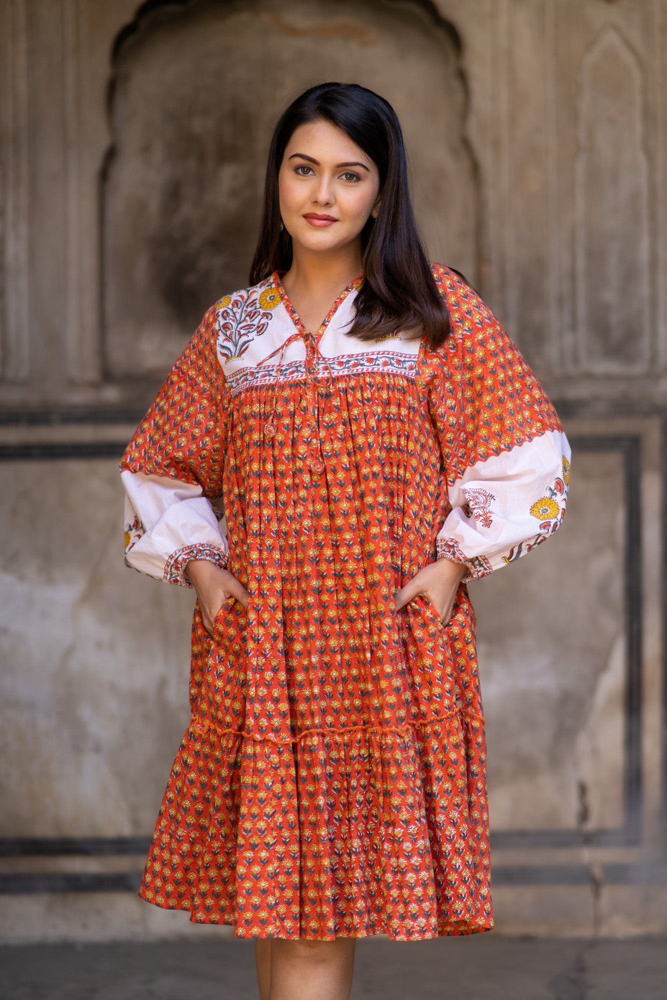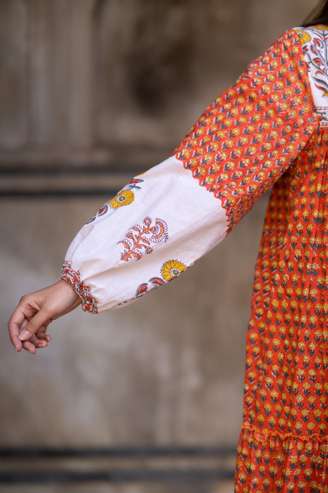 Hand block printed flair dress in orange and green color combination. Balloon sleeves with mughal hand block print adds beauty to the piece.