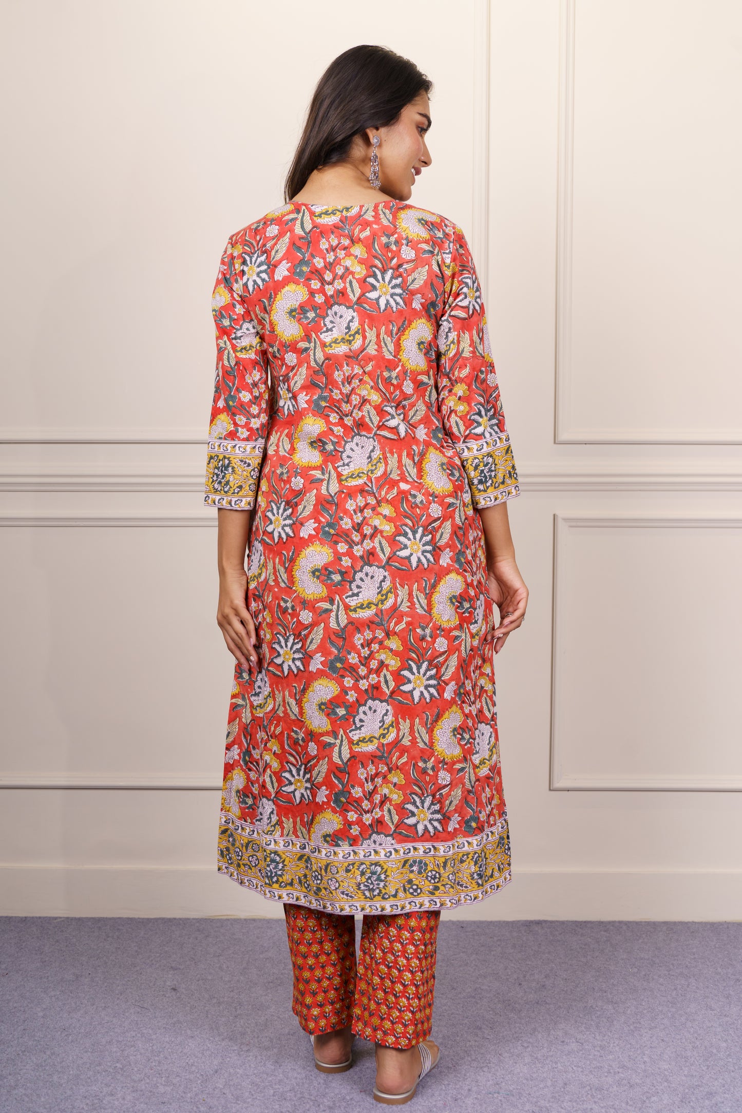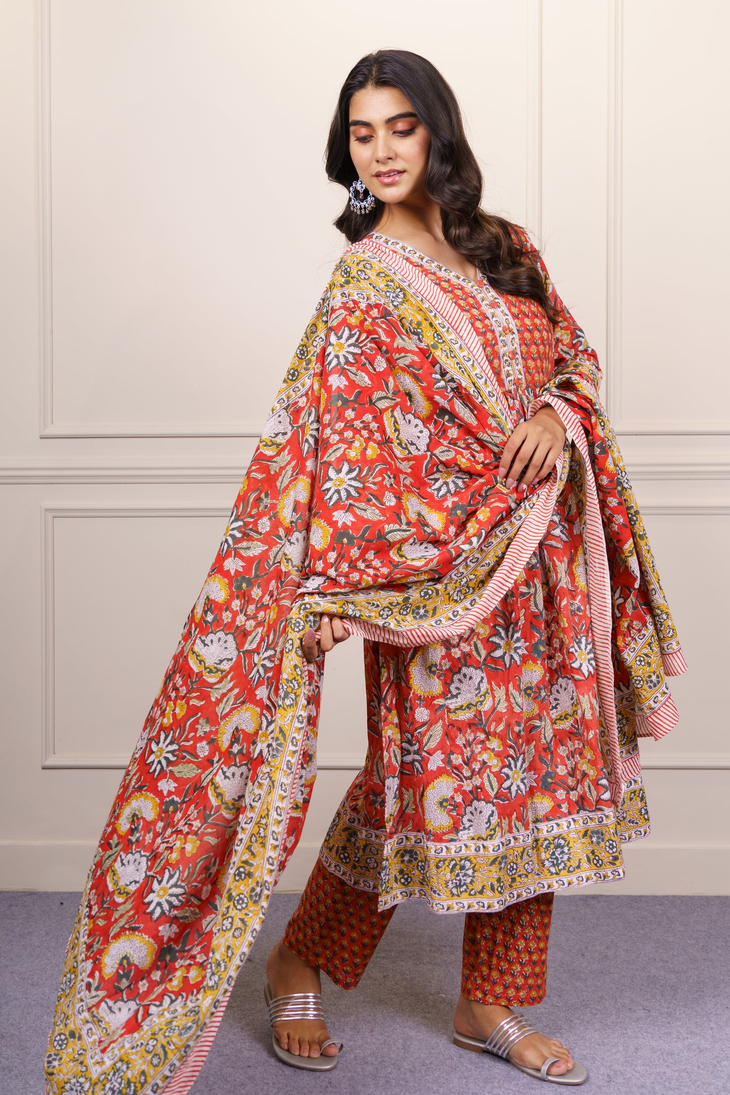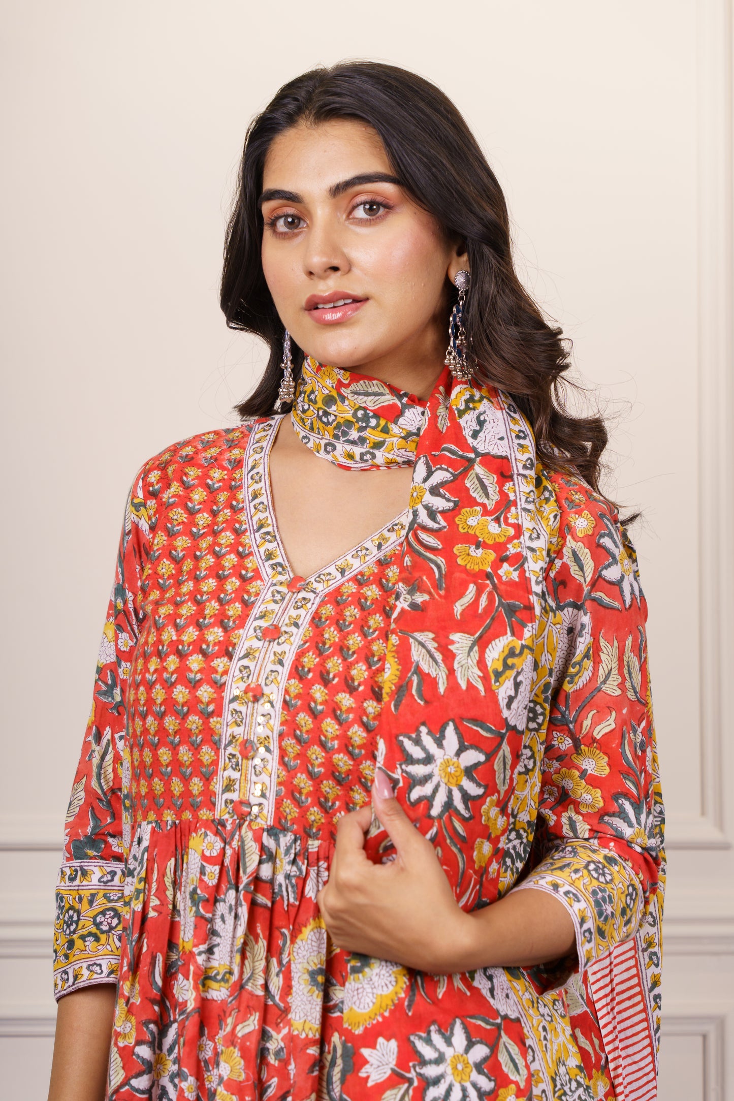This hand block printed kurta with Mulmul cotton Dupatta set in vibrant orange features a flowy A-line kurta paired with a printed bottom. Crafted in soft cotton, it includes a functional pocket in kurta for added ease. A stylish and breathable kurta with bottom perfect for everyday elegance.