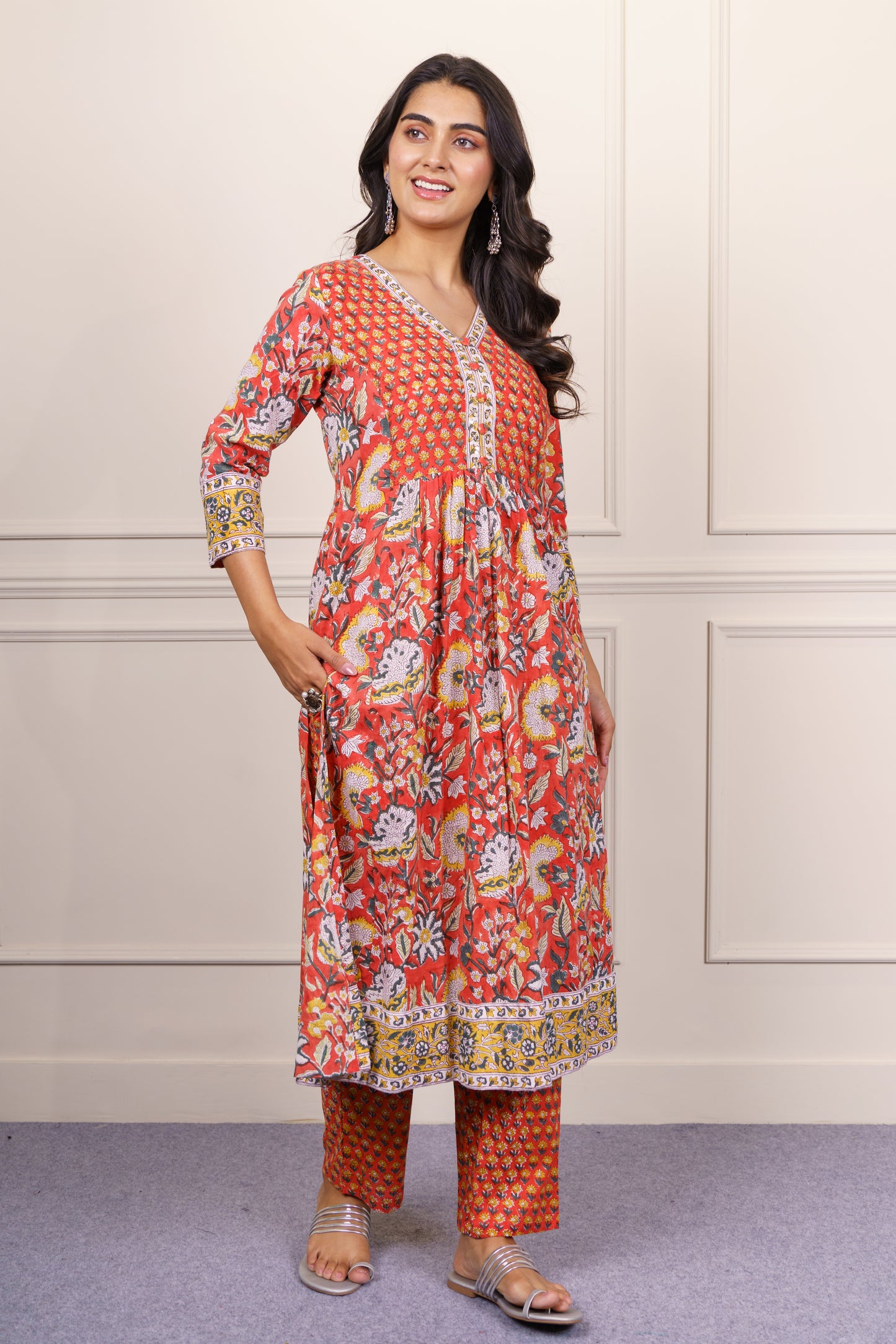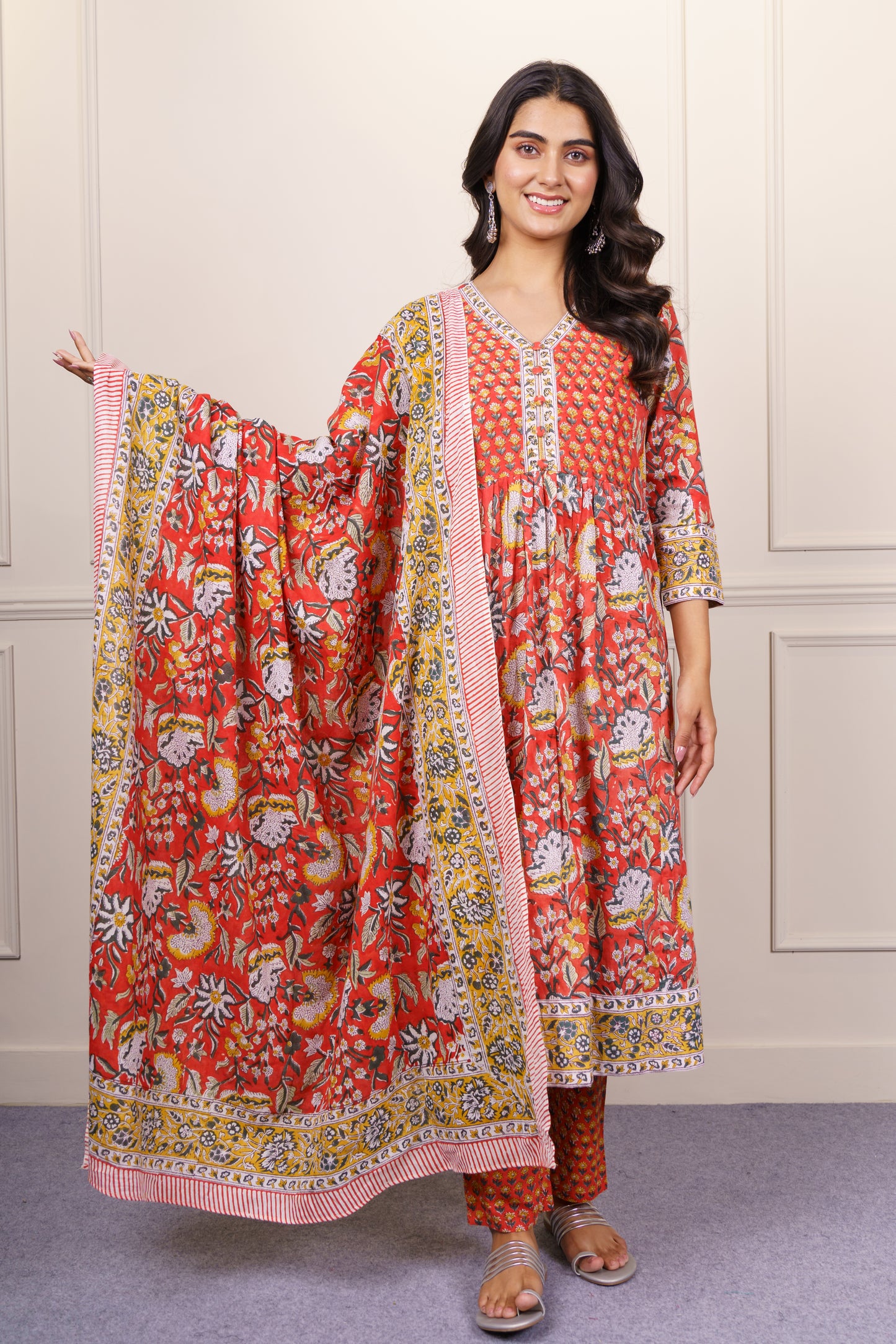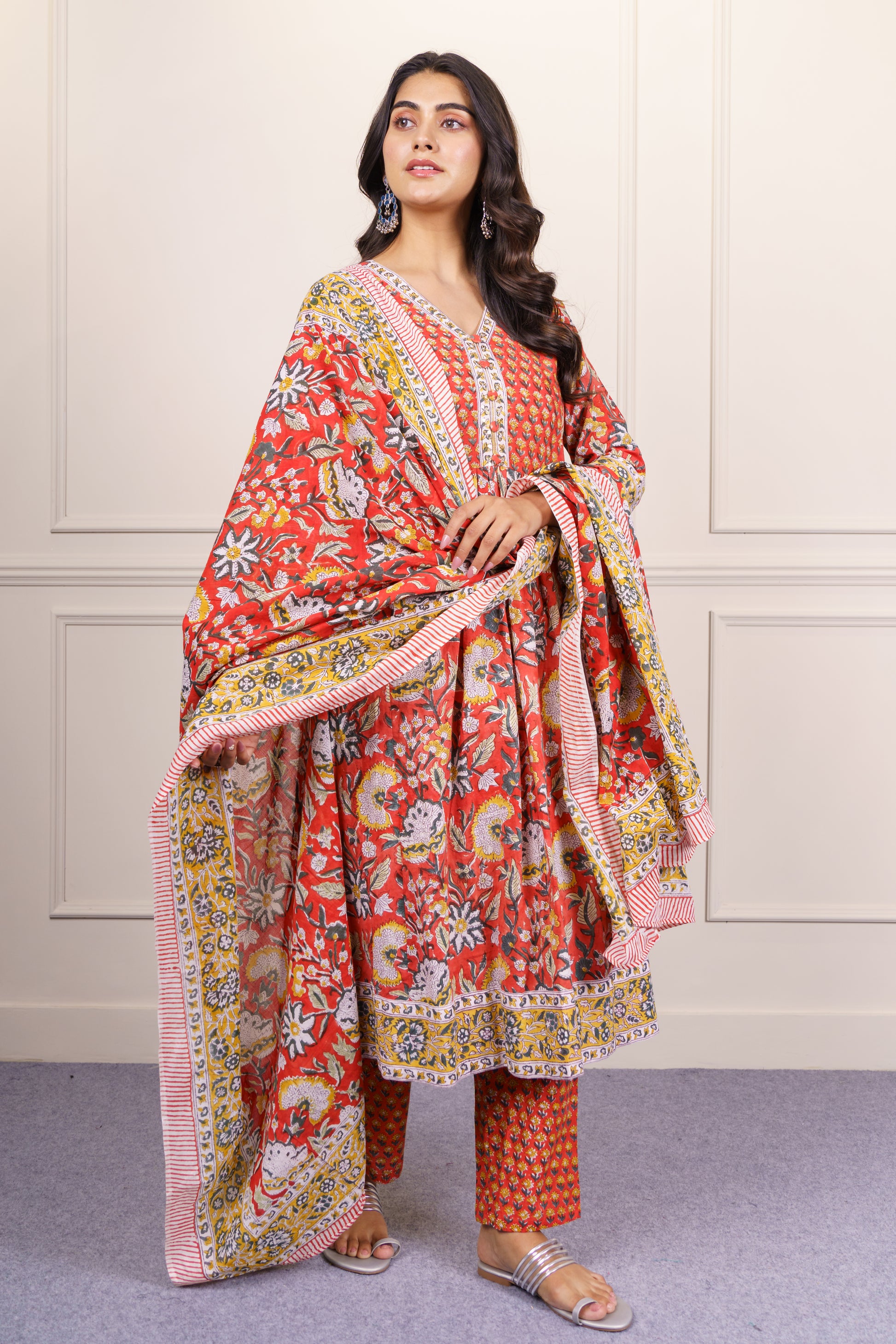 This hand block printed kurta with Mulmul cotton Dupatta set in vibrant orange features a flowy A-line kurta paired with a printed bottom. Crafted in soft cotton, it includes a functional pocket in kurta for added ease. A stylish and breathable kurta with bottom perfect for everyday elegance.
