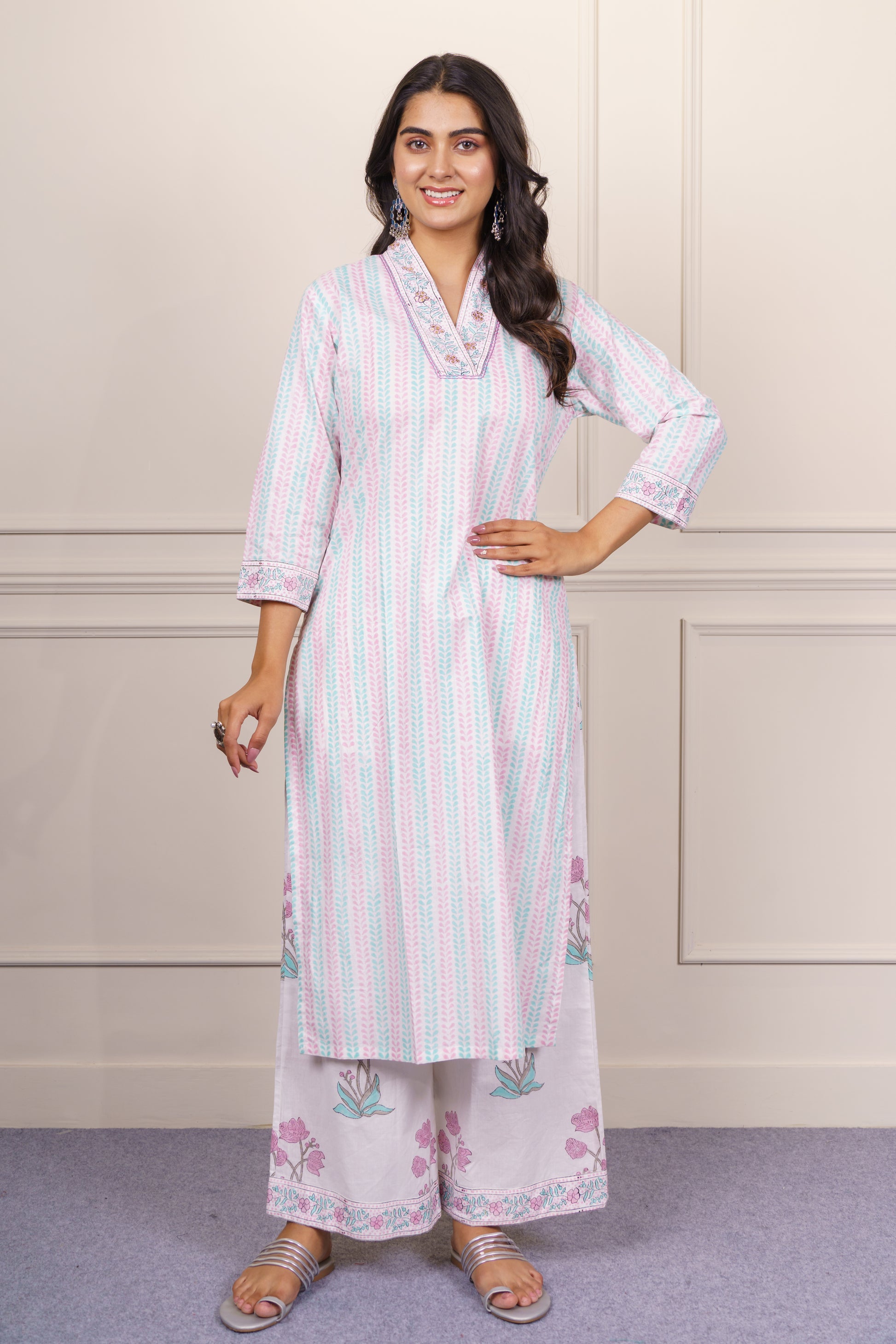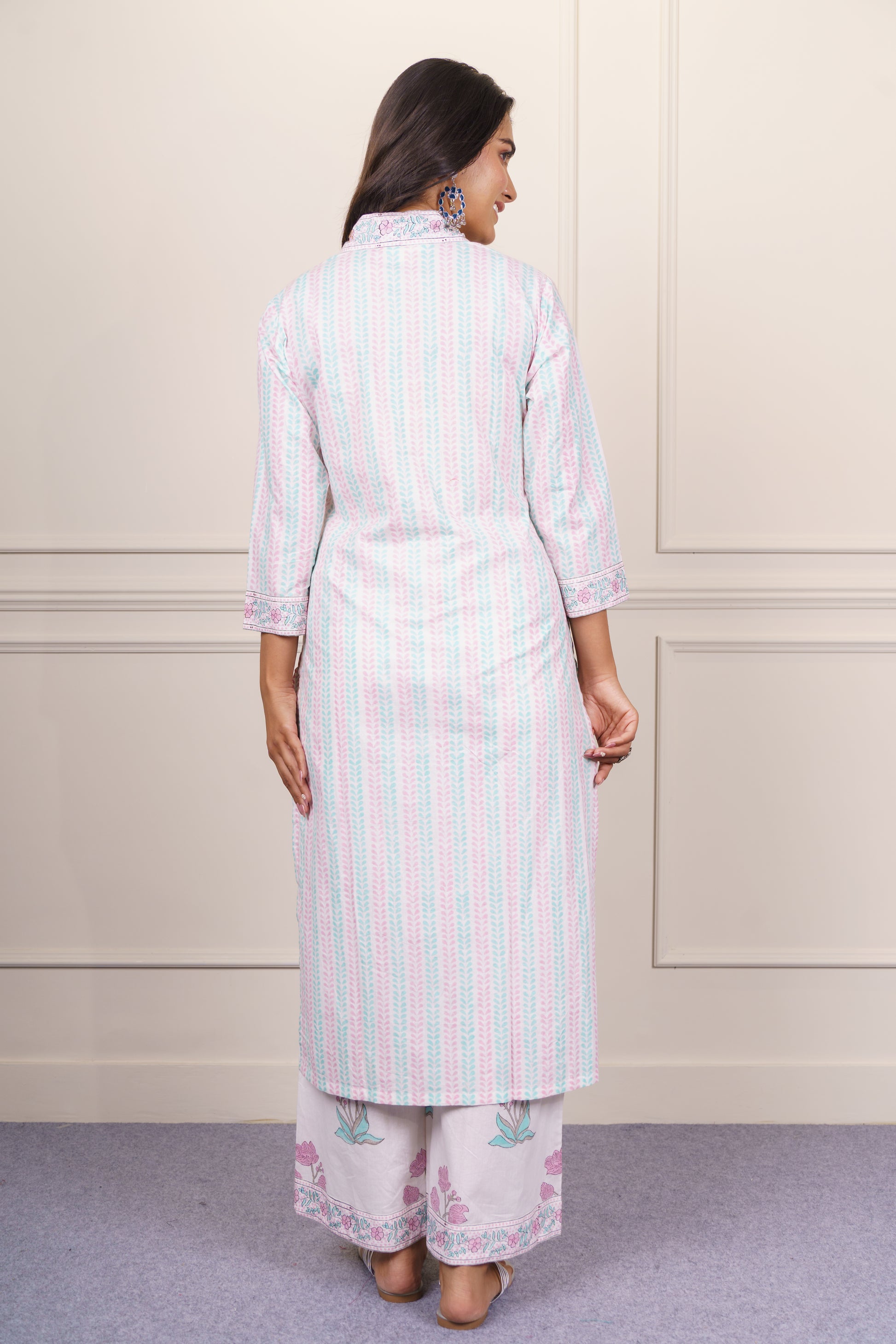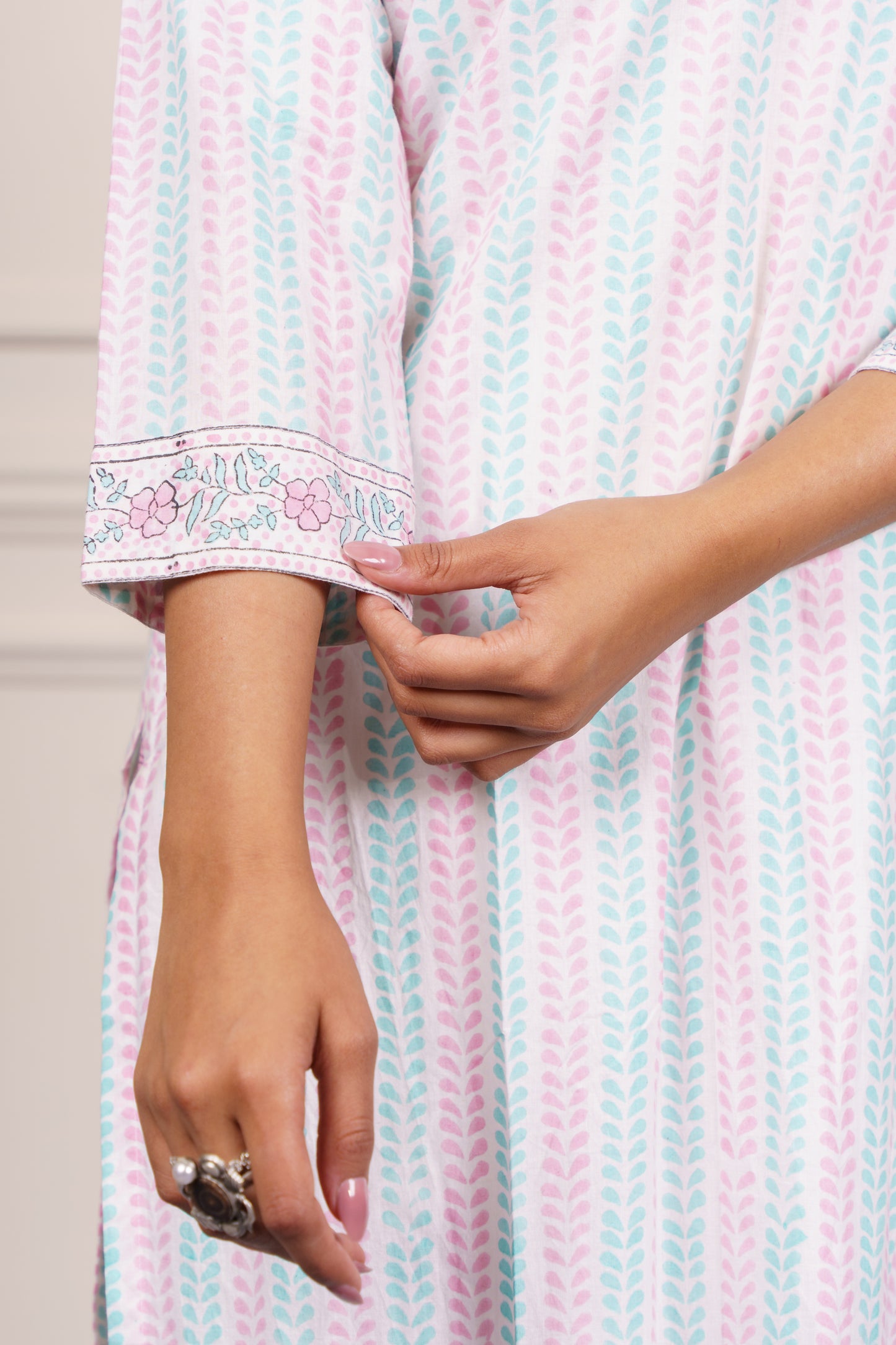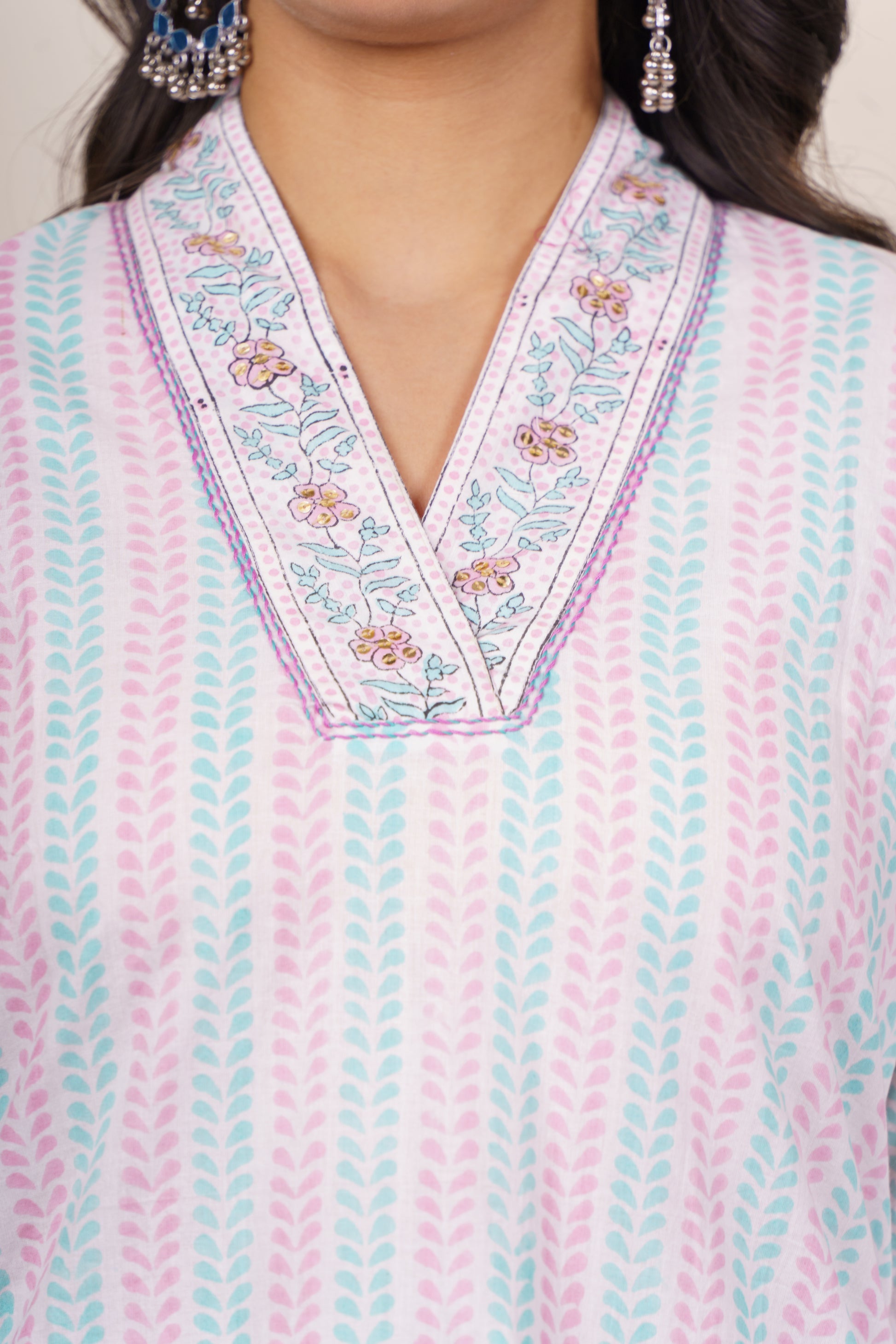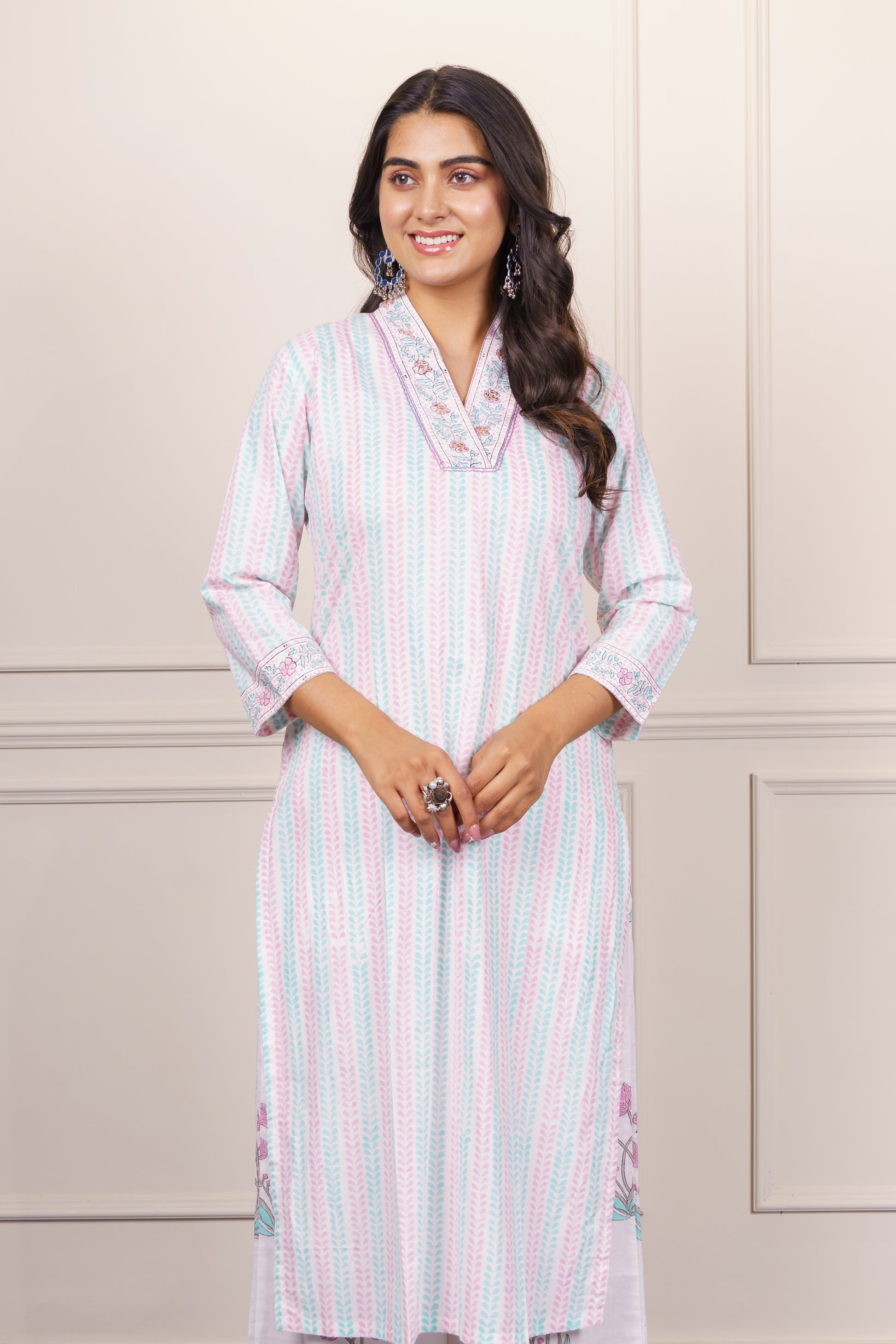 This elegant white cotton kurta features a soft blend of pastel pink and blue in a delicate hand block printed design. The neckline is beautifully adorned with fine floral motifs, adding a graceful charm. Lightweight and breathable, this floral kurta is ideal for everyday elegance and comfortable summer wear.
