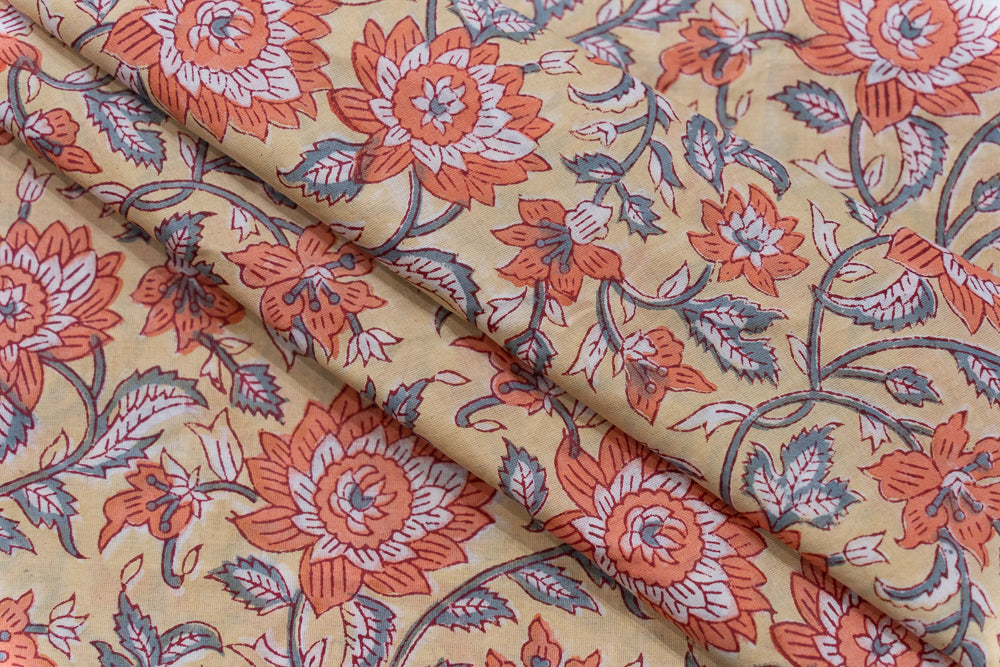 Yellow base with peach floral hand block print on pure cotton fabric.