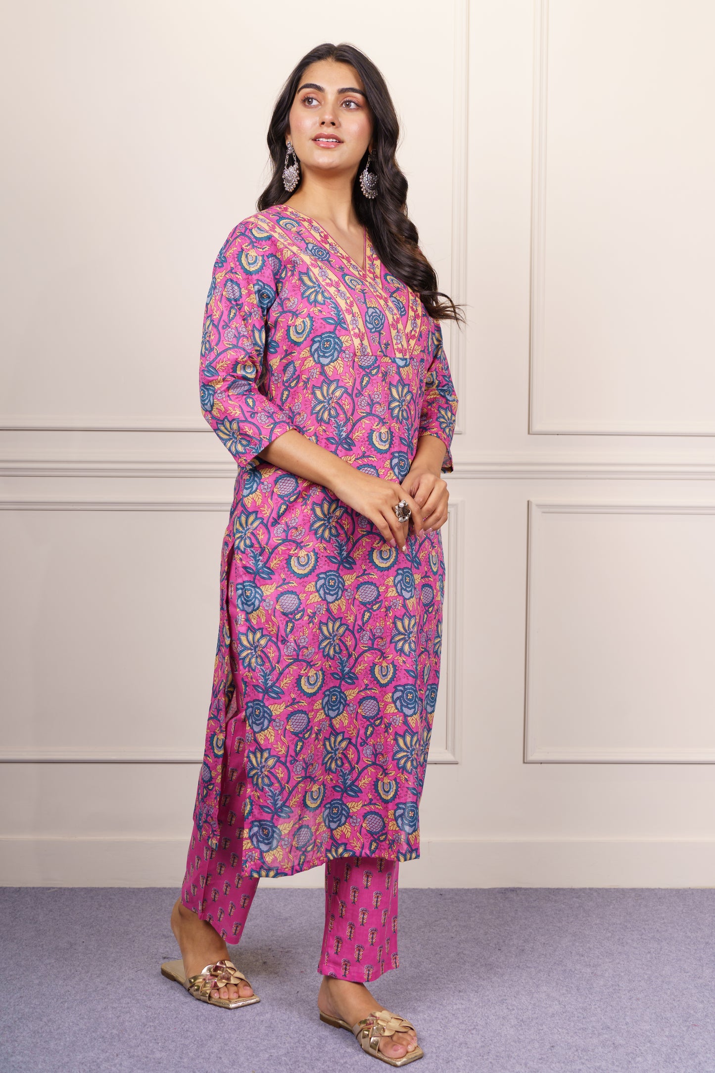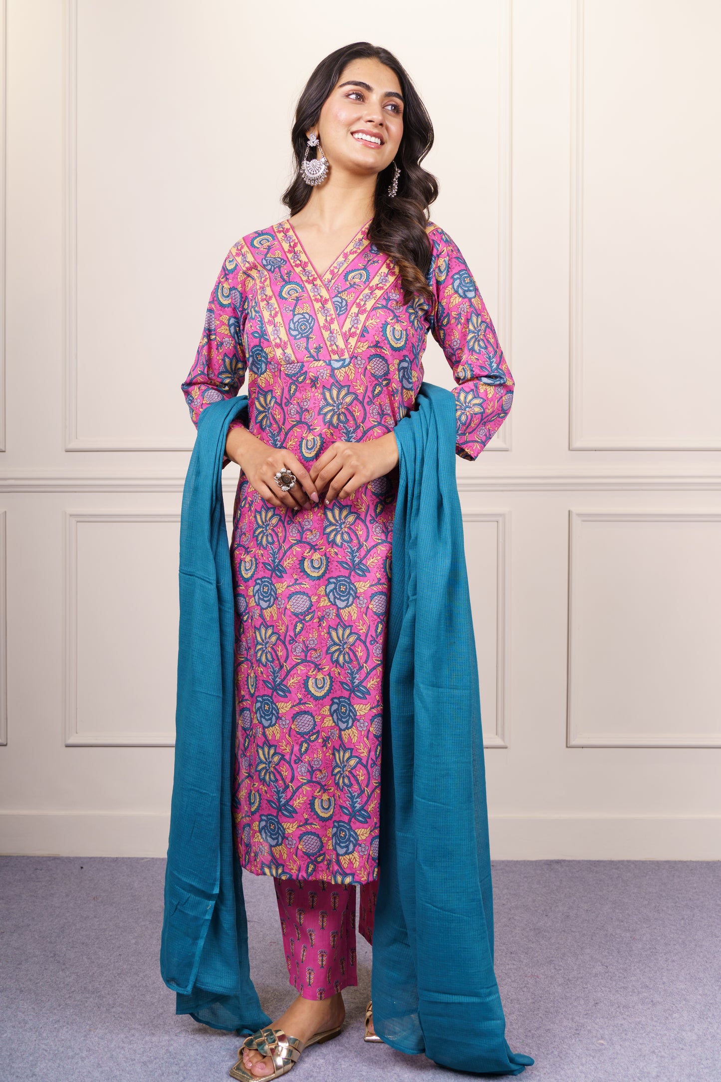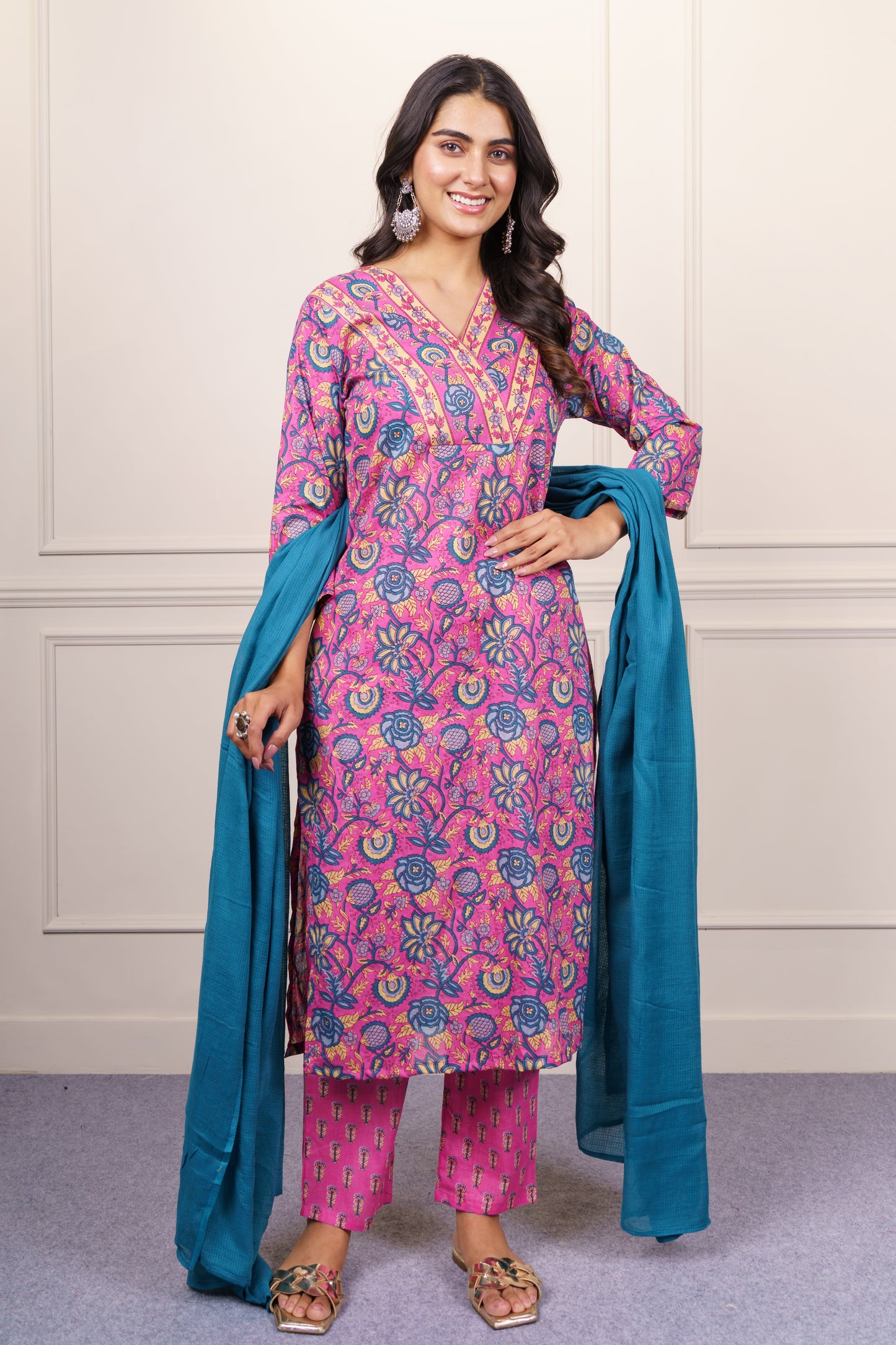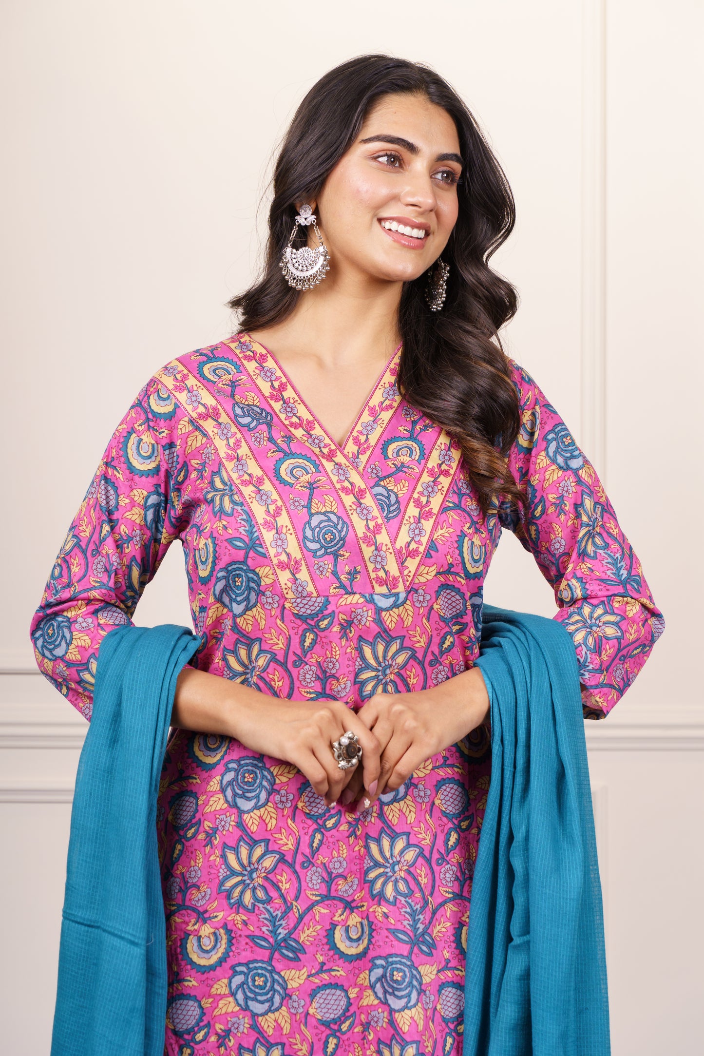 Pink and Blue Floral Cotton Kurta Dupatta Set-KS865
